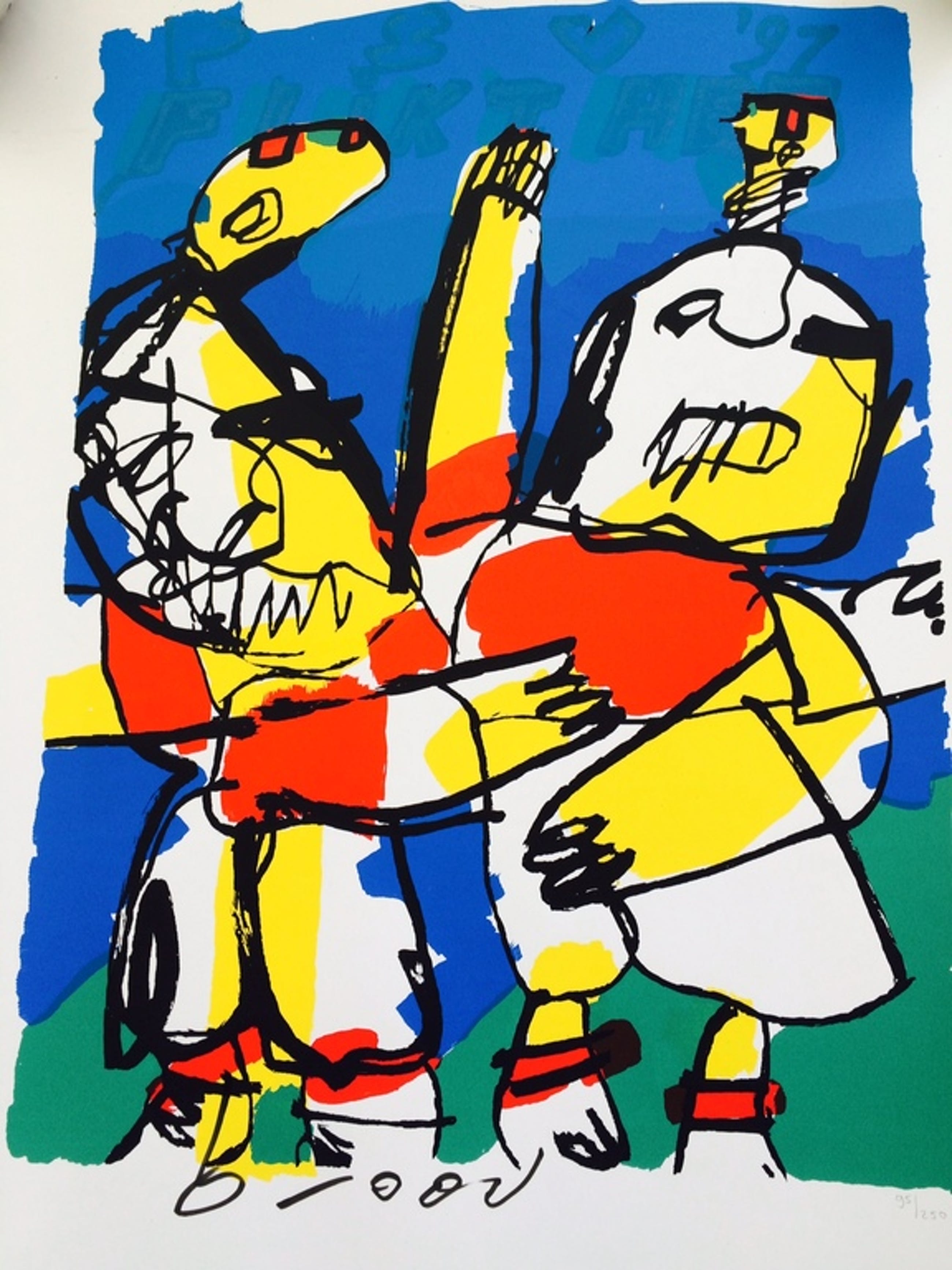 Een schitterende hand gesigneerde zeefdruk van Herman Brood met als titel Voetballertjes. De afmetingen zijn 50cm x 70cm. De zeefdruk is nog nooit ingelijst, waardoor deze meer waard is dan de ingelijste versie en dus 100% origineel. De serie oplage is 250 stuks. Deze zeefdruk is nummer 95 met potlood genummerd. Met een marker is deze zeefdruk zelf door Herman Brood gesigneerd. En, incl. echtheid certificaat! Welke overhandigd wordt bij de aankoop.