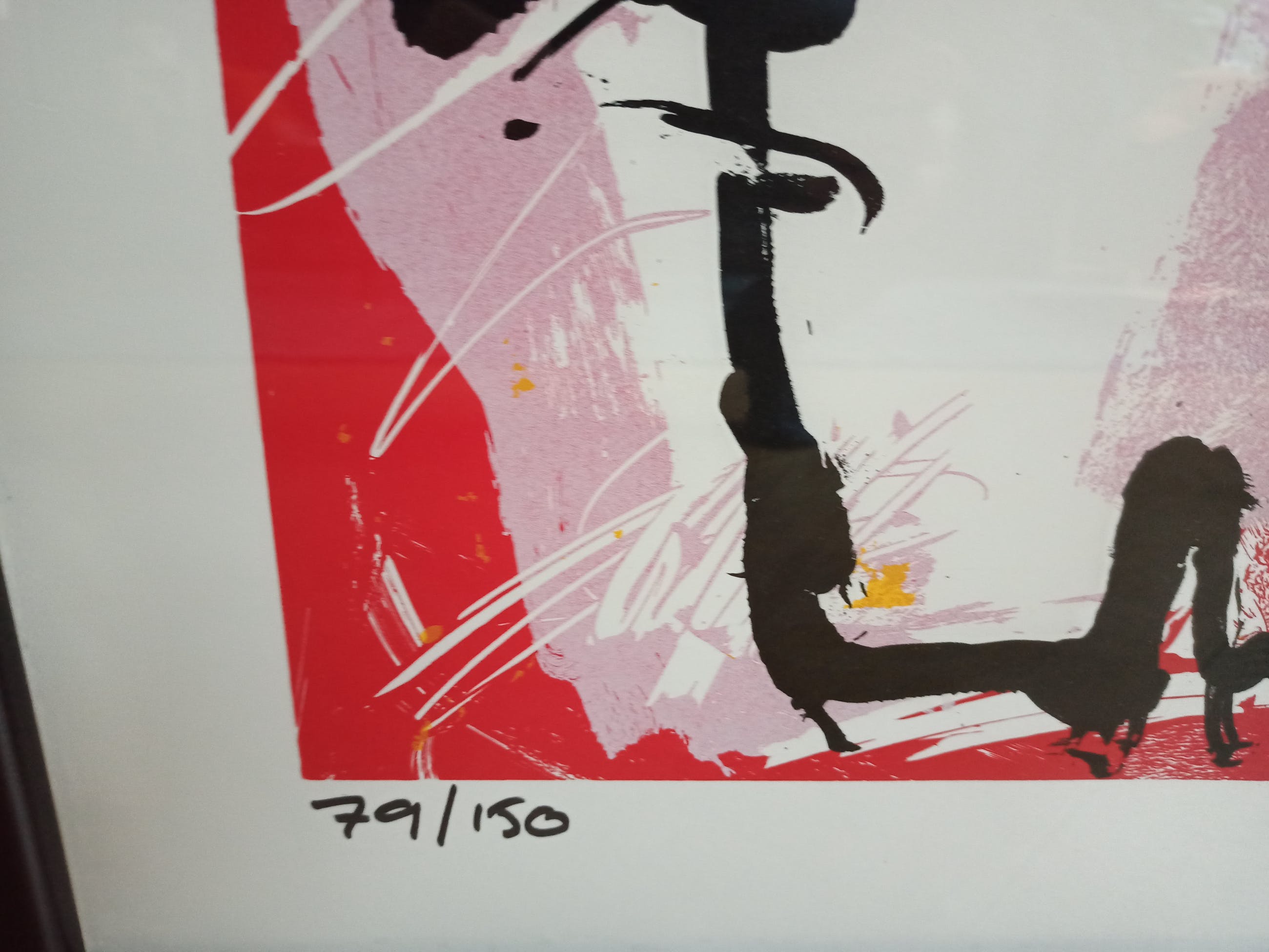 Totale afmetingen zijn 145 x 105 cm. Voorzien van een nette zwarte lijst.