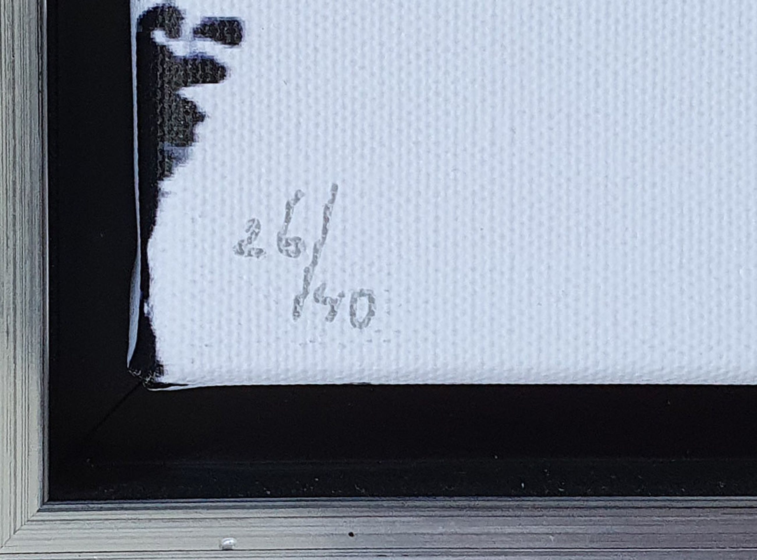 De zeefdruk is professioneel ingelijst in een nieuwe zwart/ zilverkleurige baklijst. Het werk wordt geleverd met een echtheidscertificaat.