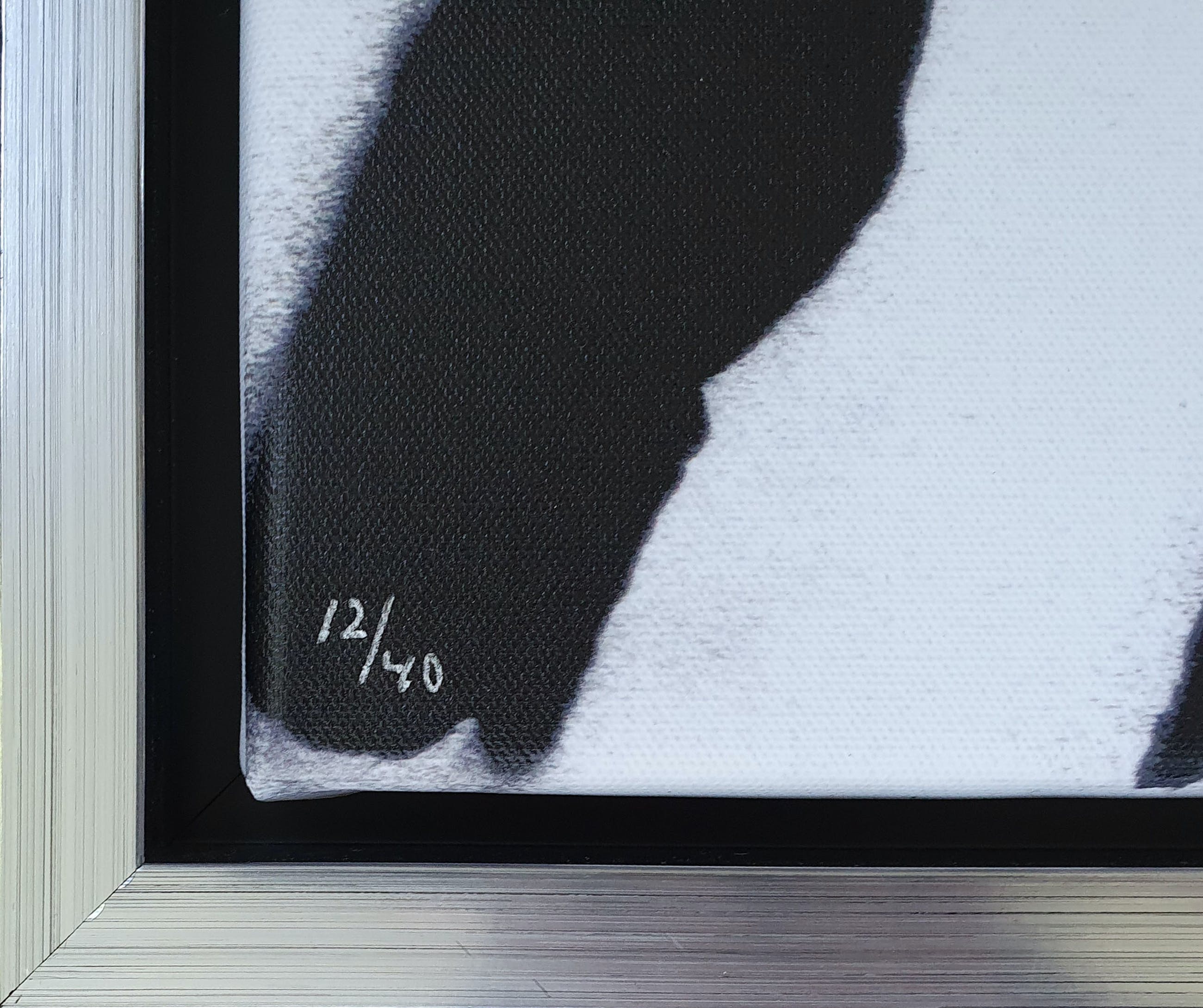 De zeefdruk is professioneel ingelijst in een nieuwe zwart/ zilverkleurige baklijst. Het werk wordt geleverd met een echtheidscertificaat.