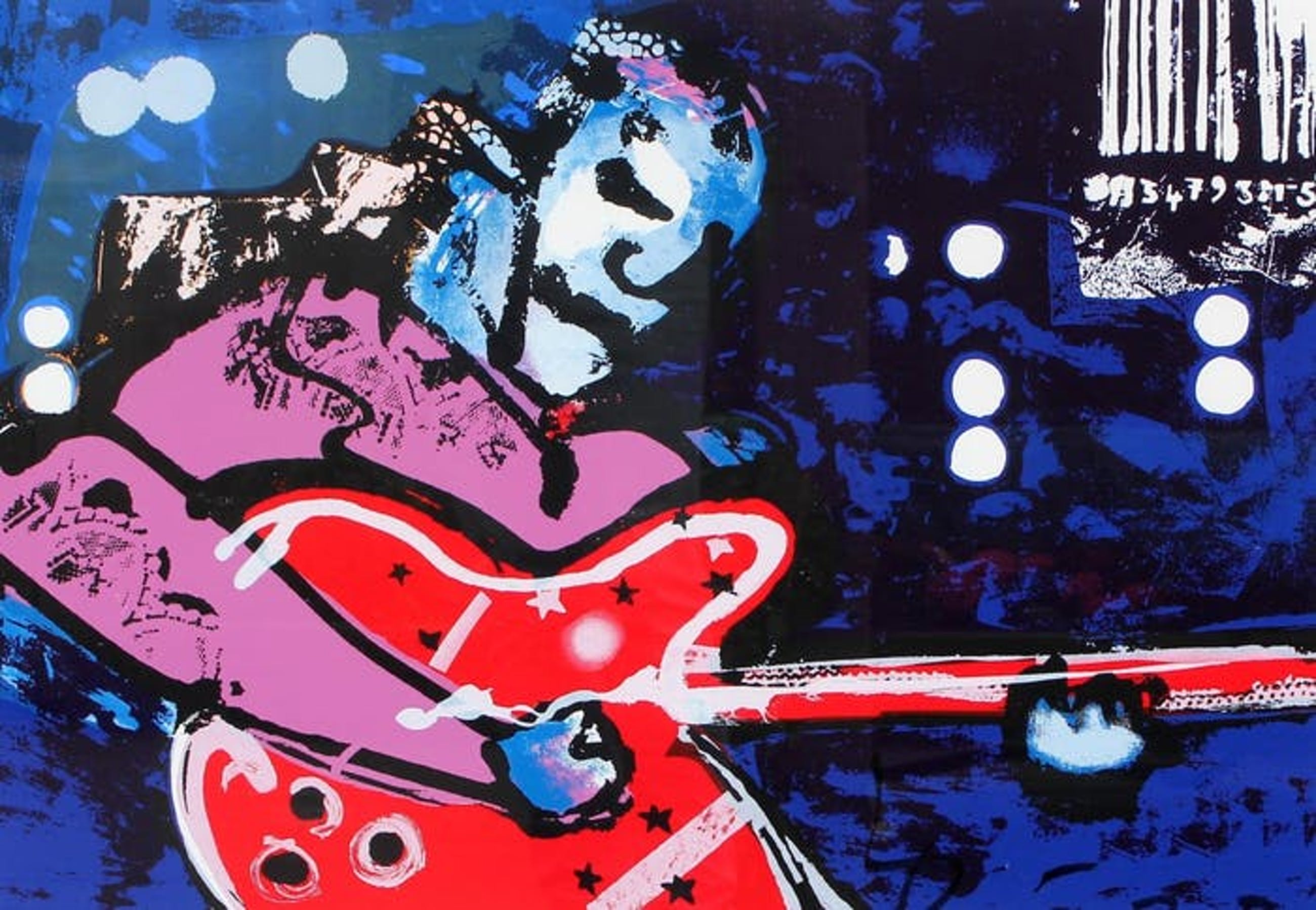 Prachtig ingelijste zeefdruk van Herman Brood. Nummer: 77/100. Titel: Jimmy Hendrix. Afmetingen incl lijst: H84.5 x b103.5cm. Afmetingen voorstelling: H56 x b80 cm. Het werk is rechts onderin gesigneerd door de kunstenaar. De authenticiteit van het, aangeboden werk, wordt volledig gegarandeerd. Een certificaat van echtheid kan, op aanvraag, worden gemaild.