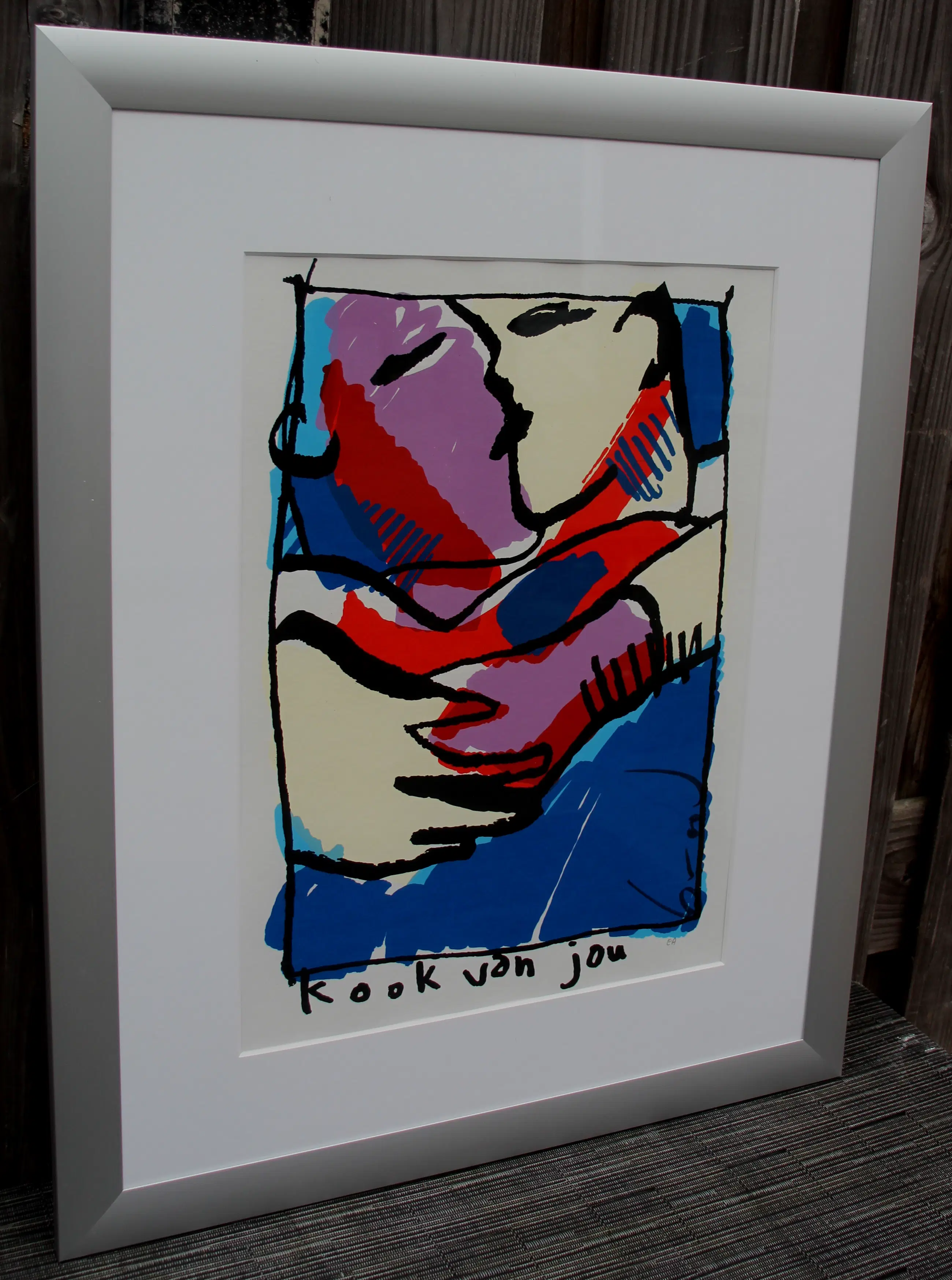 Ingelijste zeefdruk van Herman Brood. Titel: Kook van jou. Afmetingen inclusief lijst: H68.5 x b55.5 cm. Afmetingen voorstelling: H46 x b34cm. . Het werk is rechtsonder gesigneerd door de kunstenaar. De authenticiteit van het aangeboden werk wordt volledig gegarandeerd. Een certificaat van echtheid kan, op aanvraag, worden gemaild.