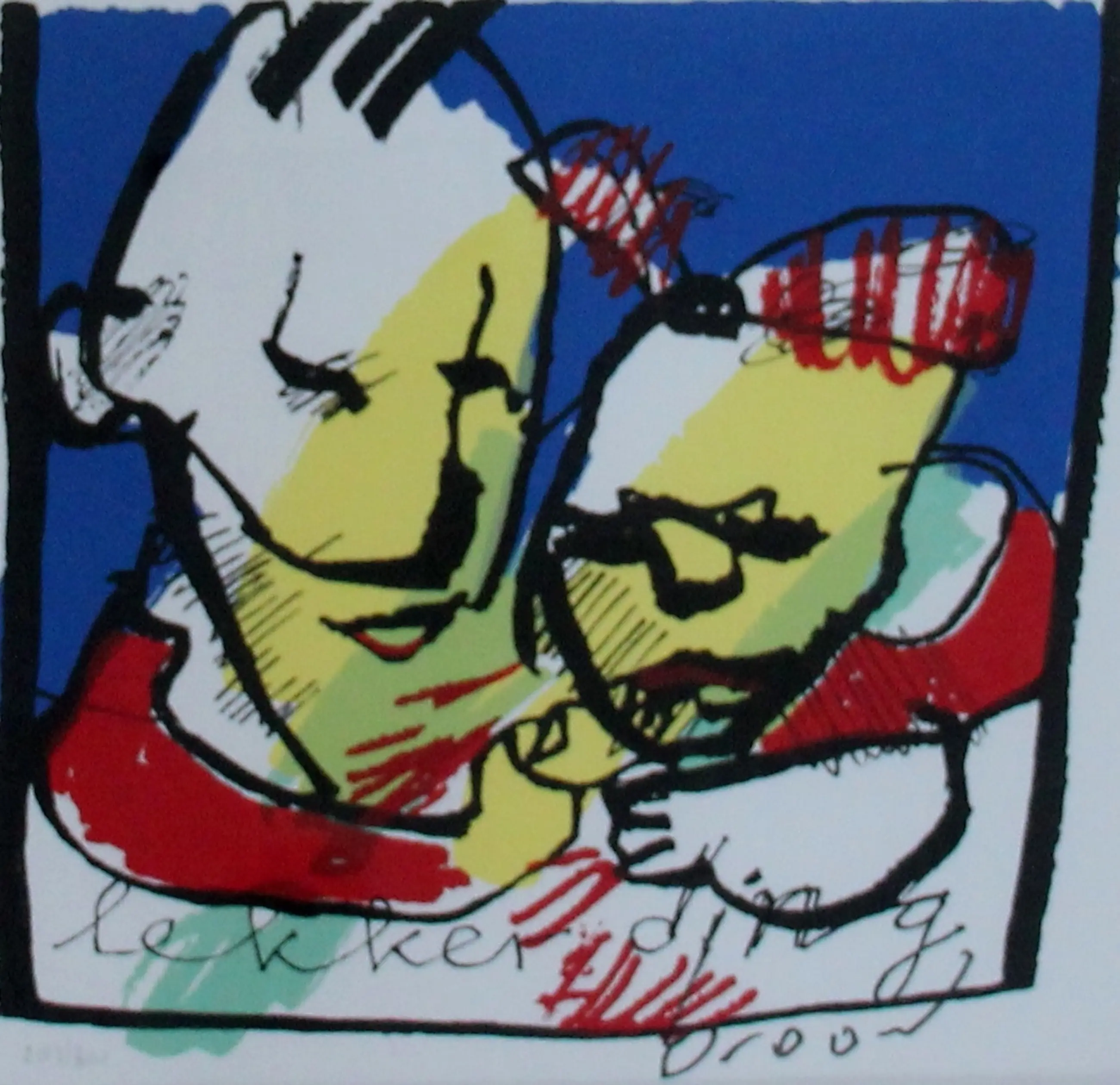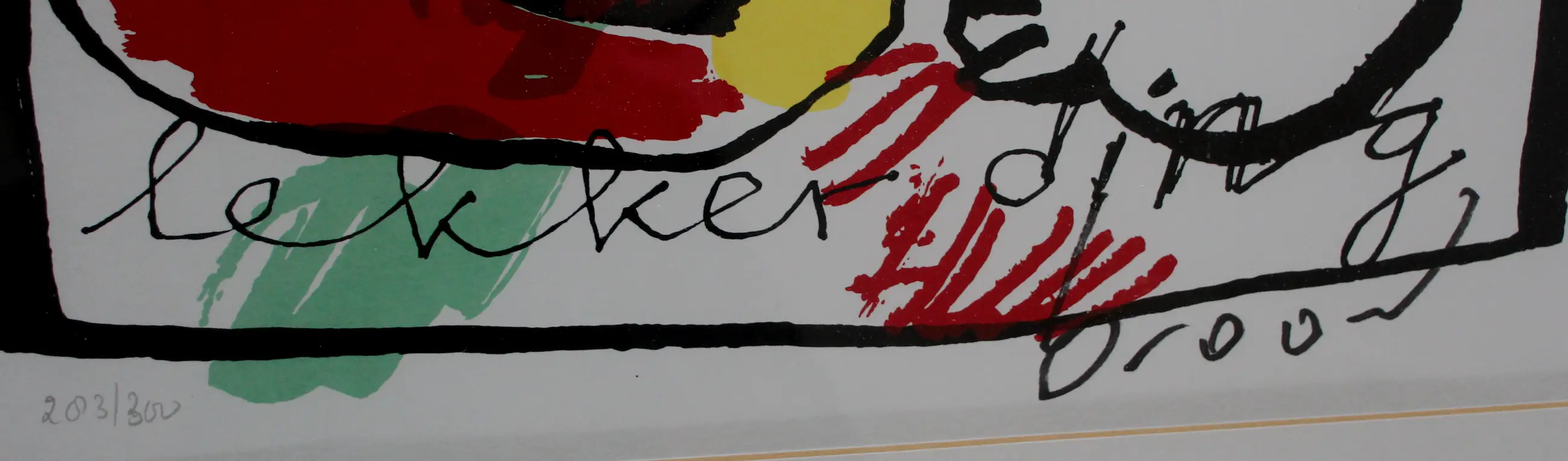 Ingelijste zeefdruk van Herman Brood. Titel: "Lekker ding". Oplage: 283/300. Afmetingen incl lijst: H61.5 x b81.5cm. Afmetingen voorstelling: H34 x b35cm. Het werk is rechts onderaan, gesigneerd door de kunstenaar. De authenticiteit van het aangeboden werk wordt volledig gegarandeerd. Een certificaat van echtheid kan, op aanvraag, worden gemaild.