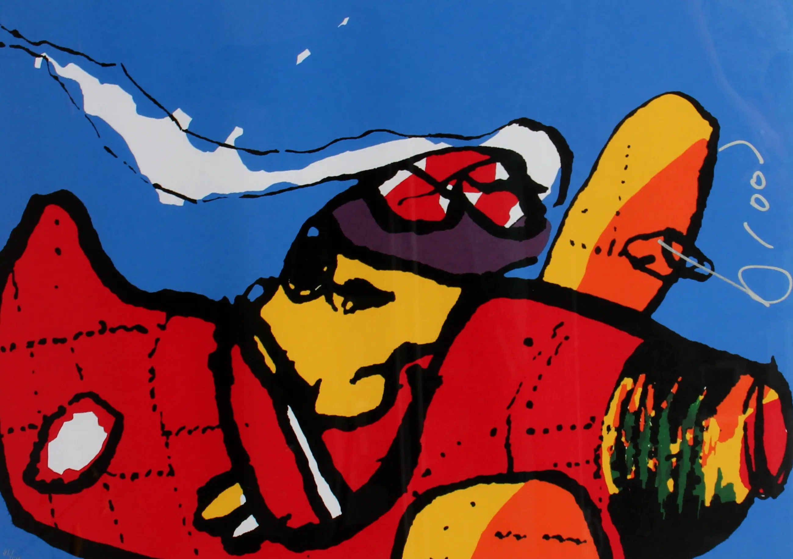 Ingelijste zeefdruk van Herman Brood. Titel: Red Baron. Nummer: 86/175. Afmetingen incl lijst: H78 x b99cm. Afmetingen voorstelling: H50 x b70cm. Het werk is onderaan, gesigneerd, door de kunstenaar. De authenticiteit van het werk wordt volledig gegarandeerd. Een certificaat van echtheid kan , op aanvraag, worden gemaild.