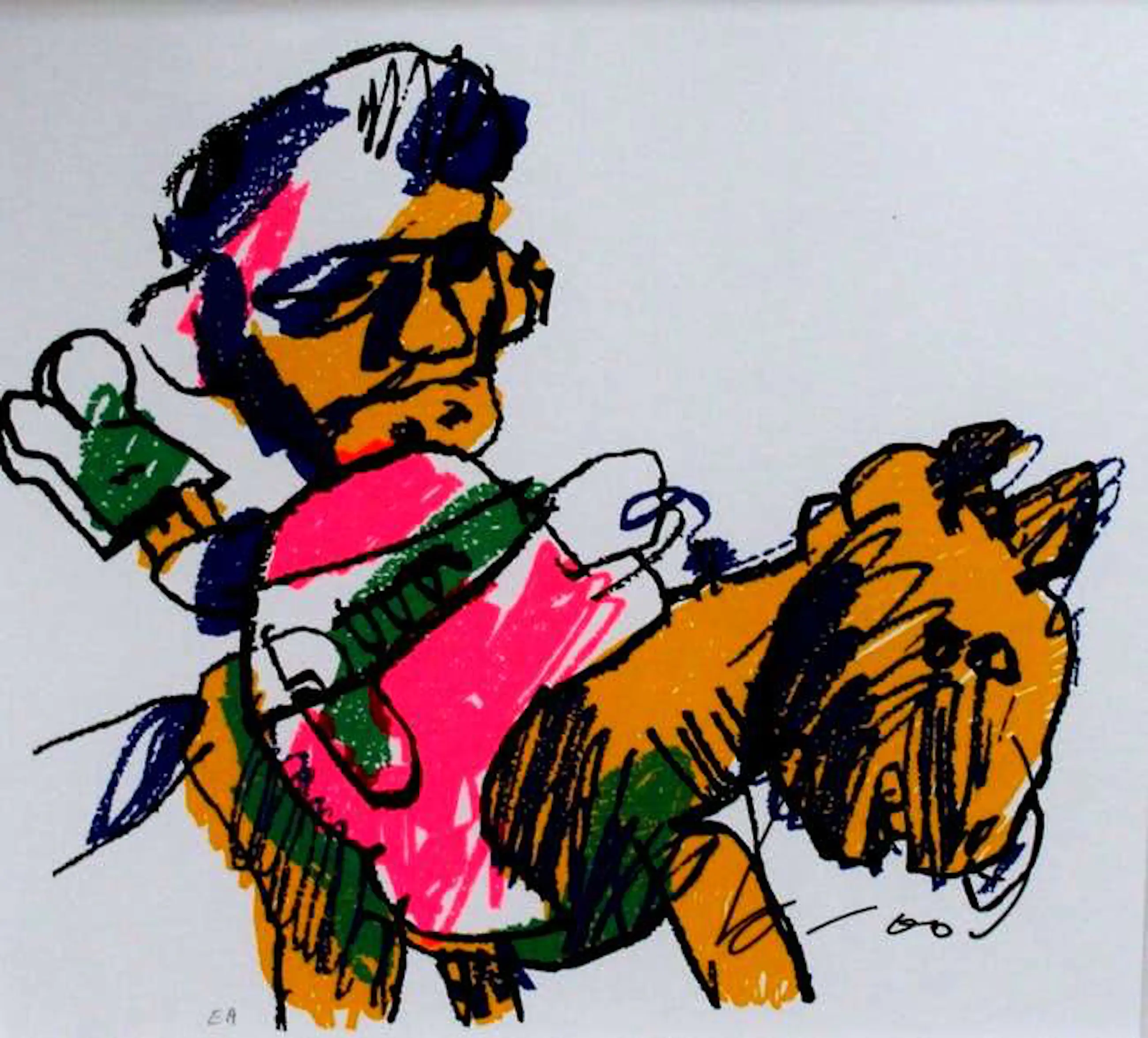 Ingelijste zeefdruk van Herman Brood. Titel: Stokpaardje. Nummer: E.A. Afmetingen incl lijst: H81 x b83cm. Afmetingen voorstelling: H51 x b55cm. Het werk zit keurig ingelijst, voorzien van verdiept passe - partout. Het werk kan zo thuis aan de muur!