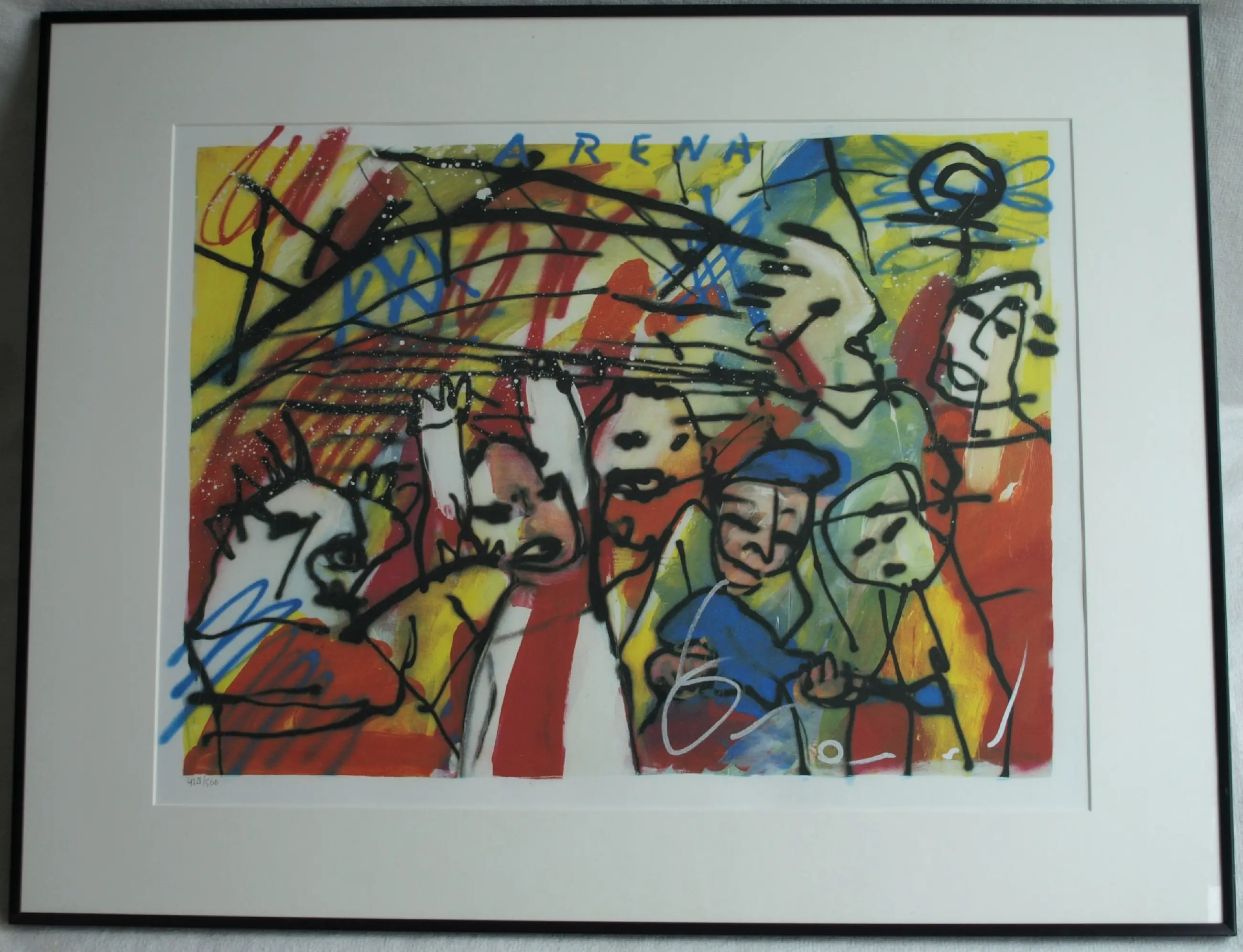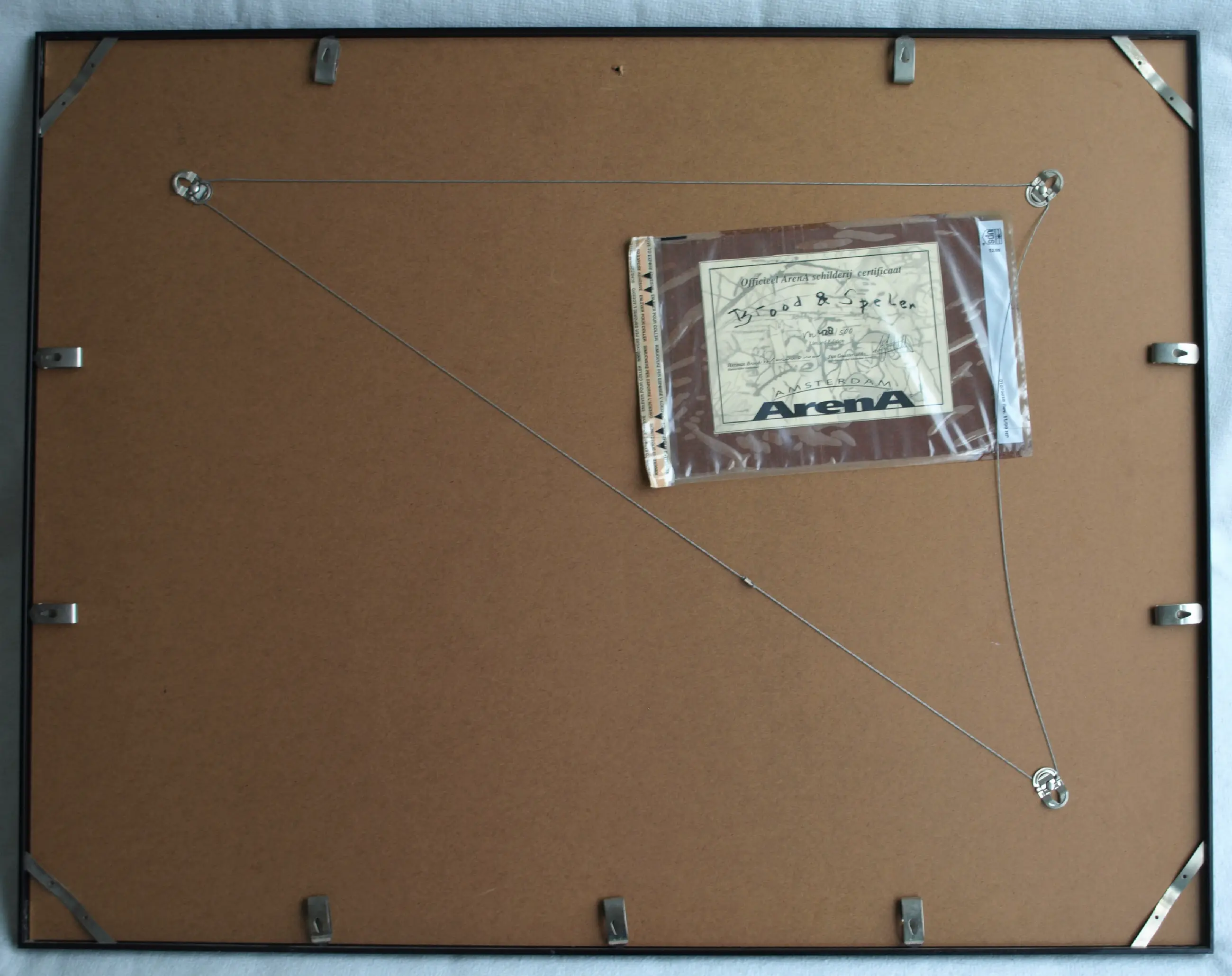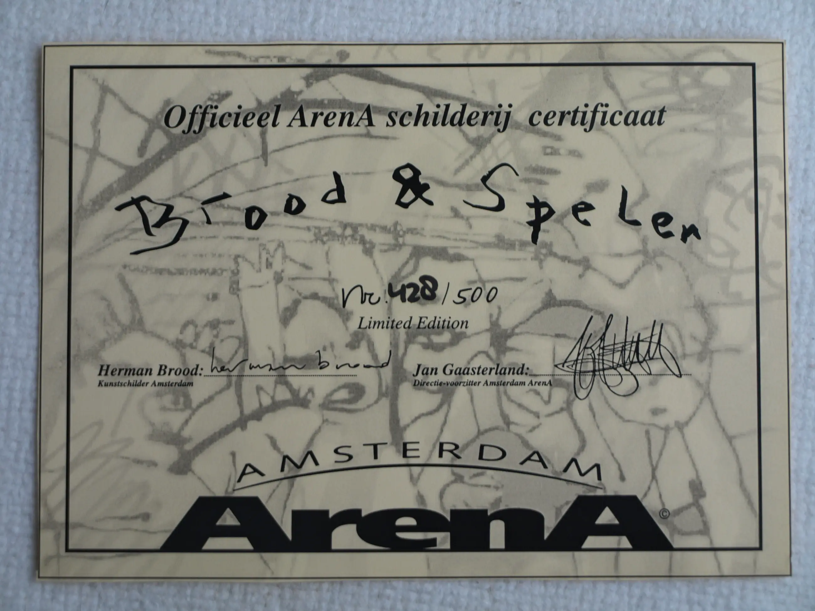 Een grote ingelijste zeefdruk uit ca. 1996 van de Nederlandse kunstenaar en popartiest Herman Brood (1946-2001). -Handgesigneerd met zilverstift door Herman Brood en genummerd met potlood: nr. 428 van 500, Limited Edition. -Ingelijst in de originele zwarte aluminium lijst met passe-partout en glasplaat. Kan zo aan de muur. -Afmetingen: Lijst, 71 x 91 x 2 cm. Beeld, ca. 51 x 68 cm. -Herkomst: Uitgegeven door ‘Brood & Spelen’, ArenA Amsterdam. Bij de zeefdruk zit een genummerd certificaat (nr. 428) met daarop de gedrukte signaturen van Herman Brood en van Jan Gaasterland (zie de 3 laatste foto’s). Jan Gaasterland (1942-2008) was van 1994 tot 2000 directievoorzitter van de ArenA. De zeefdruk zal dus uit die periode zijn. -Conditie: De zeefdruk en het passe-partout zijn in zeer goede staat. De zwarte aluminium lijst heeft slijtplekjes. Zie ook de foto’s. Kan zo aan de muur.