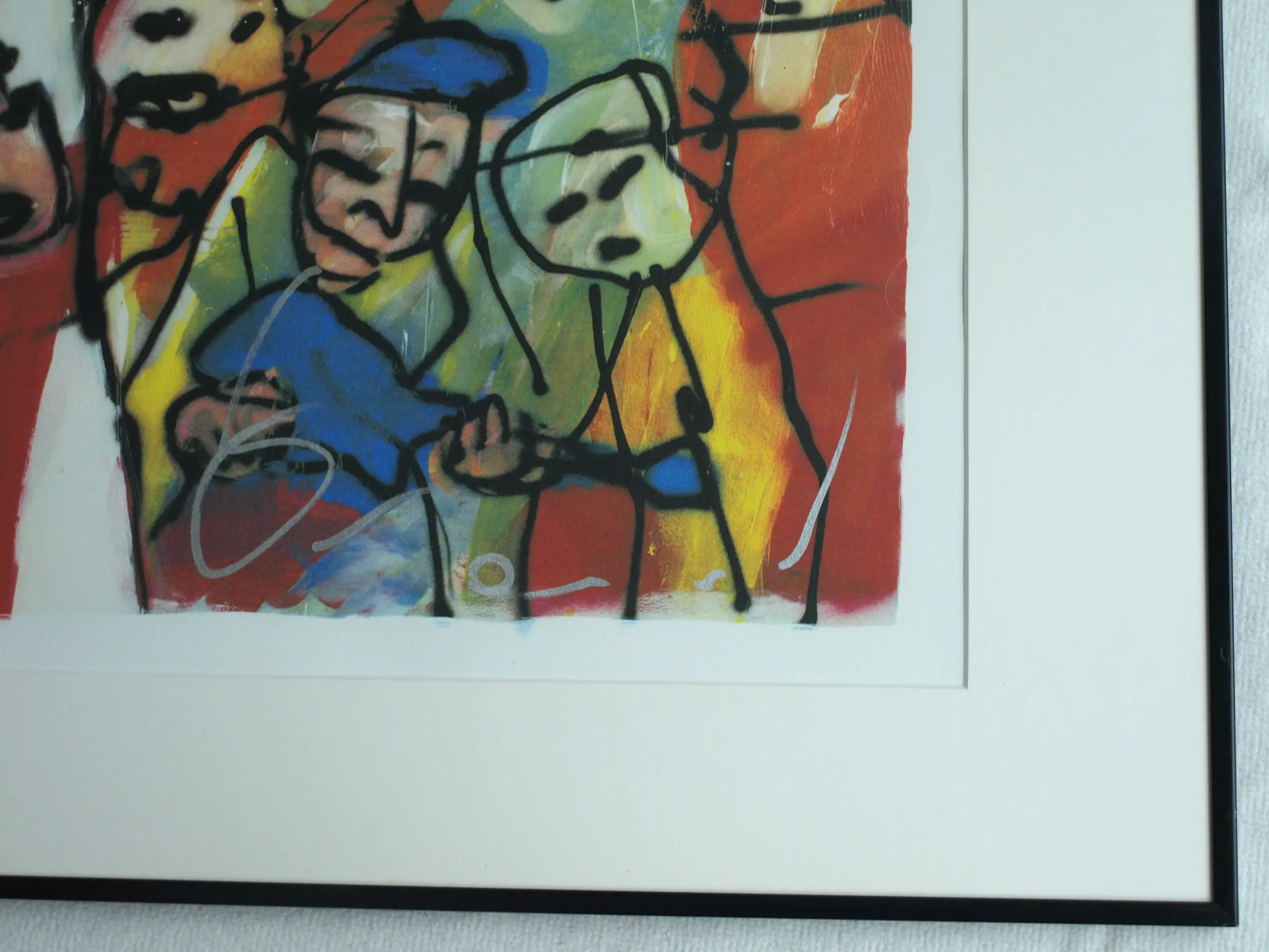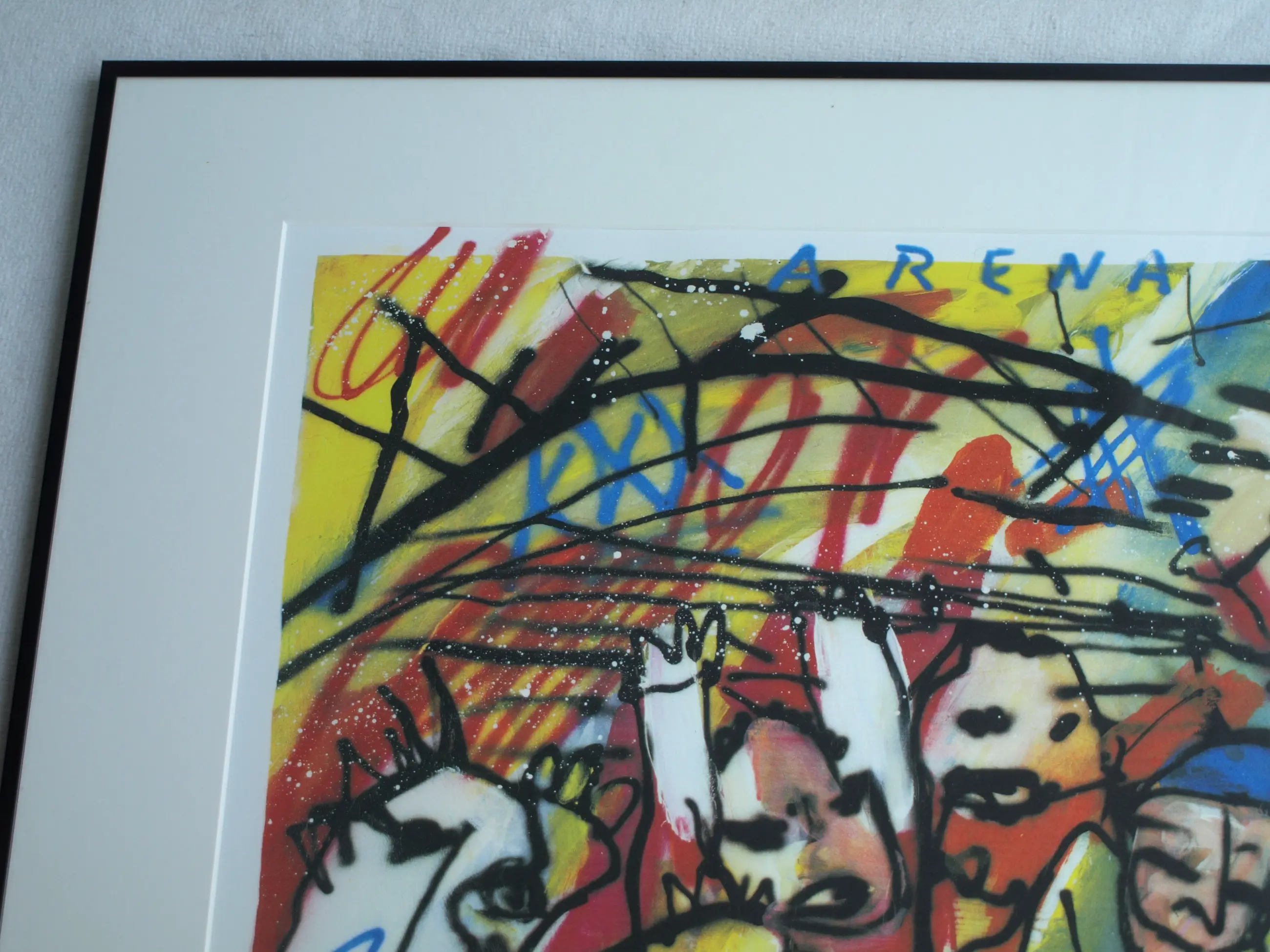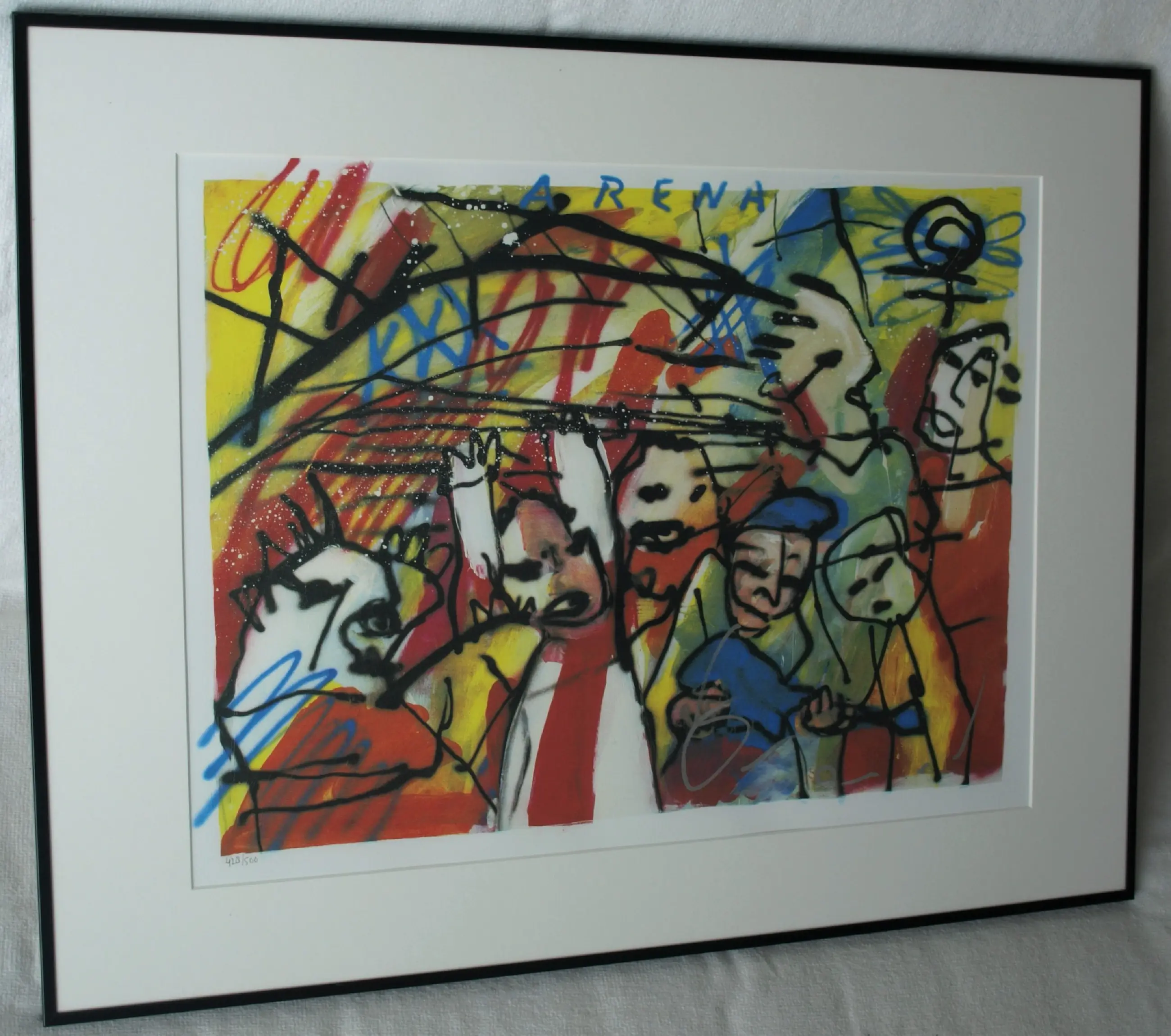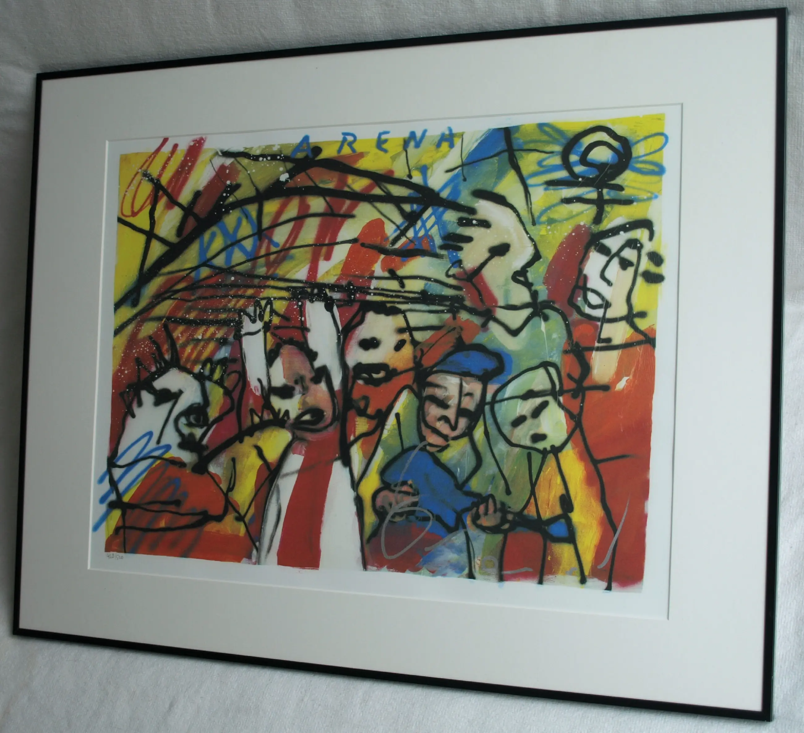 Een grote ingelijste zeefdruk uit ca. 1996 van de Nederlandse kunstenaar en popartiest Herman Brood (1946-2001). -Handgesigneerd met zilverstift door Herman Brood en genummerd met potlood: nr. 428 van 500, Limited Edition. -Ingelijst in de originele zwarte aluminium lijst met passe-partout en glasplaat. Kan zo aan de muur. -Afmetingen: Lijst, 71 x 91 x 2 cm. Beeld, ca. 51 x 68 cm. -Herkomst: Uitgegeven door ‘Brood & Spelen’, ArenA Amsterdam. Bij de zeefdruk zit een genummerd certificaat (nr. 428) met daarop de gedrukte signaturen van Herman Brood en van Jan Gaasterland (zie de 3 laatste foto’s). Jan Gaasterland (1942-2008) was van 1994 tot 2000 directievoorzitter van de ArenA. De zeefdruk zal dus uit die periode zijn. -Conditie: De zeefdruk en het passe-partout zijn in zeer goede staat. De zwarte aluminium lijst heeft slijtplekjes. Zie ook de foto’s. Kan zo aan de muur.