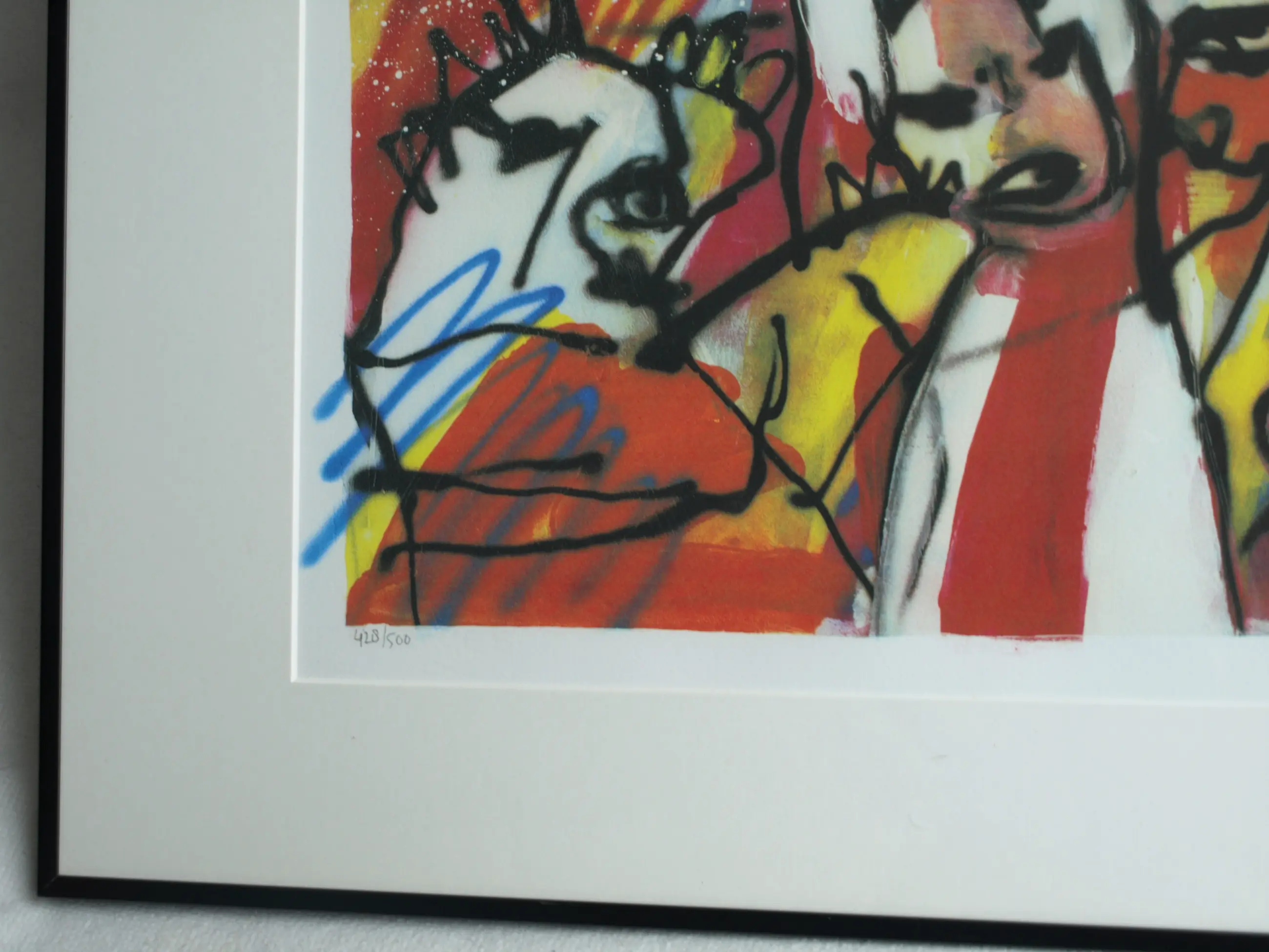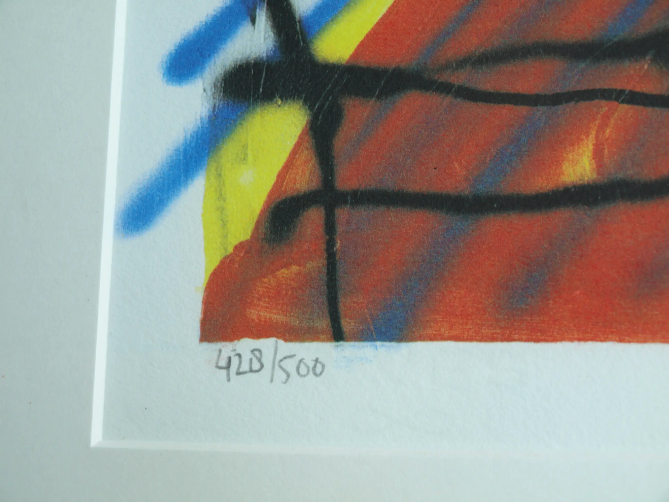De zeefdruk en het passe-partout zijn in zeer goede staat. De zwarte aluminium lijst heeft slijtplekjes. Inclusief certificaat. Zie ook de foto’s. Kan zo aan de muur.
