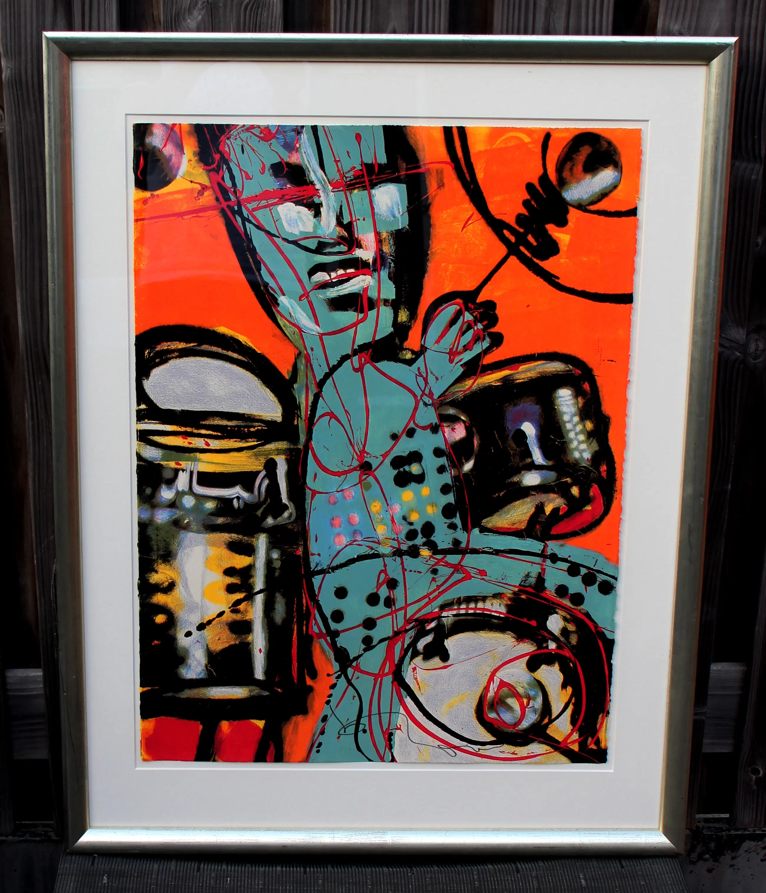 Ingelijste zeefdruk van Herman Brood. Titel: Het bandje: de drummer. Jaar: 1990. Oplage: 9/250. Deze zeefdruk is uitgegeven door de Free Record Shop. De totale serie bestond uit 5 verschillende werken: