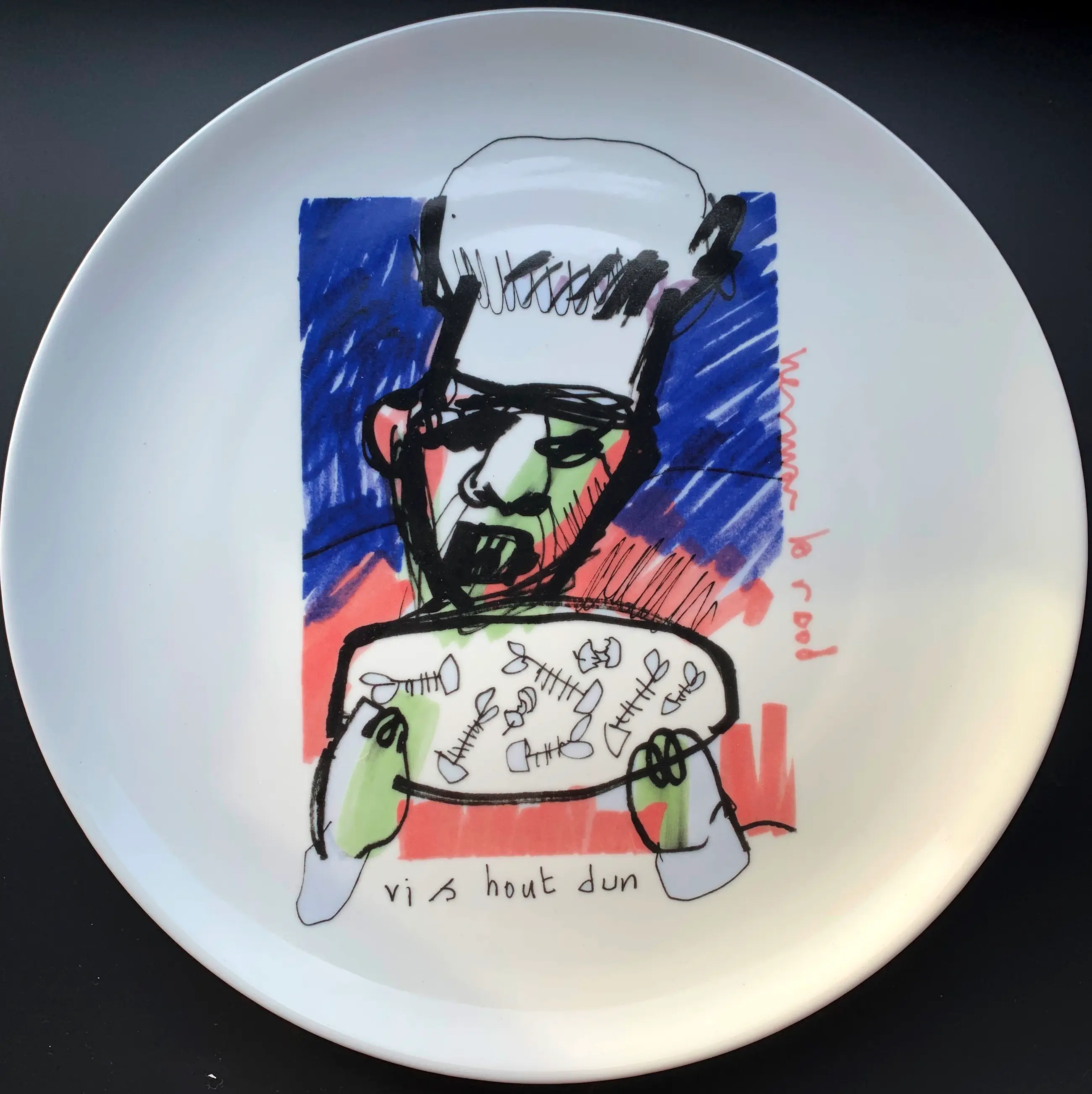 Bord van Herman Brood. Titel: "Aan de lijn". Jaar: 2007/2008. Gefabriceerd door Royal Goedewagen Holland. Gemaakt voor de Librije(Zwolle). Diameter: 32cm. Het bord is niet gesigneerd.
