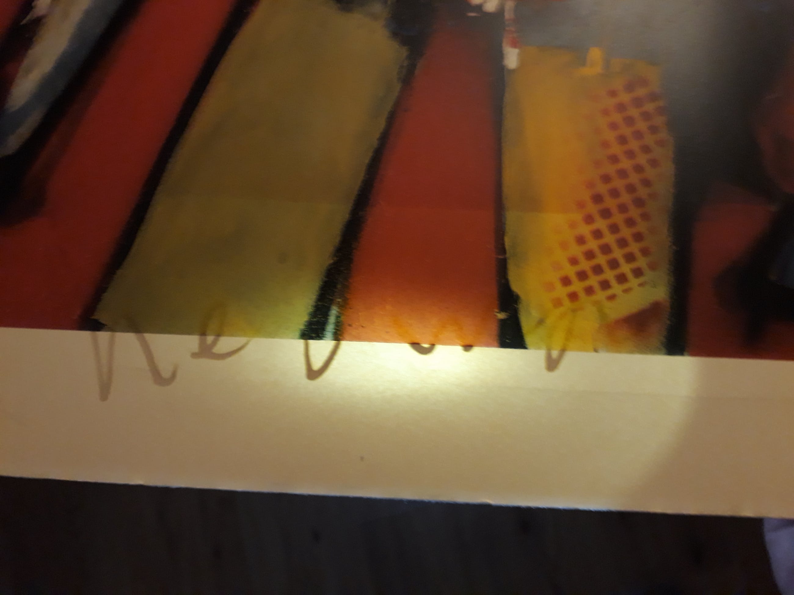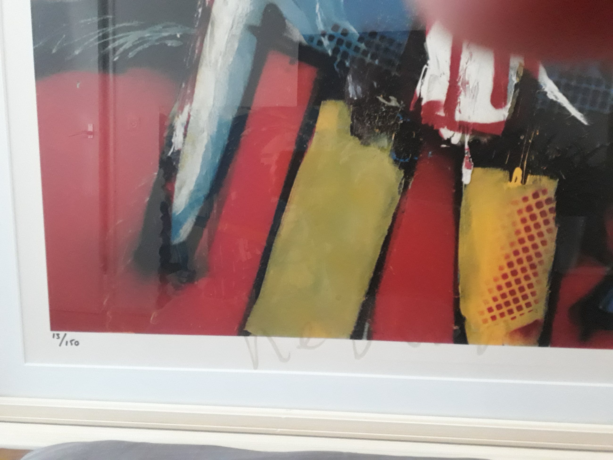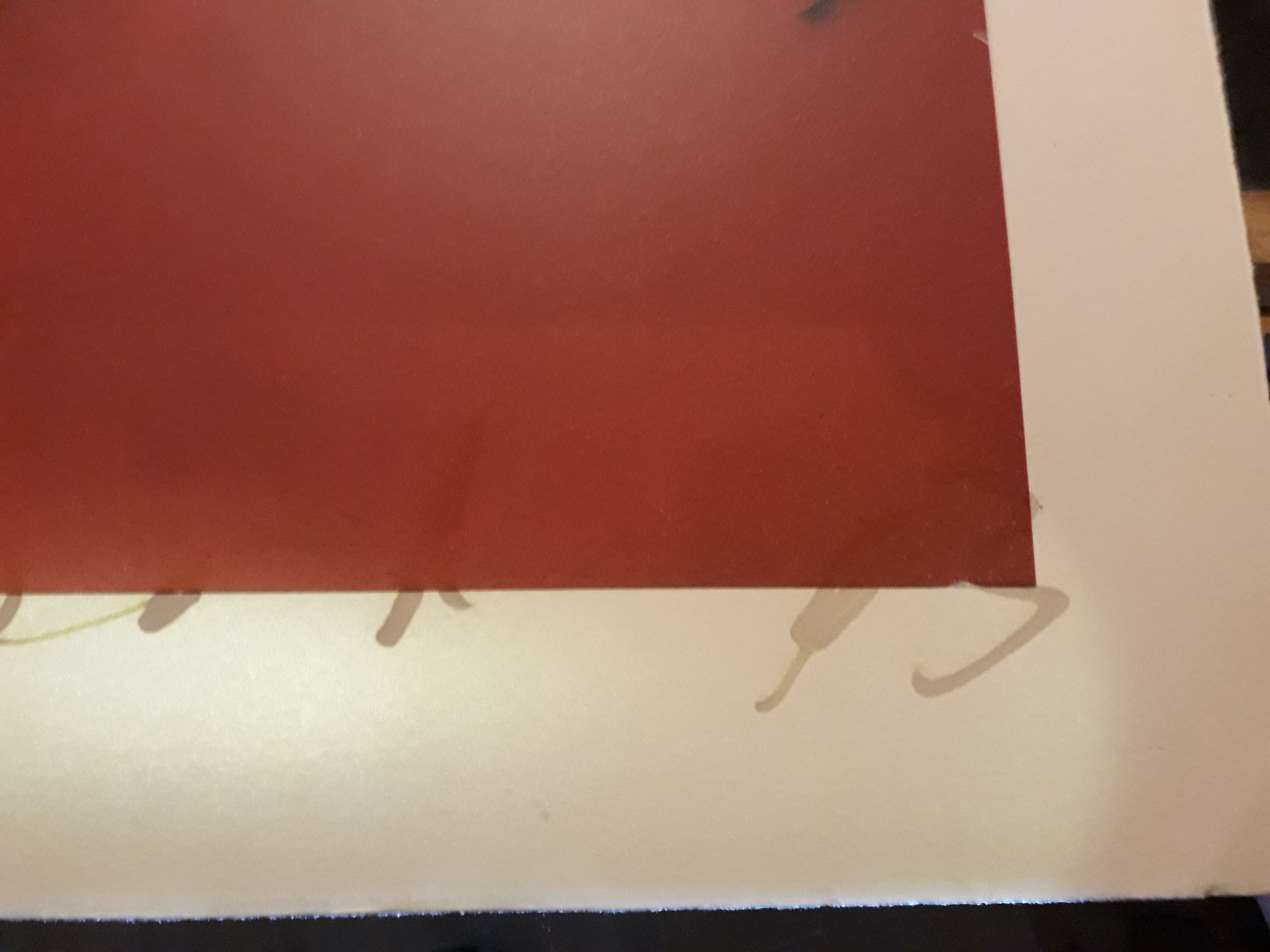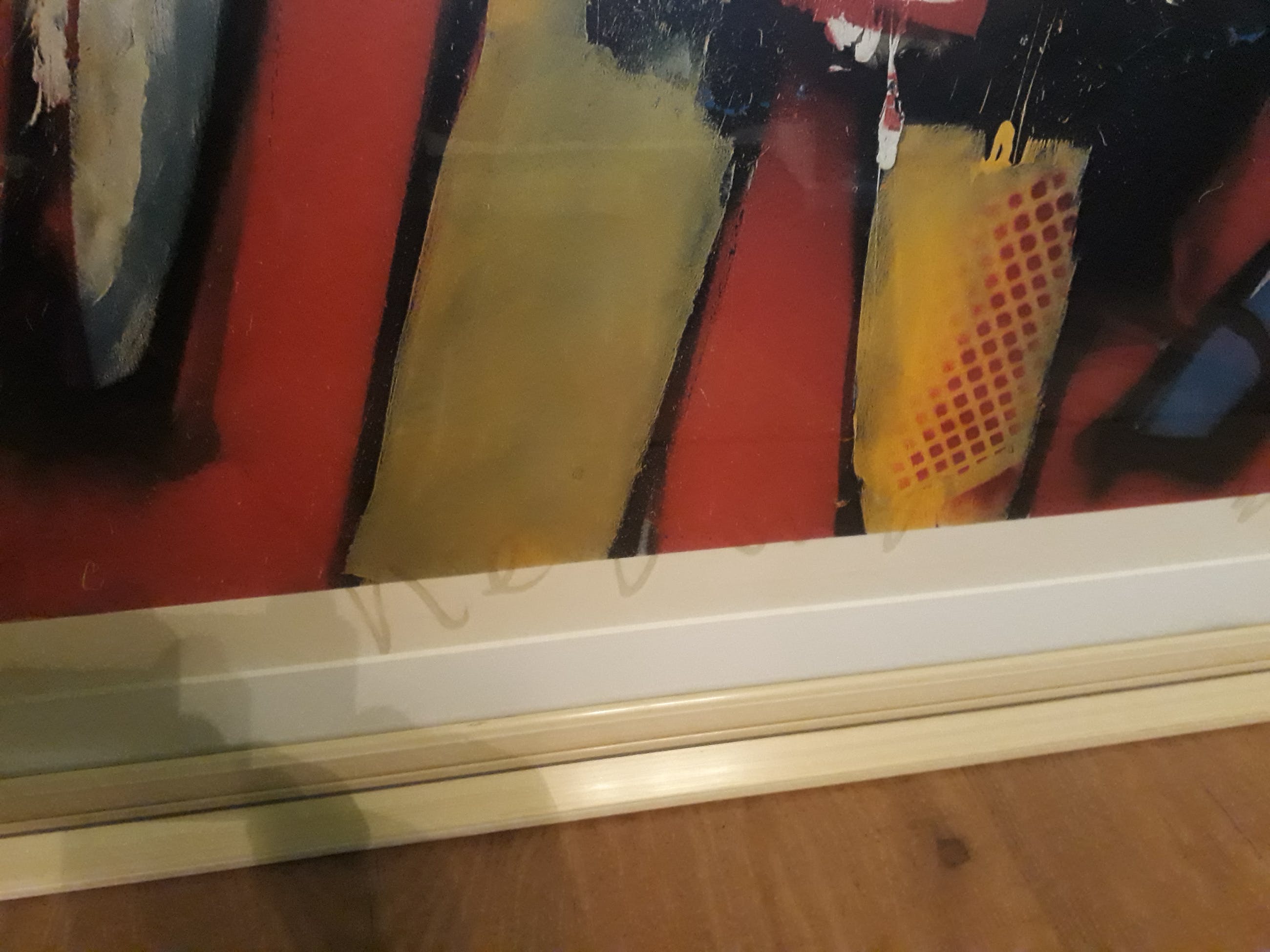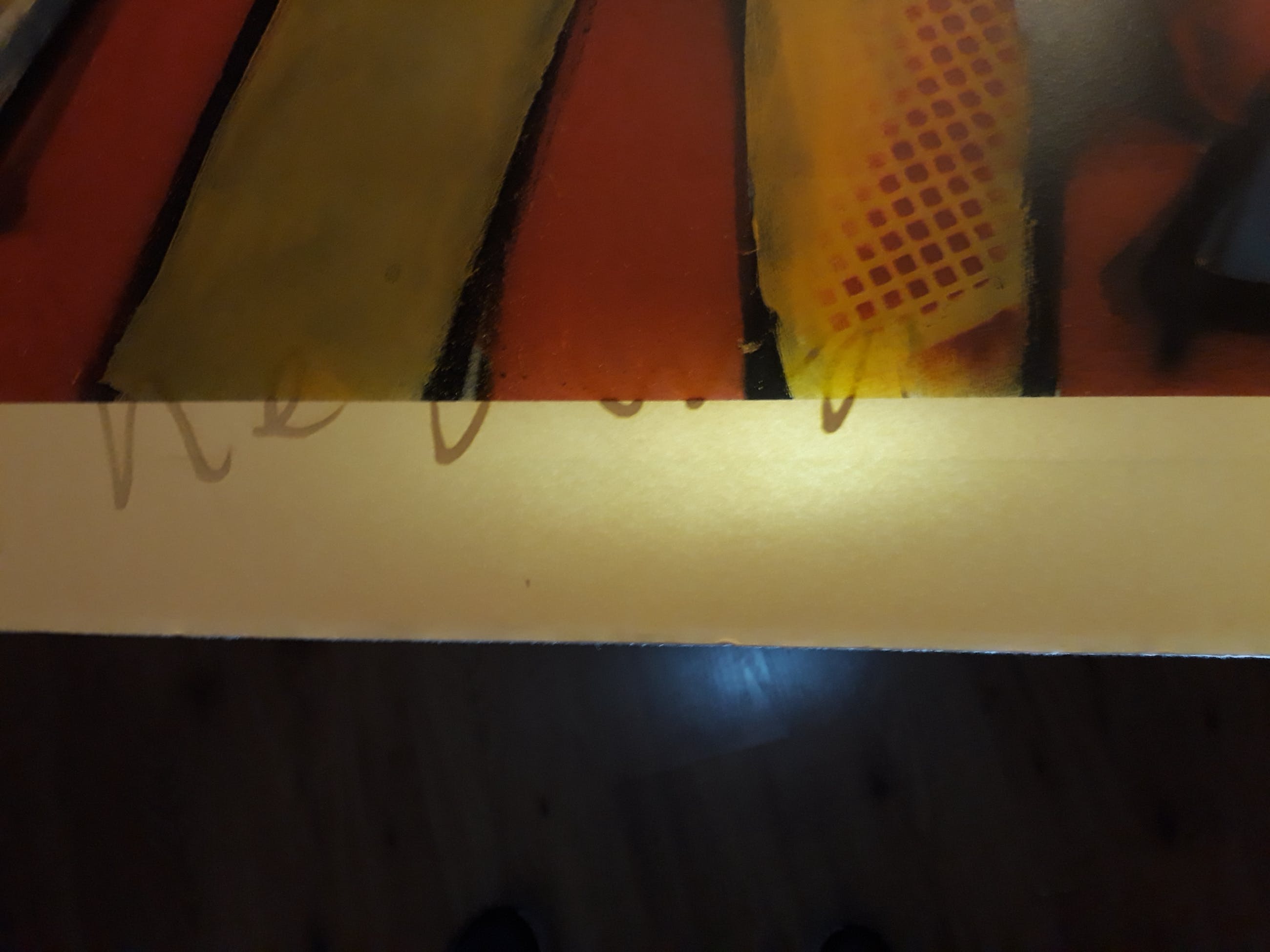 Het werk is opnieuw ingelijst.Tijdens het inlijst4en is goed te zien aan de achterkant dat de handtekening wel doorgedrukt is door het onbedrukte papier,maar niet of amper waar de litho is gedrukt
