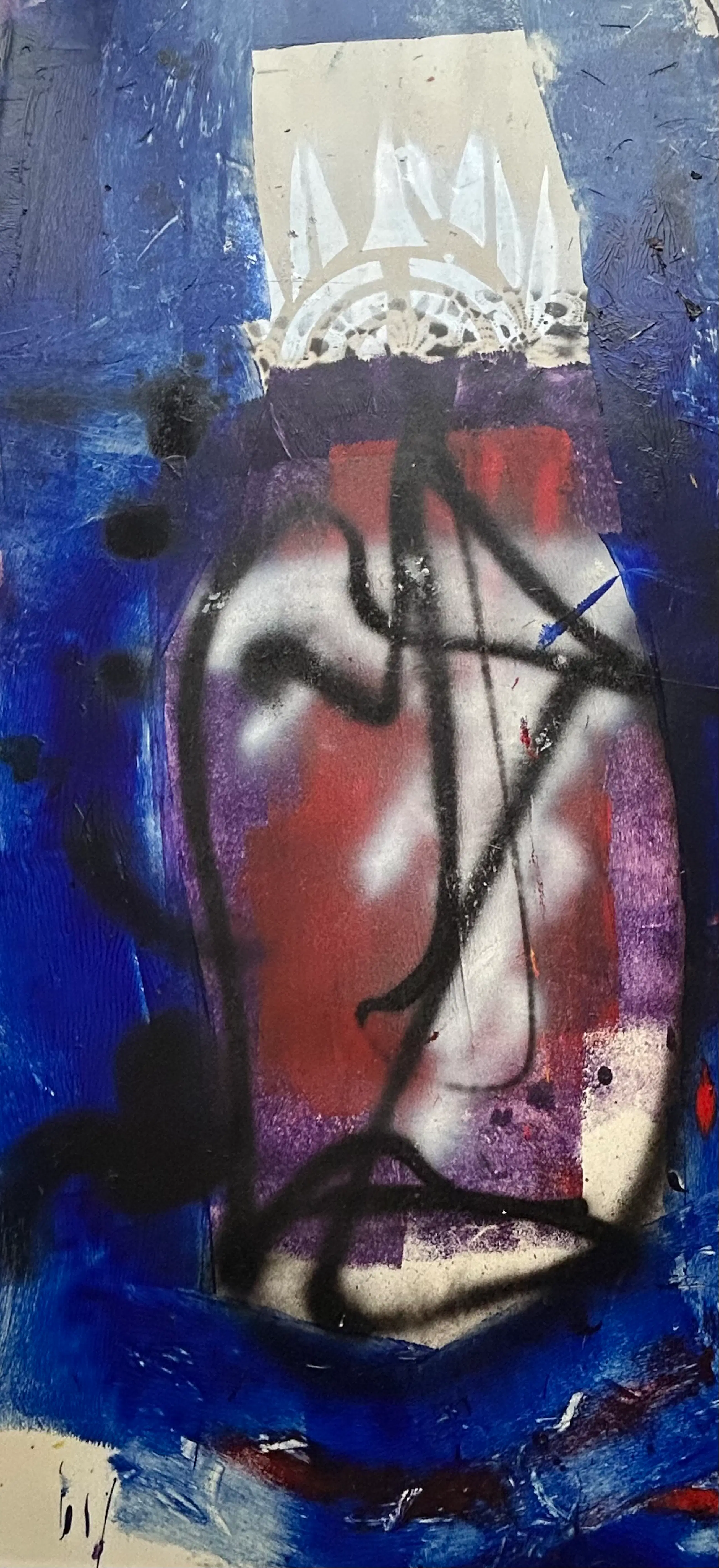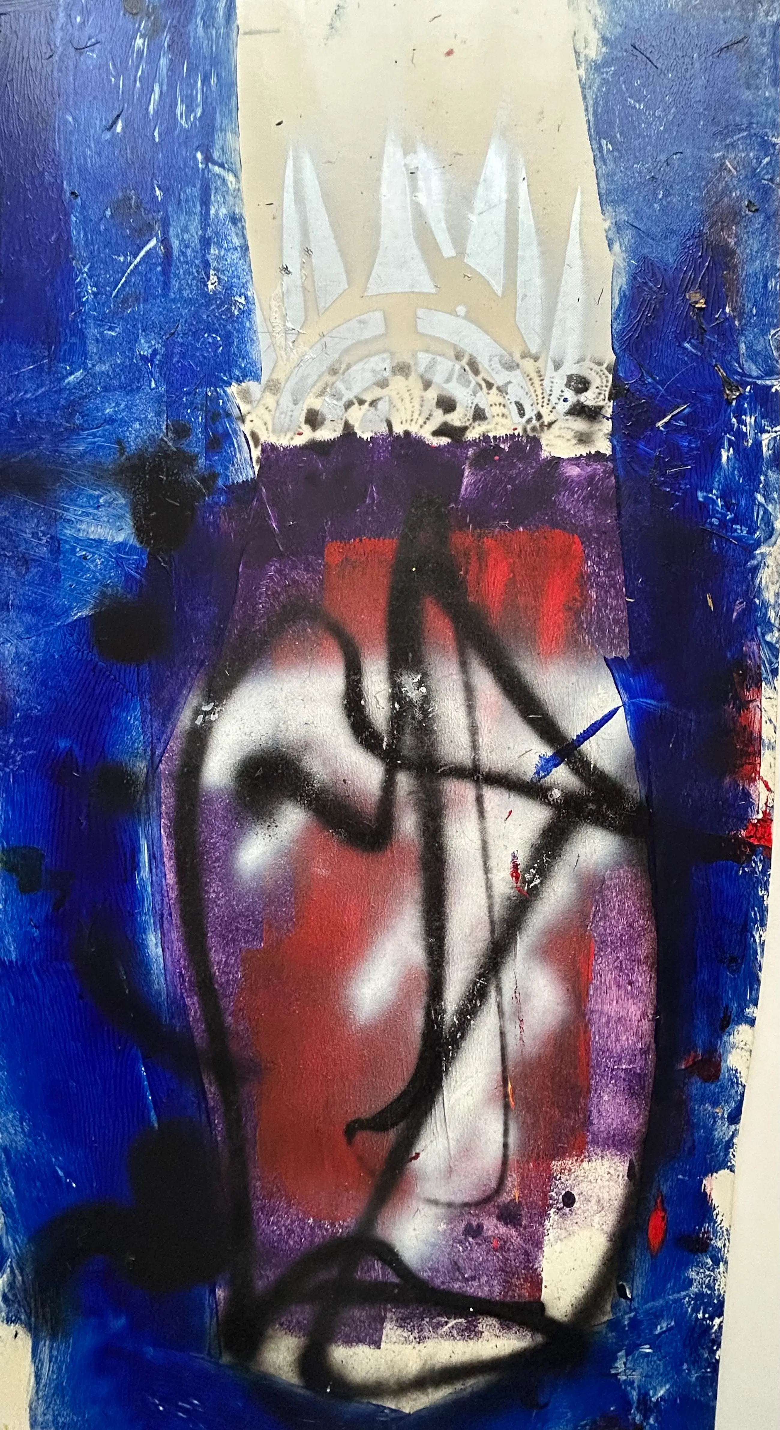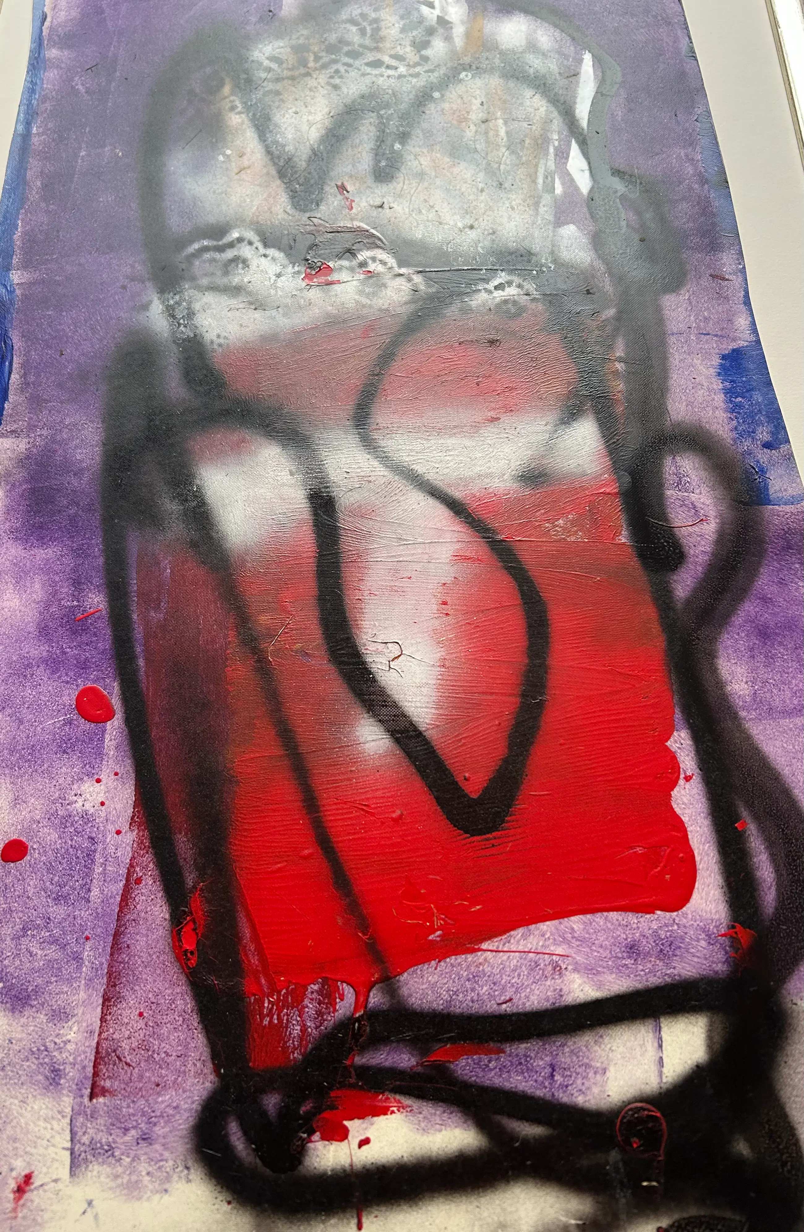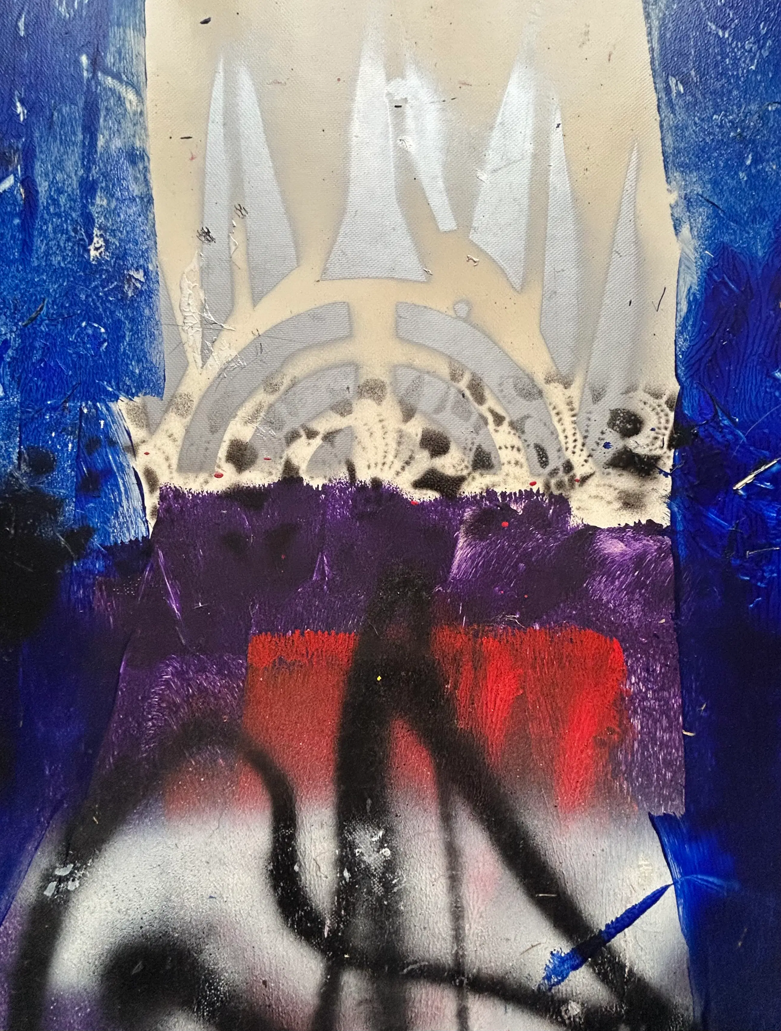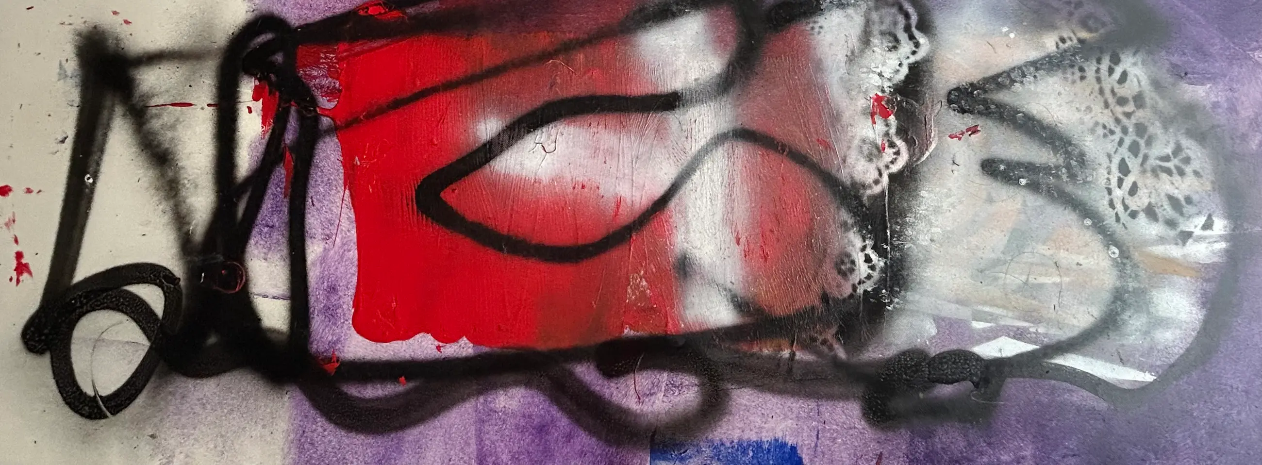 Acryl en spuitbus op een soort vinyl dat hij steeds afsneed van een grote rol.