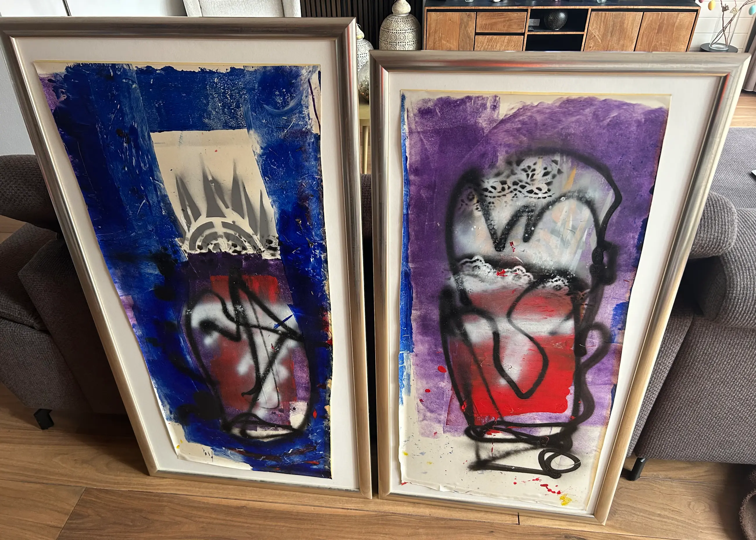 Beide werken zijn gesigneerd met spuitbus en de formaten van de lijsten zijn: 126 x 68 cm. en 121 x 62,5 cm.