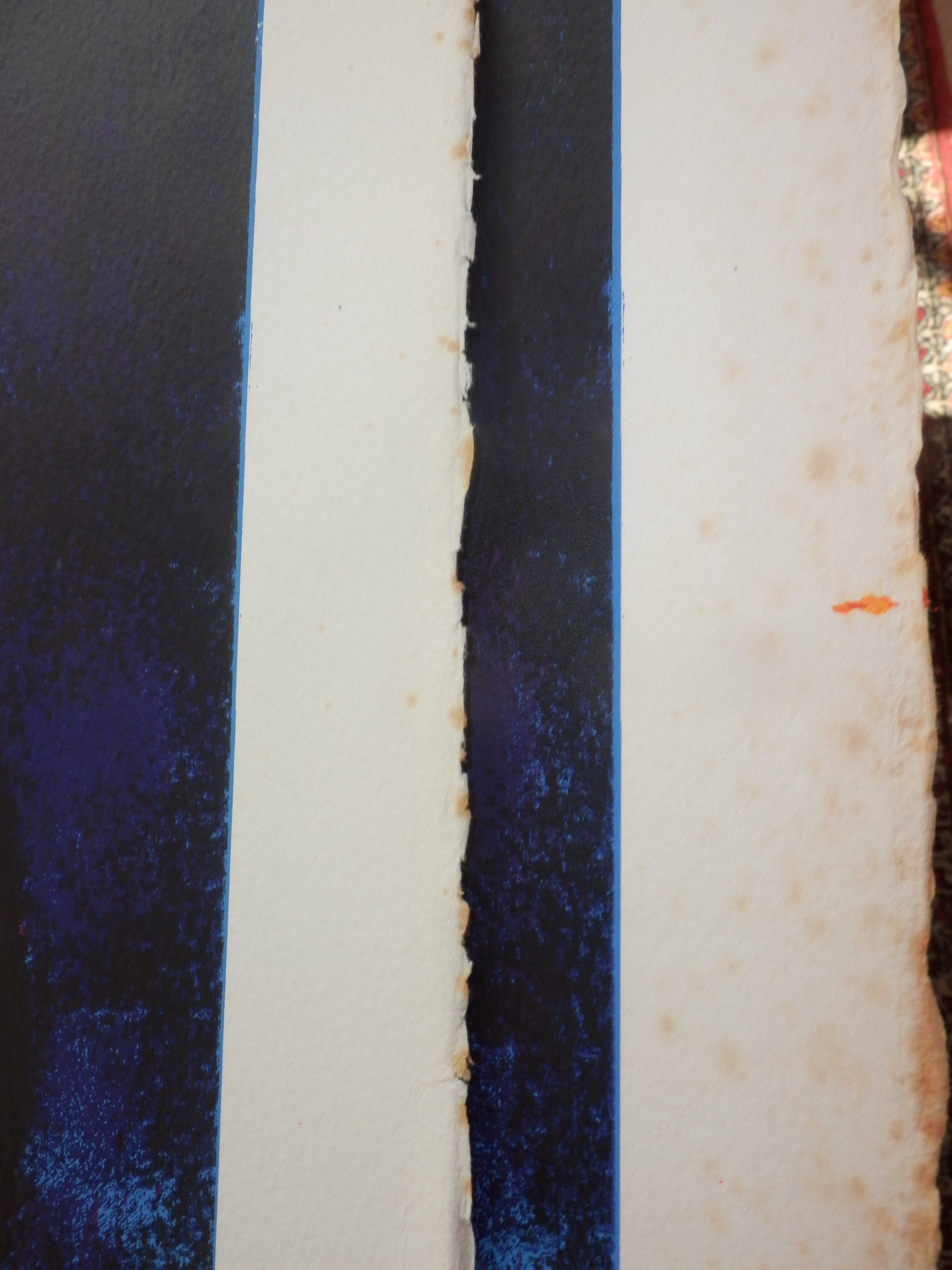 In de witrand zitten kleine bruine vlekjes. Indien het werk wordt ingelijst met het passe-partout tegen het beeld aan,zijn deze niet meer zichtbaar. De vlekjes zitten uitsluitend in de witrand.