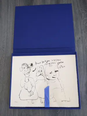 De cassette bevat naast het gebonden boek een prachtige zeefdruk op geschept papier. De cassette meet 39 x 32 cm. en de zeefdruk meet 37 x 28 cm.