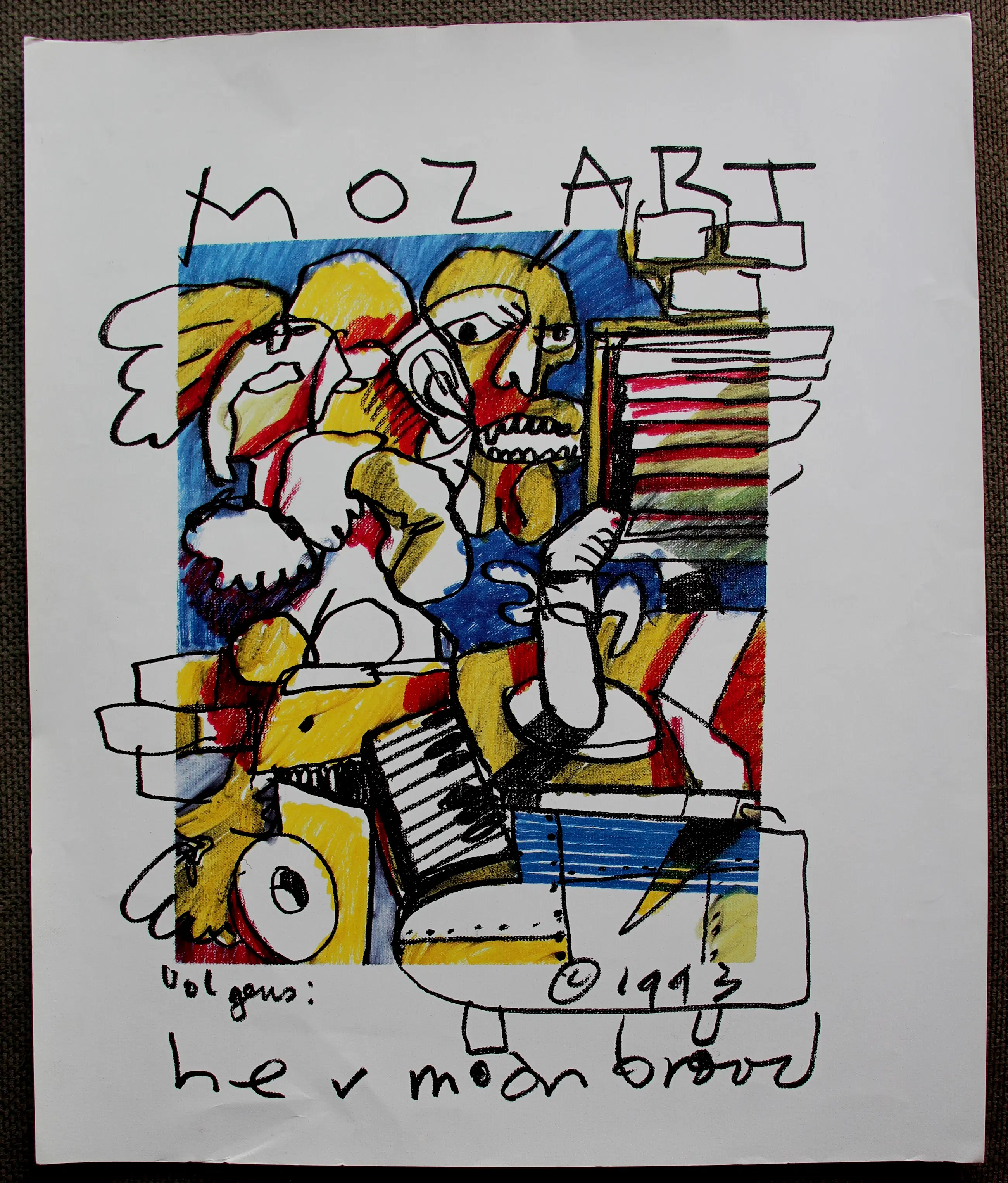 Bekende prent van Herman Brood uit de Free Record Shop popserie (1993). Titel: Mozart. Offset druk op papier, in de druk gesigneerd, getiteld en gedateerd. Afmetingen blad: H65 x b50cm. Afmetingen voorstelling: H38 x b30cm.