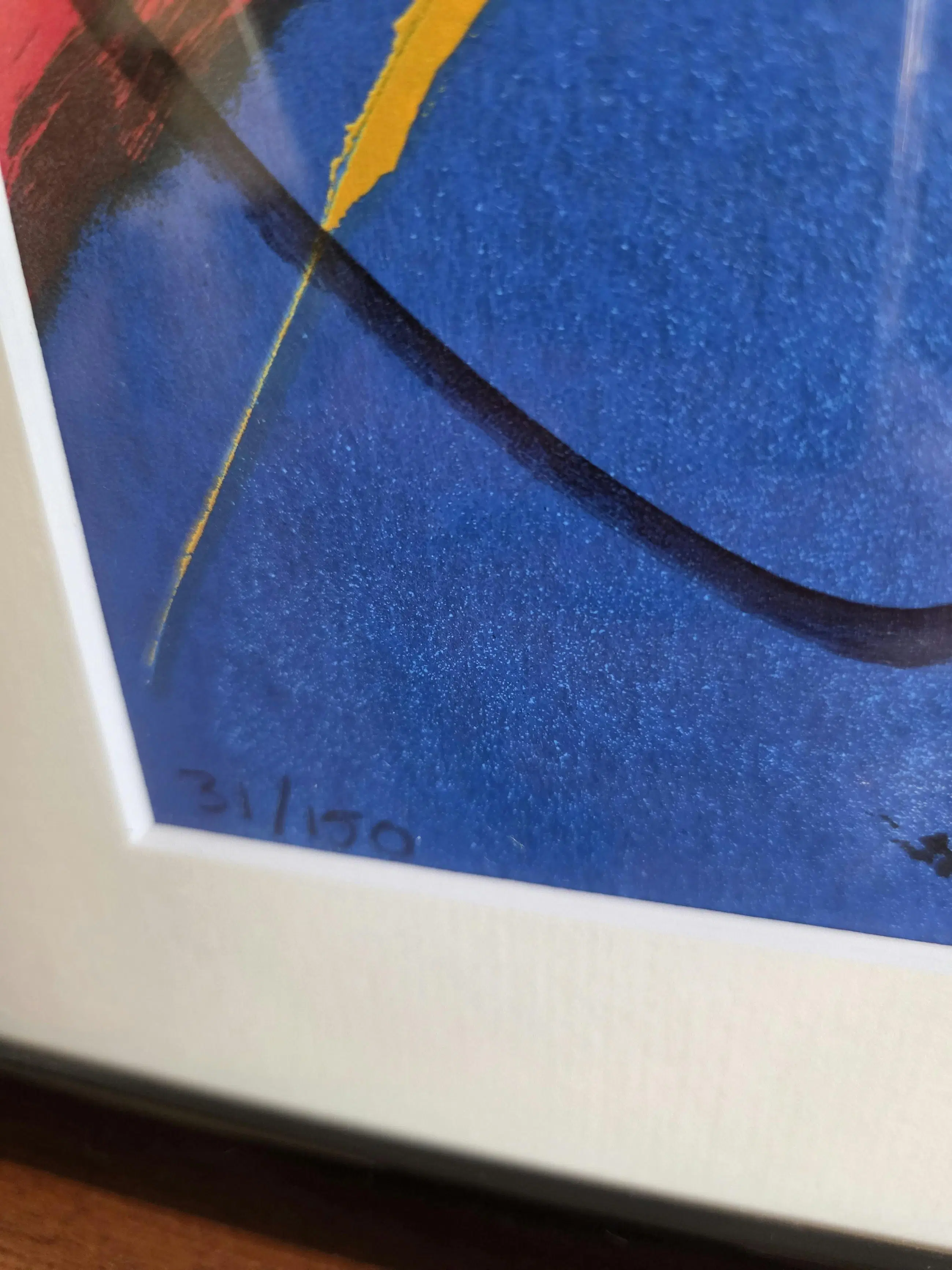 Voorzien van een pianozwarte lijst met smal passe-partout.