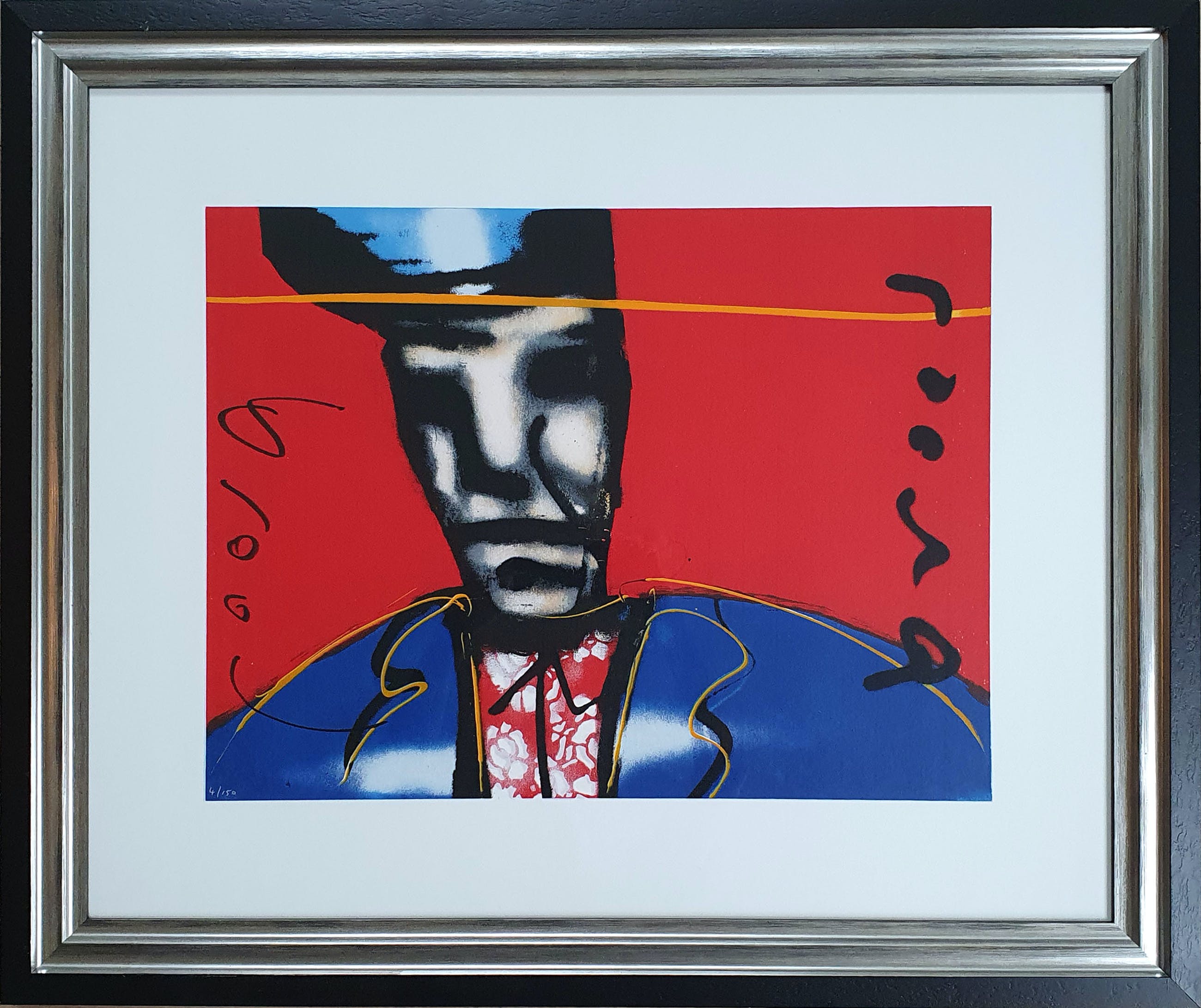 De zeefdruk is professioneel ingelijst in een luxe nieuwe zwarte lijst met zilveren rand, Het werk is voorzien van een echtheidscertificaat. Het geheel is in perfecte staat.