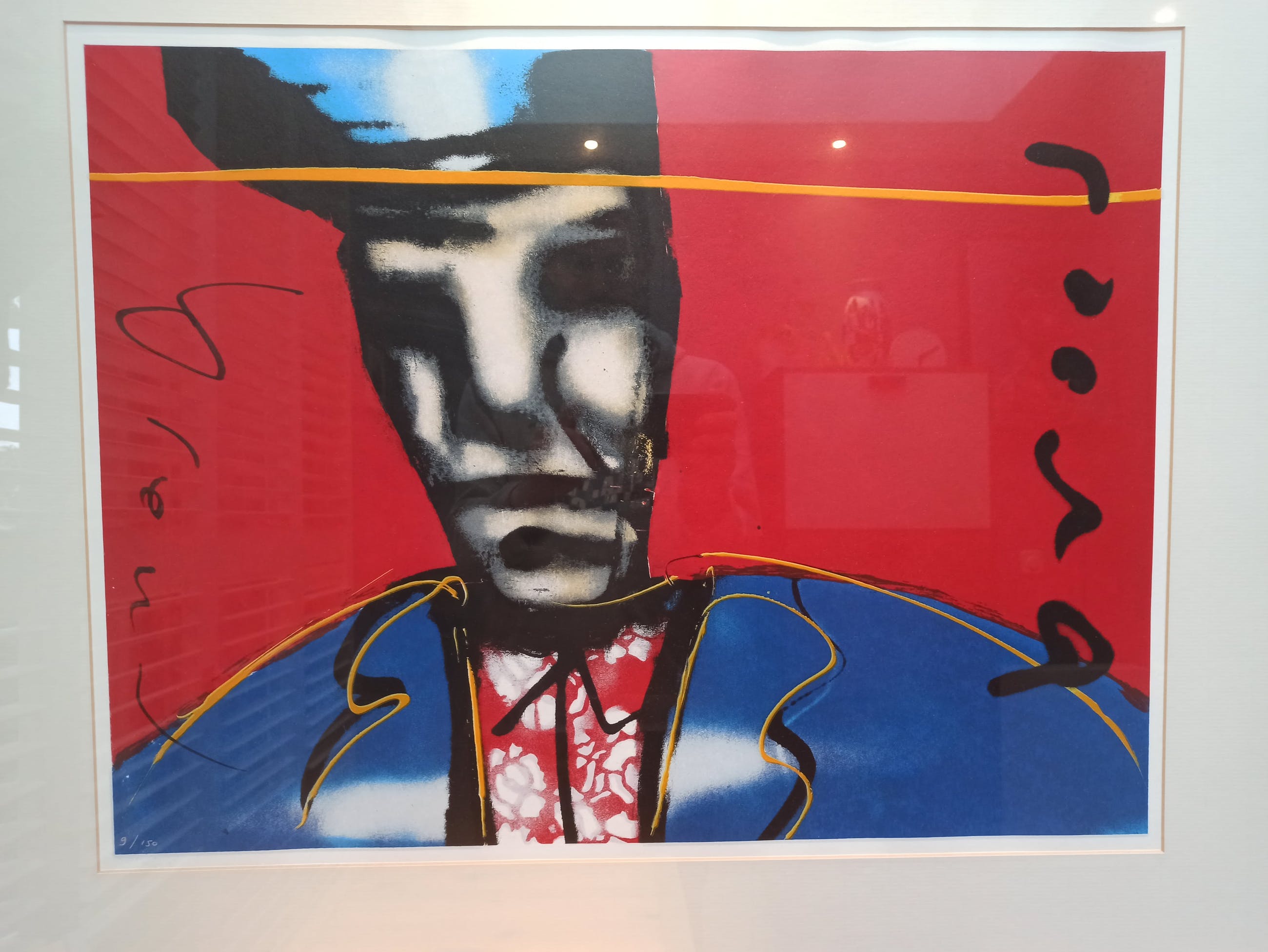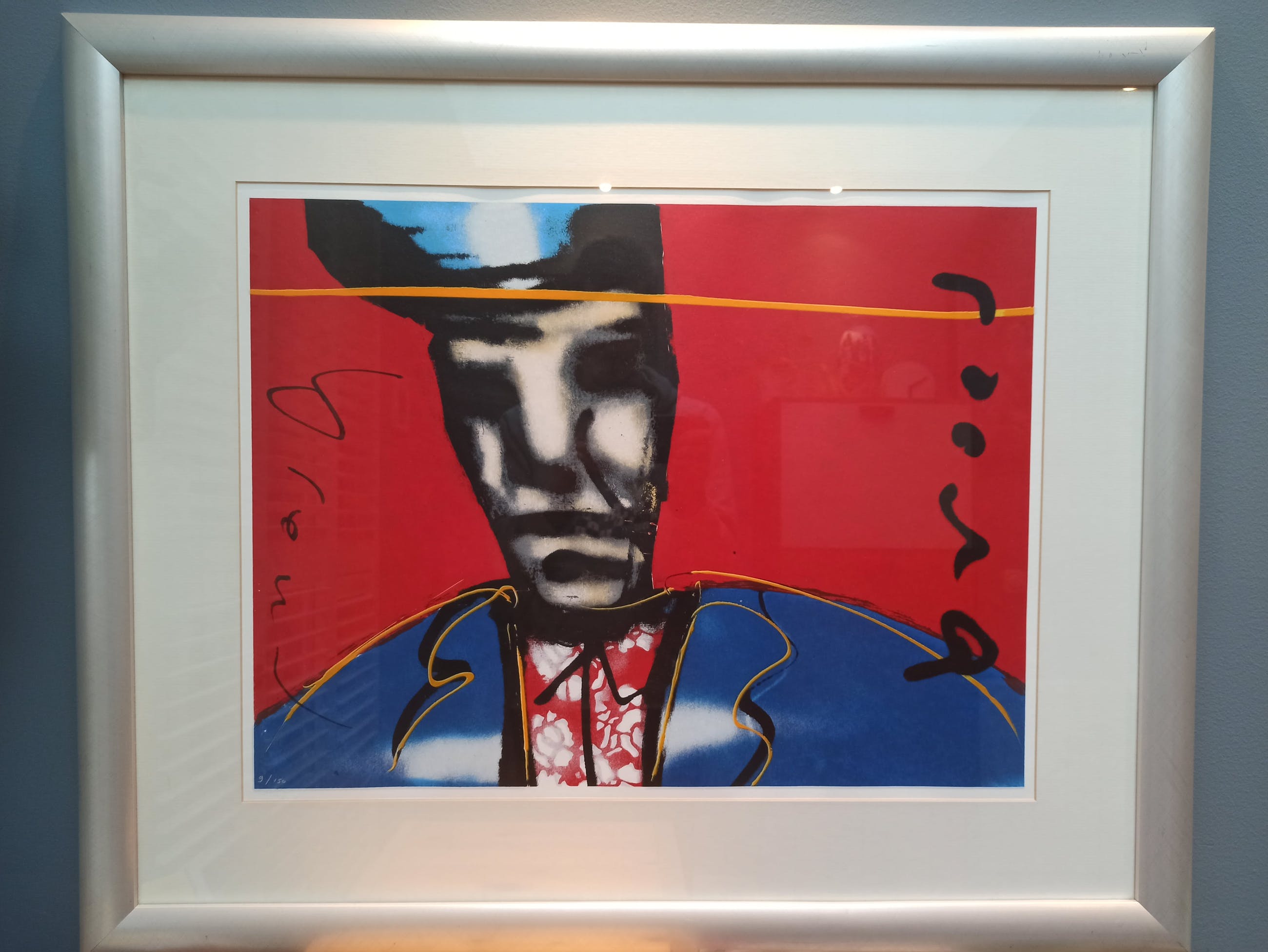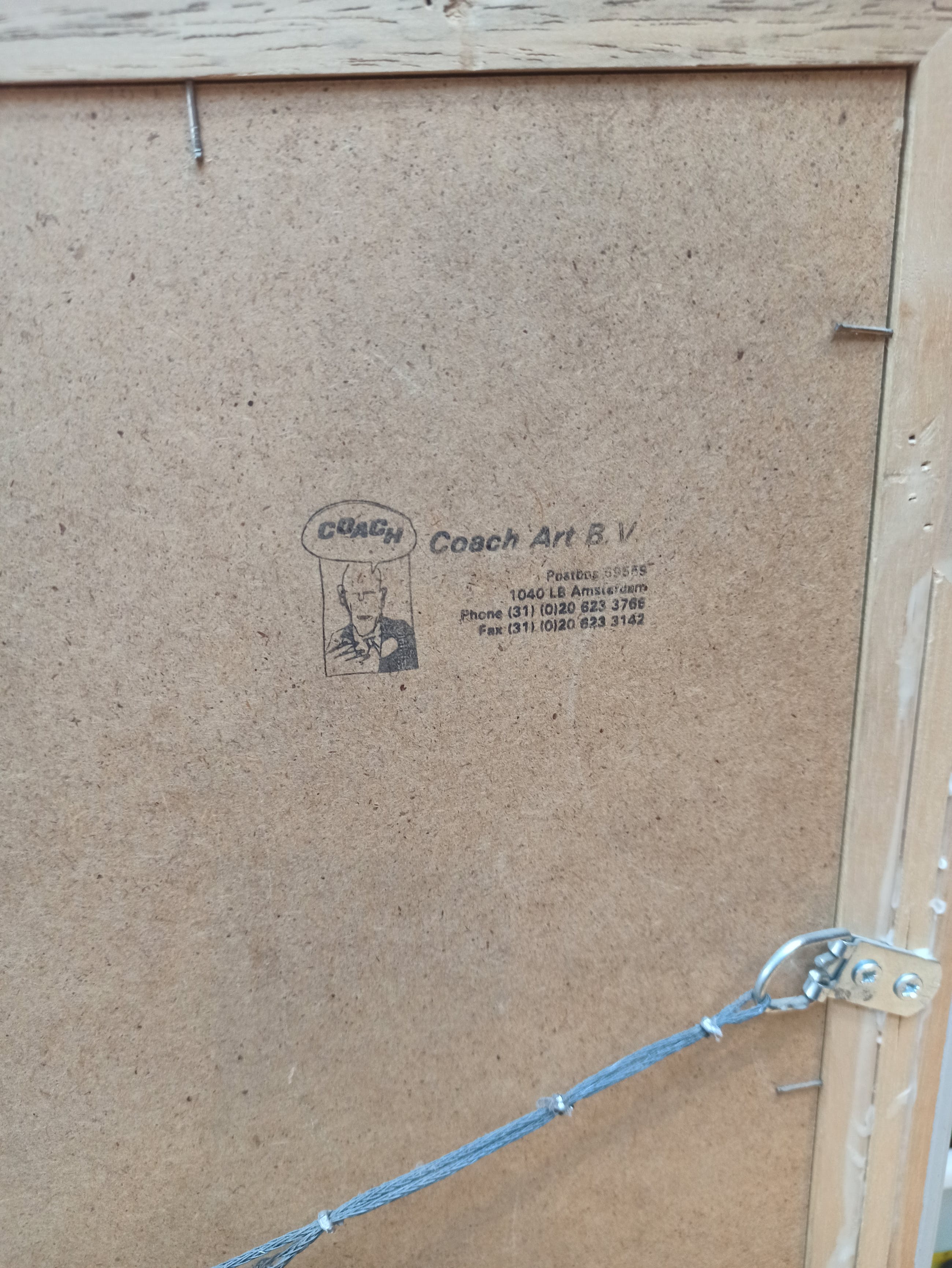 Totale afmetingen van de zilverkleurige houten lijst 91 x 76 cm. De zeefdruk is handgesigneerd en genummerd, dit betreft nummer 9/150.