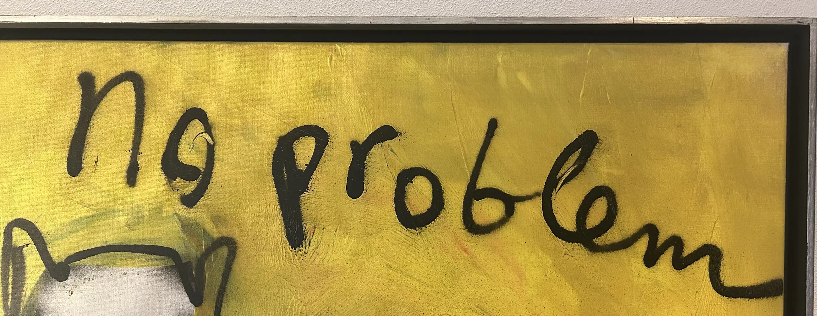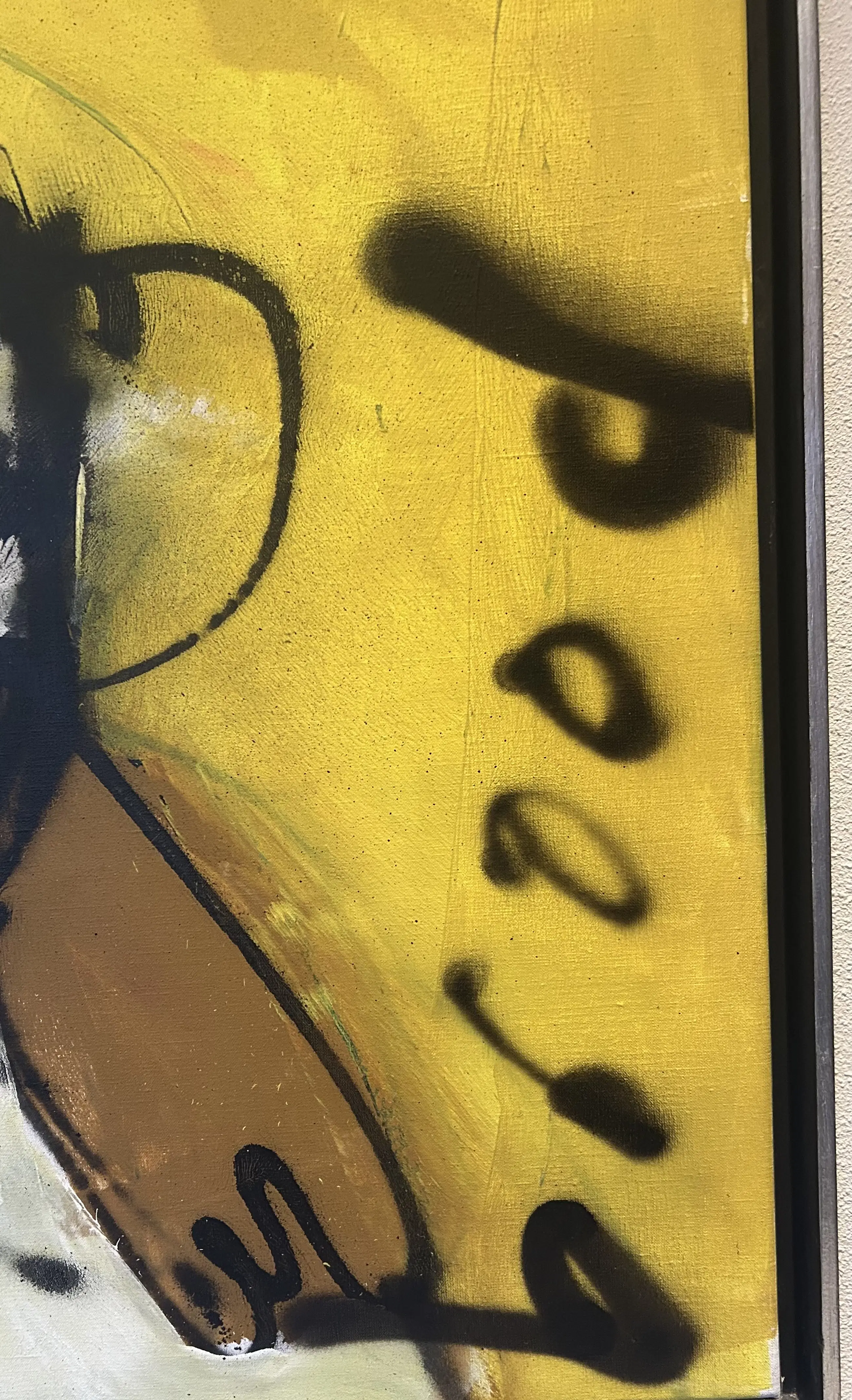 Acryl en spuitbus op linnen en geplaatst in een zilver/zwarte baklijst, totale formaat 105 x 105 cm.