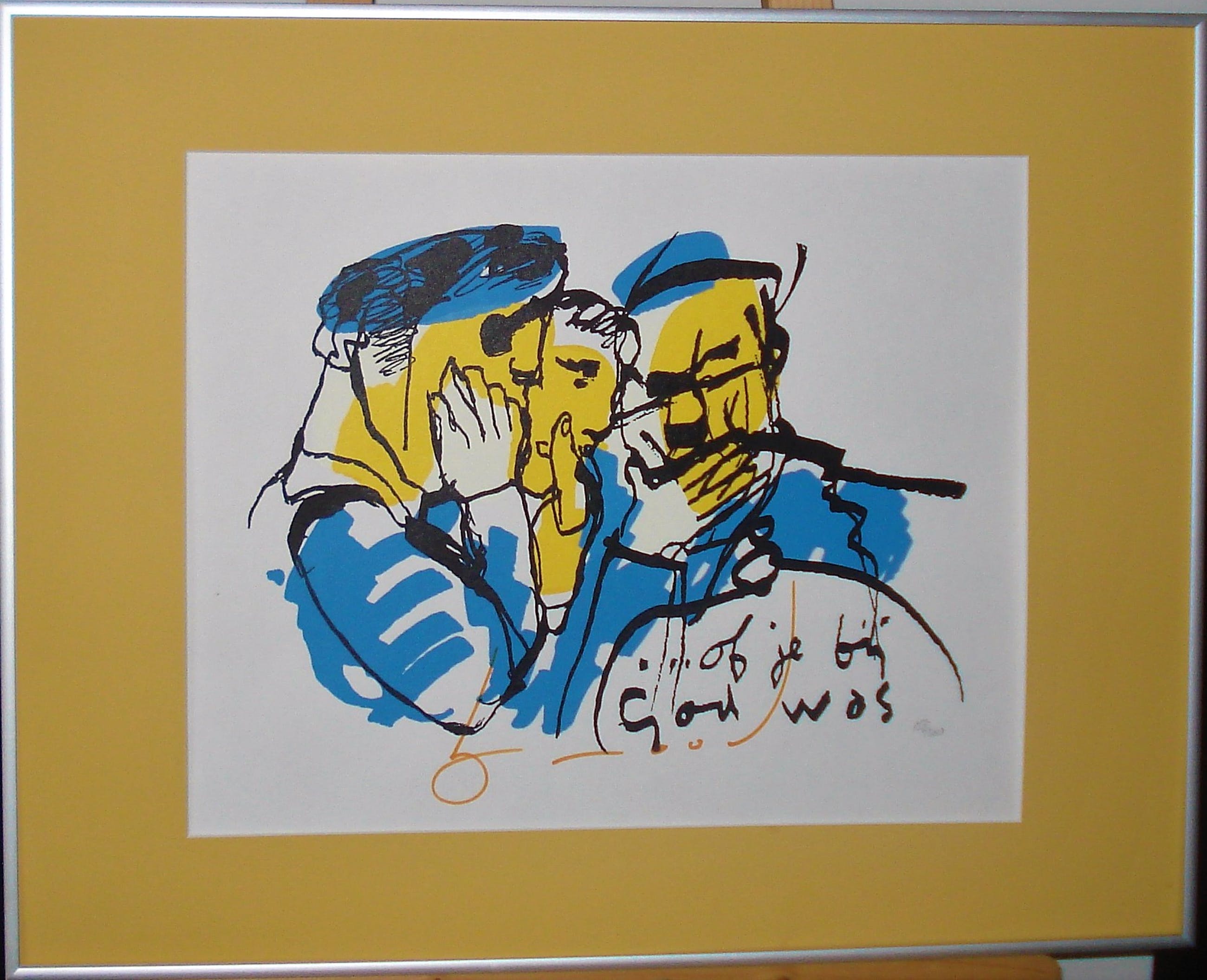 Mooie zeefdruk van Herman Brood Genummerd (157/350), gesigneerd door Brood met gele marker Prachtig gelijst in aluminium lijst in kleuren zeefdrukBladformaat 50x60. beeldformaat 43x32