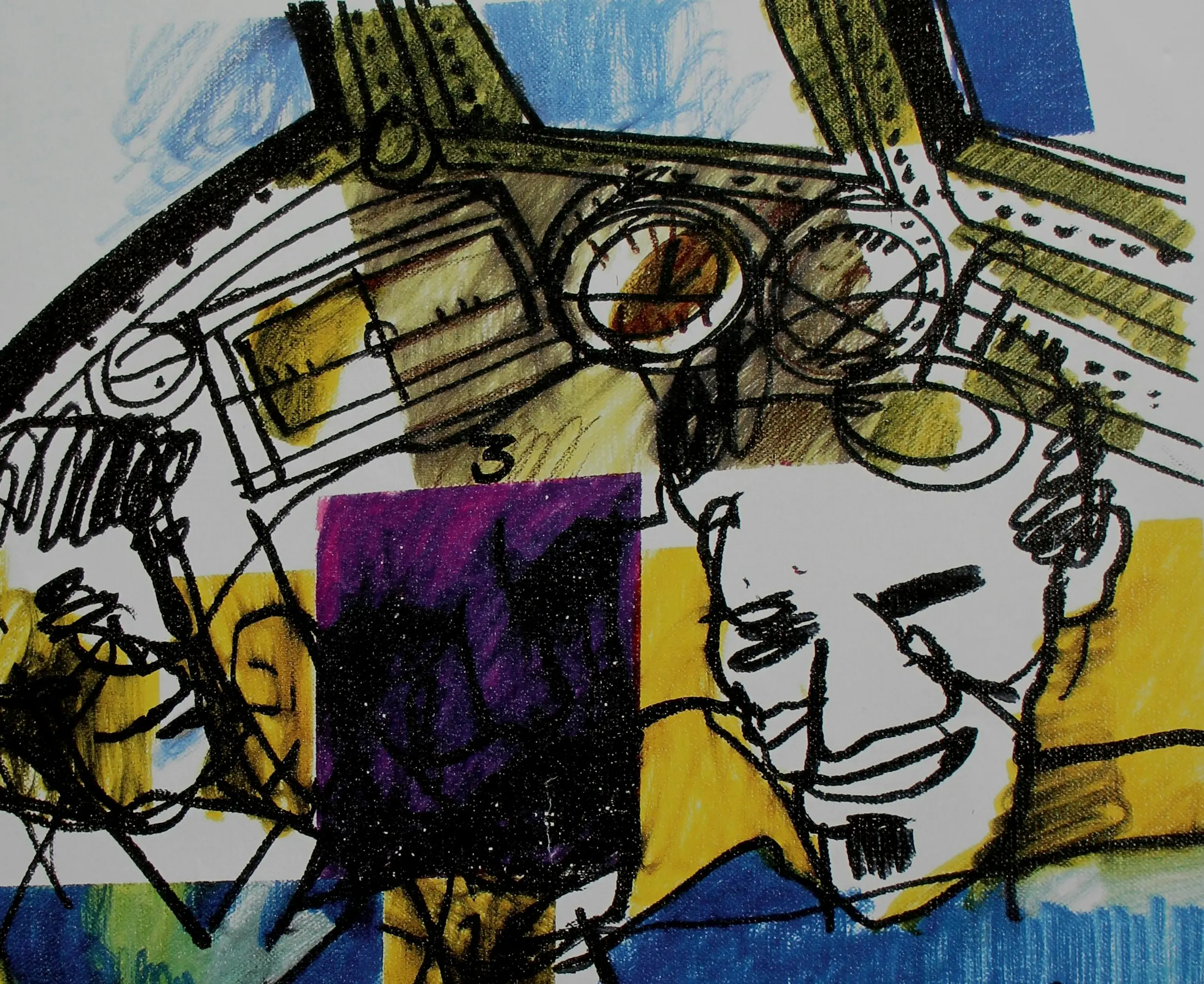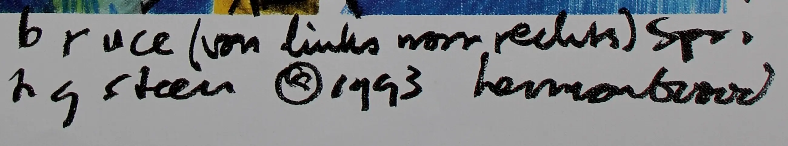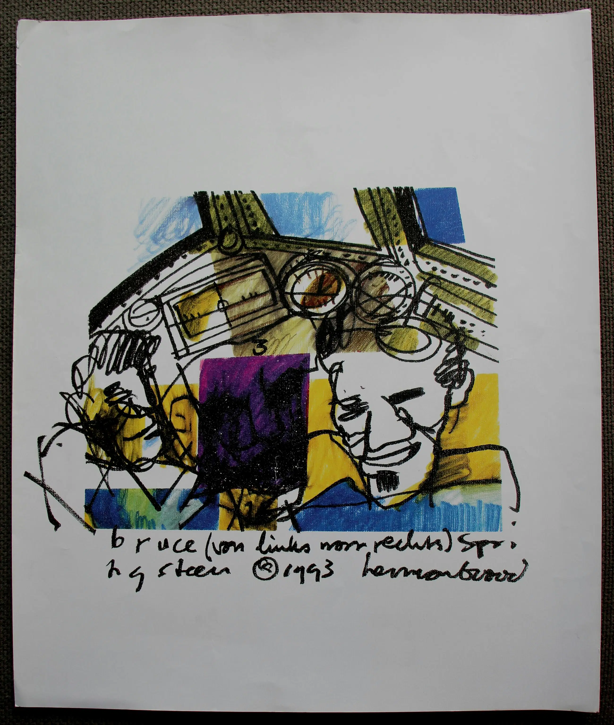 Bekende prent van Herman Brood uit de Free Record Shop popserie (1993). Titel: Bruce Springsteen. Offset druk op papier, in de druk gesigneerd, getiteld en gedateerd. Afmetingen blad: H65 x b50cm. Afmetingen voorstelling: H29 x b35cm.