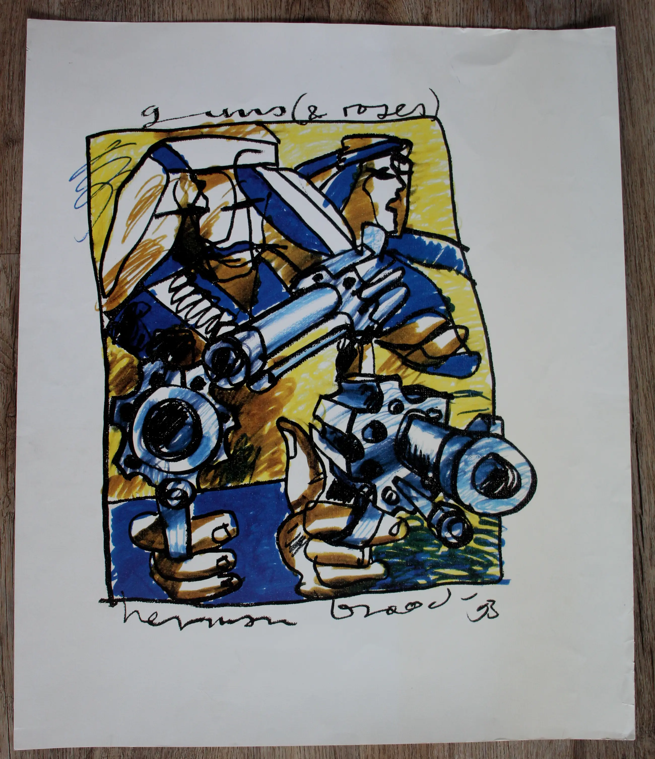 Offset litho van Herman Brood. Titel: Guns(&roses). Jaar: 1993. Afmetingen werk: H60 x b50 cm. Afmetingen voorstelling: H40 x b32cm.