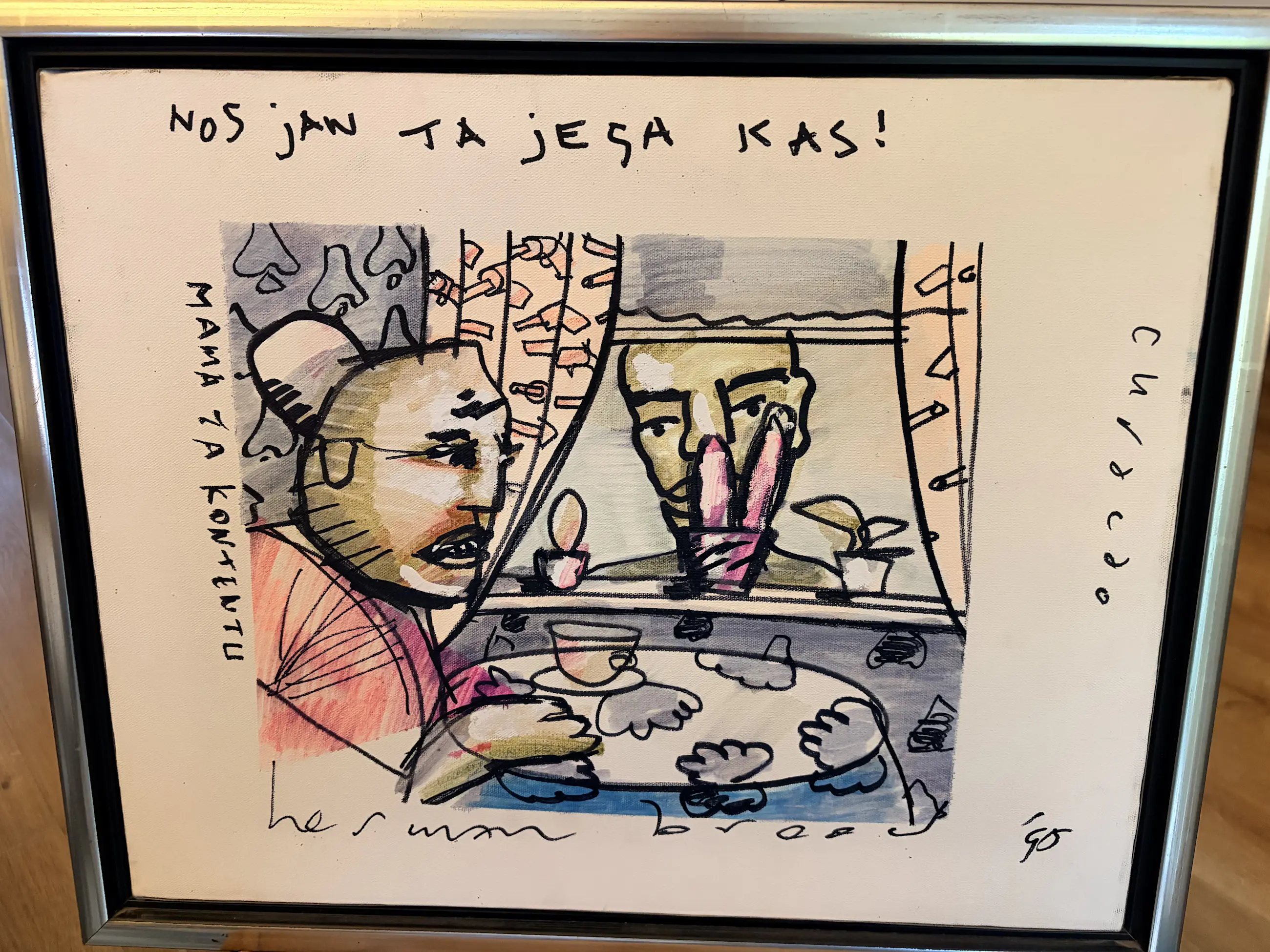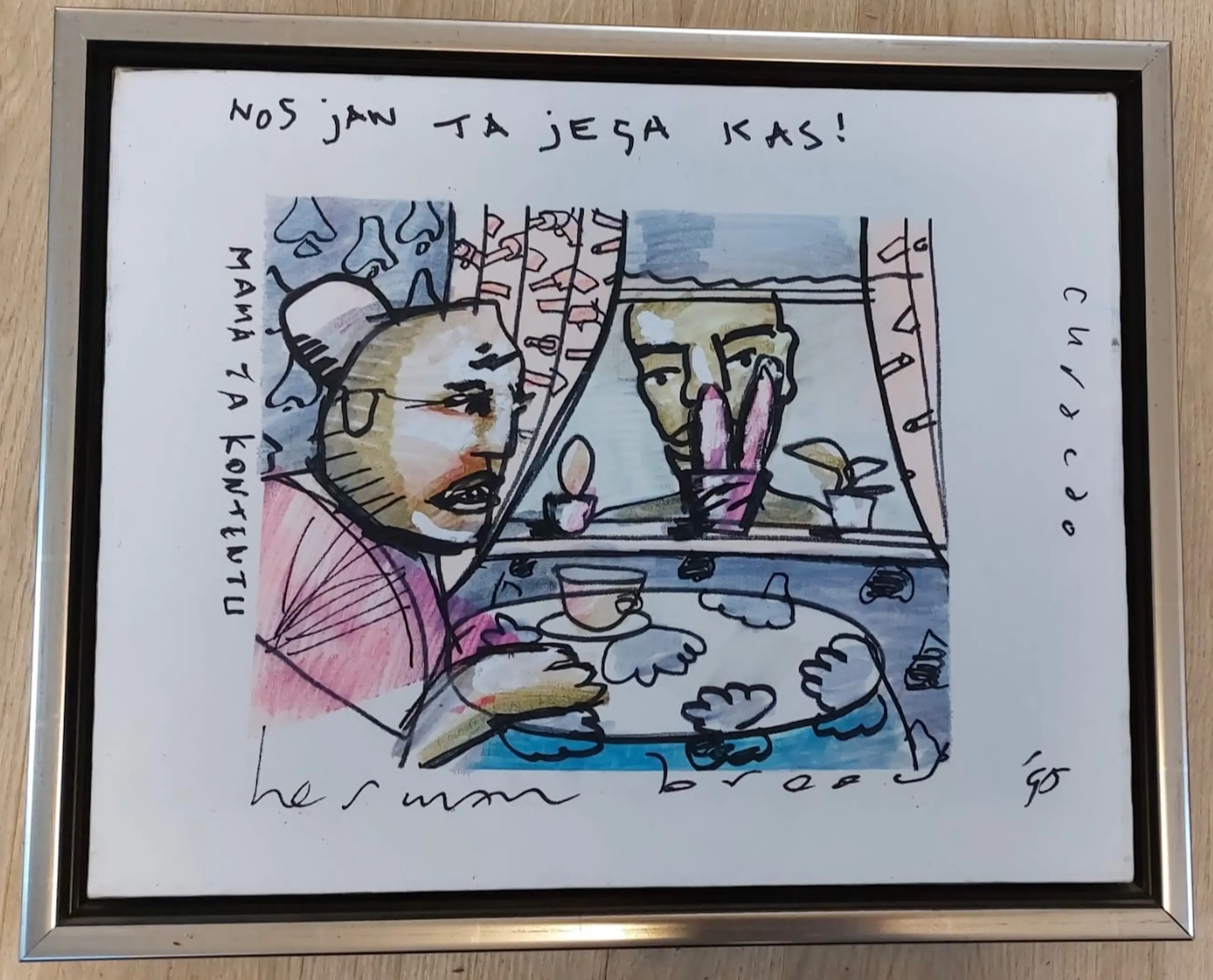 Met stift getekend een tafereel van “onze Jan komt thuis” en moeders zit aan de keukentafel te wachten en is blij verrast. Gesigneerd door Herman zelf en het jaartal ‘96