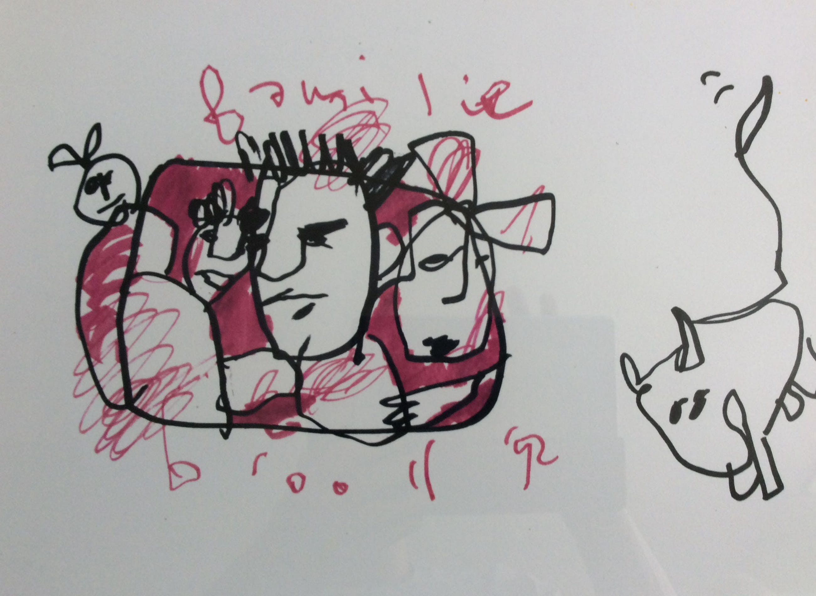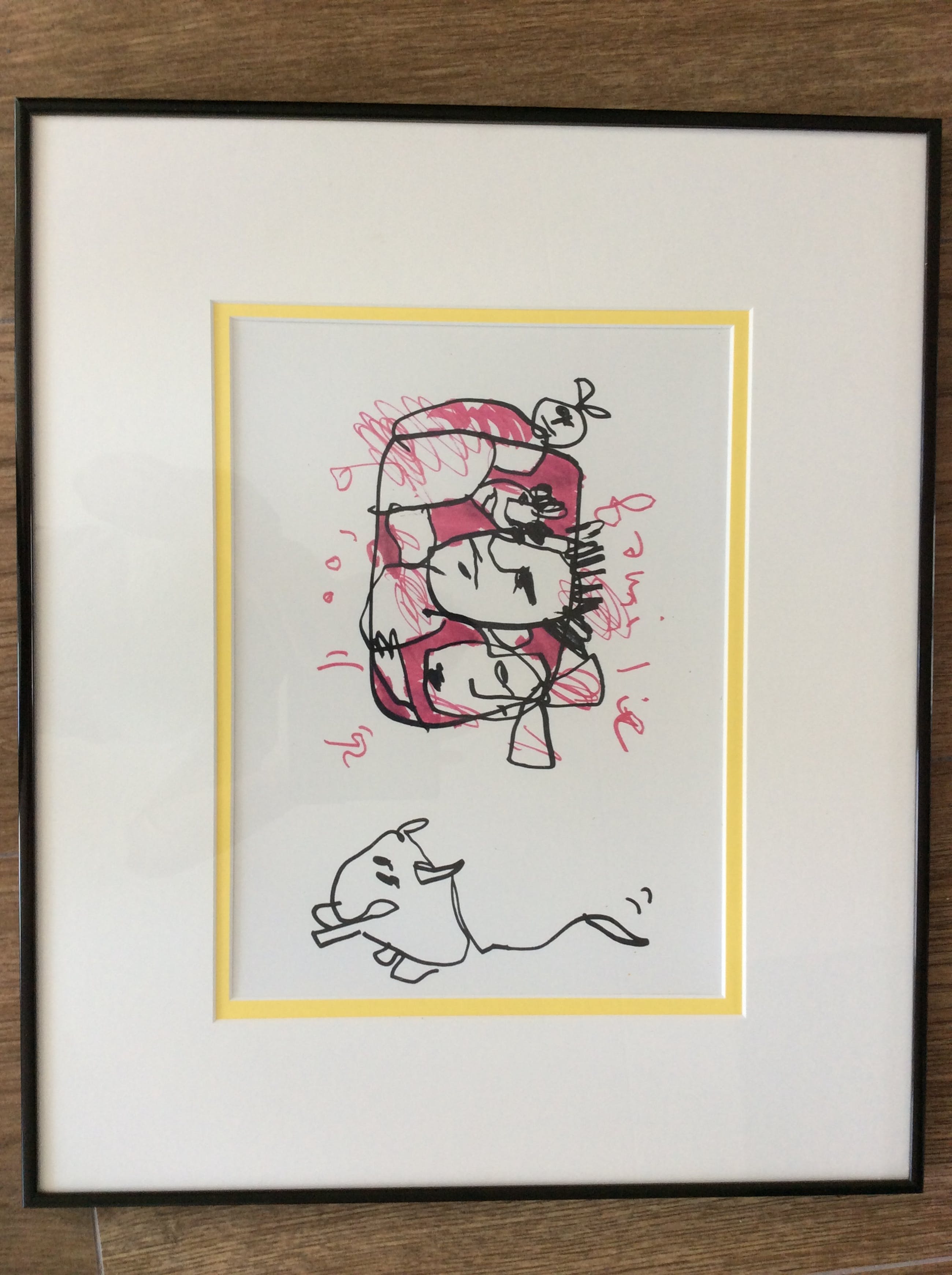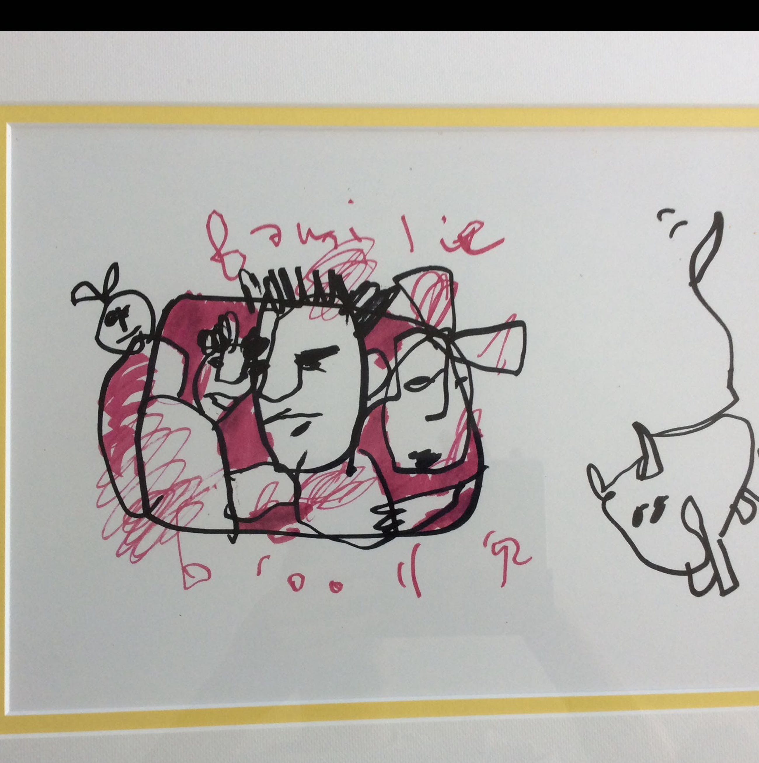 Mooie tekening uit 1992 van Herman Brood. Het betreft de familie Brood met Xandra, dochters en hond Iggy. Voorzien van een dubbel passe-partout en zwarte lijst.