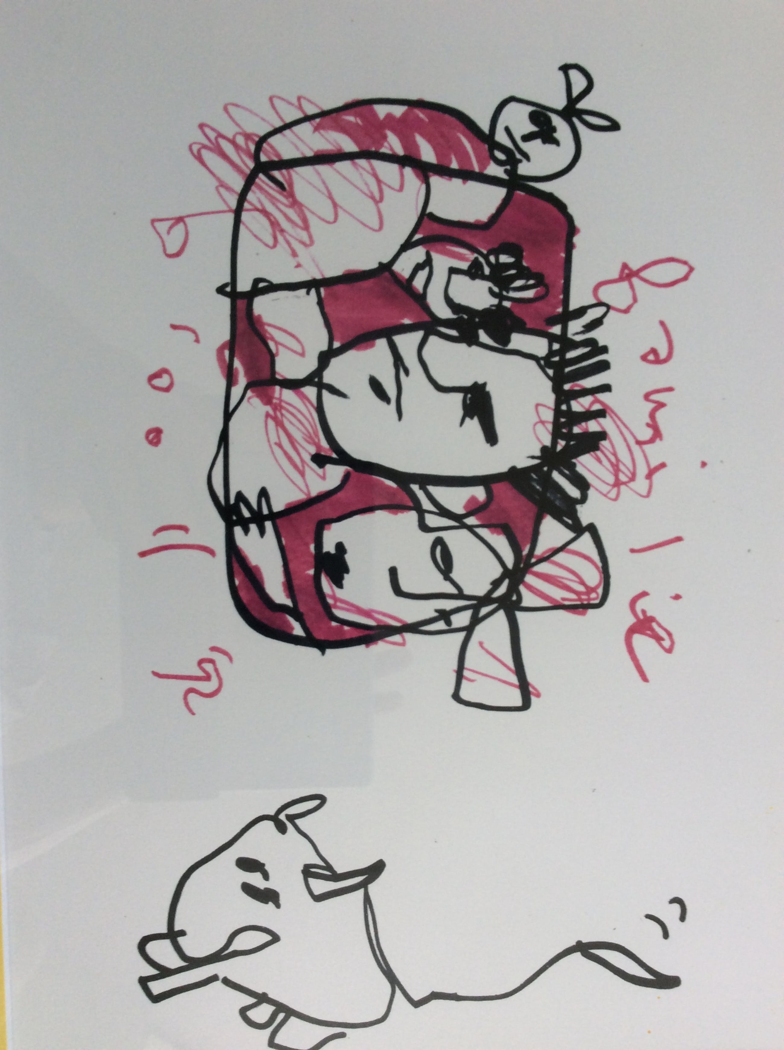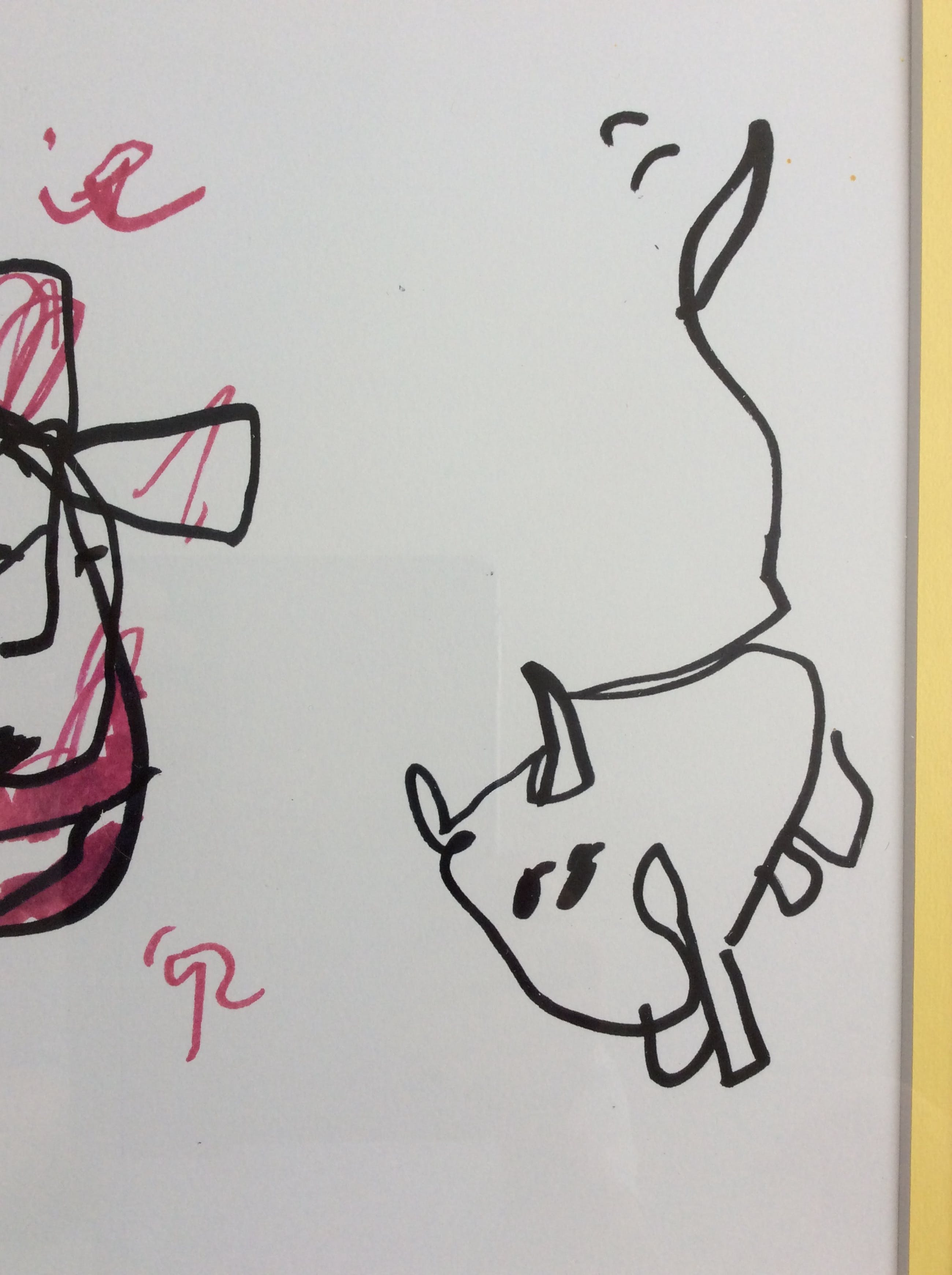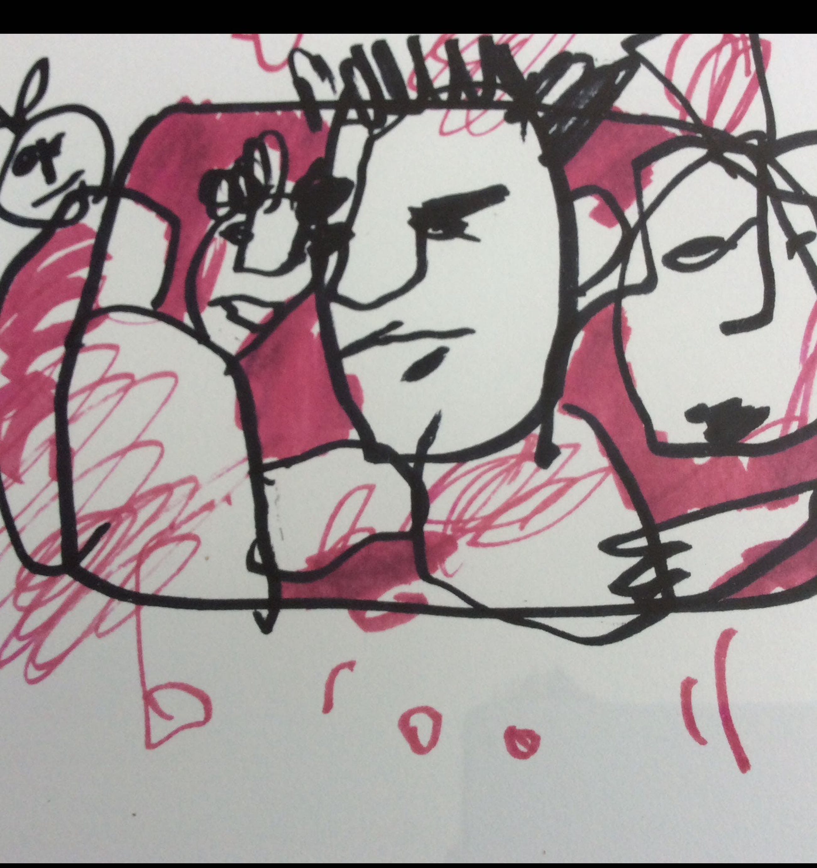 Mooie tekening uit 1992 van Herman Brood. Het betreft de familie Brood met Xandra, dochters en hond Iggy. Voorzien van een dubbel passe-partout en zwarte lijst.