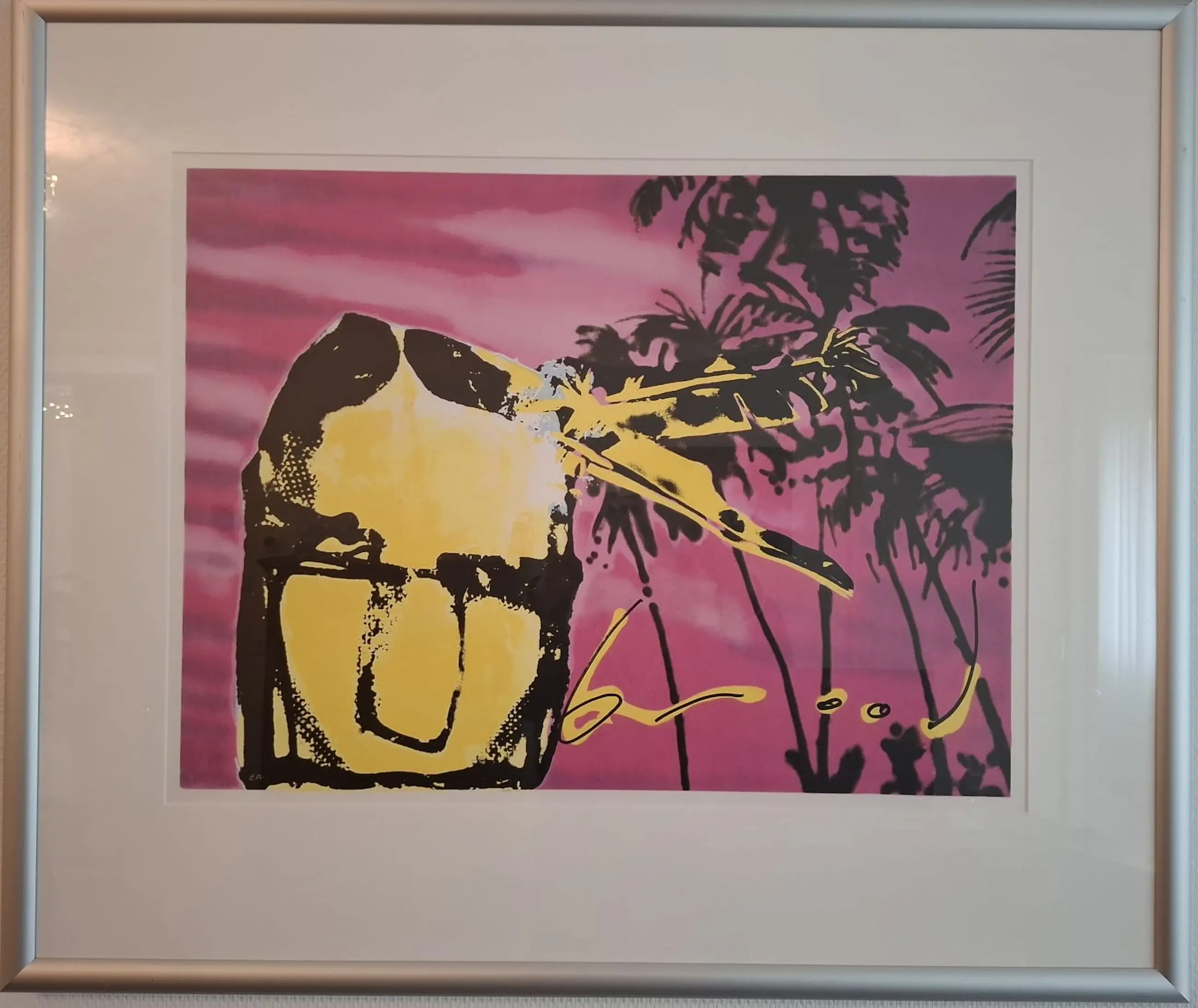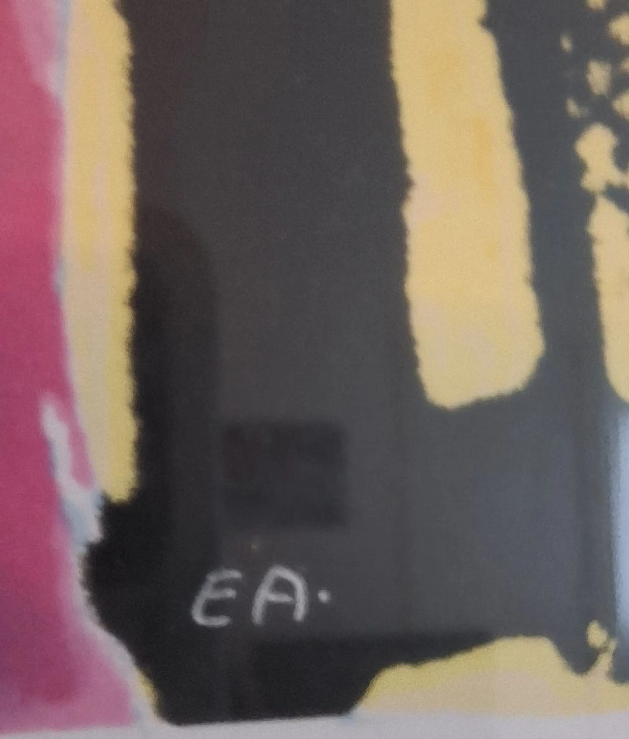 De zeefdruk is met een passe-partout ingelijst in alu zilvergrijze lijst met glasplaat. Betreft een E.A. afdruk