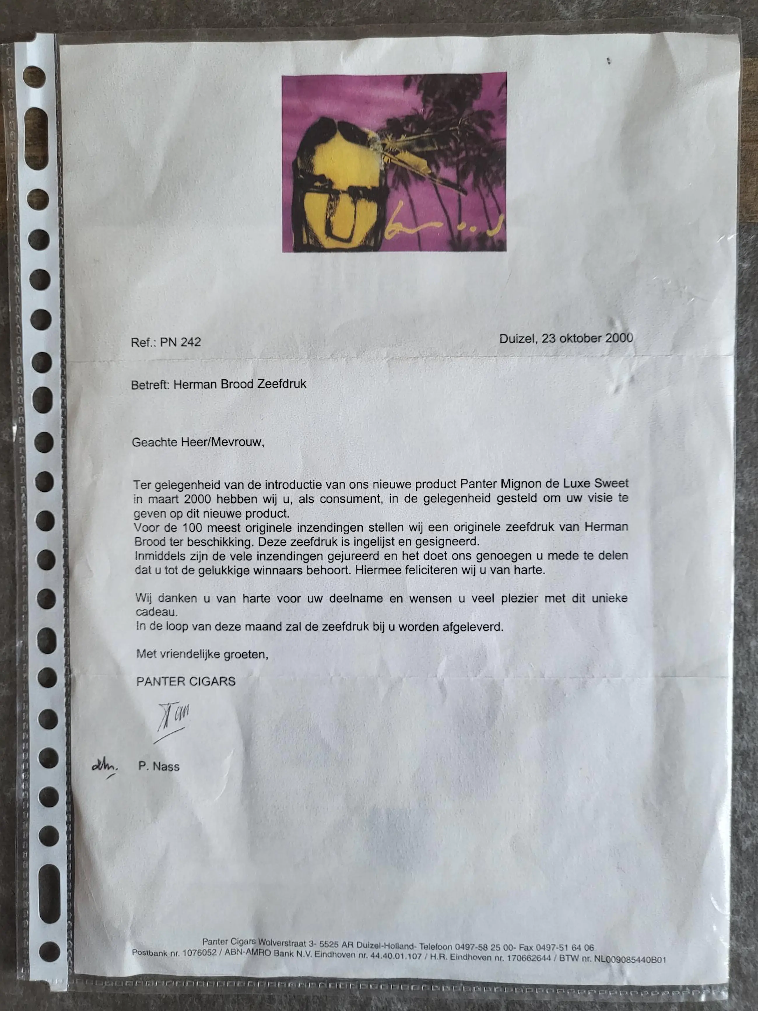 Dit werk heeft Herman gemaakt voor een prijsvraag van Panter Cigars waarbij de 100 meest originele inzendingen deze zeefdruk wonnen. De originele brief aan één van de winnaars is nog aanwezig. De genummerde oplage bestaat dan ook uit 100 exemplaren.