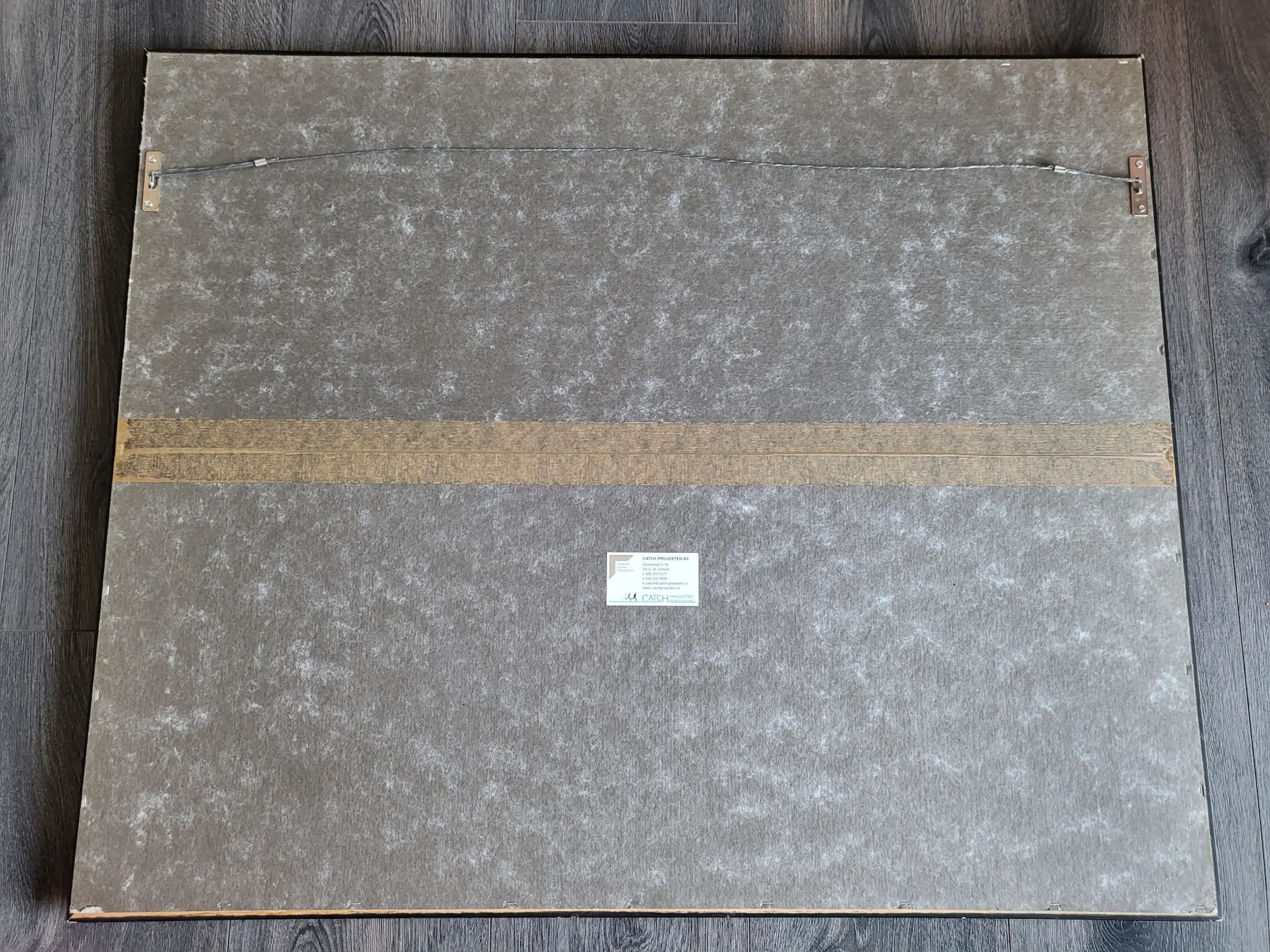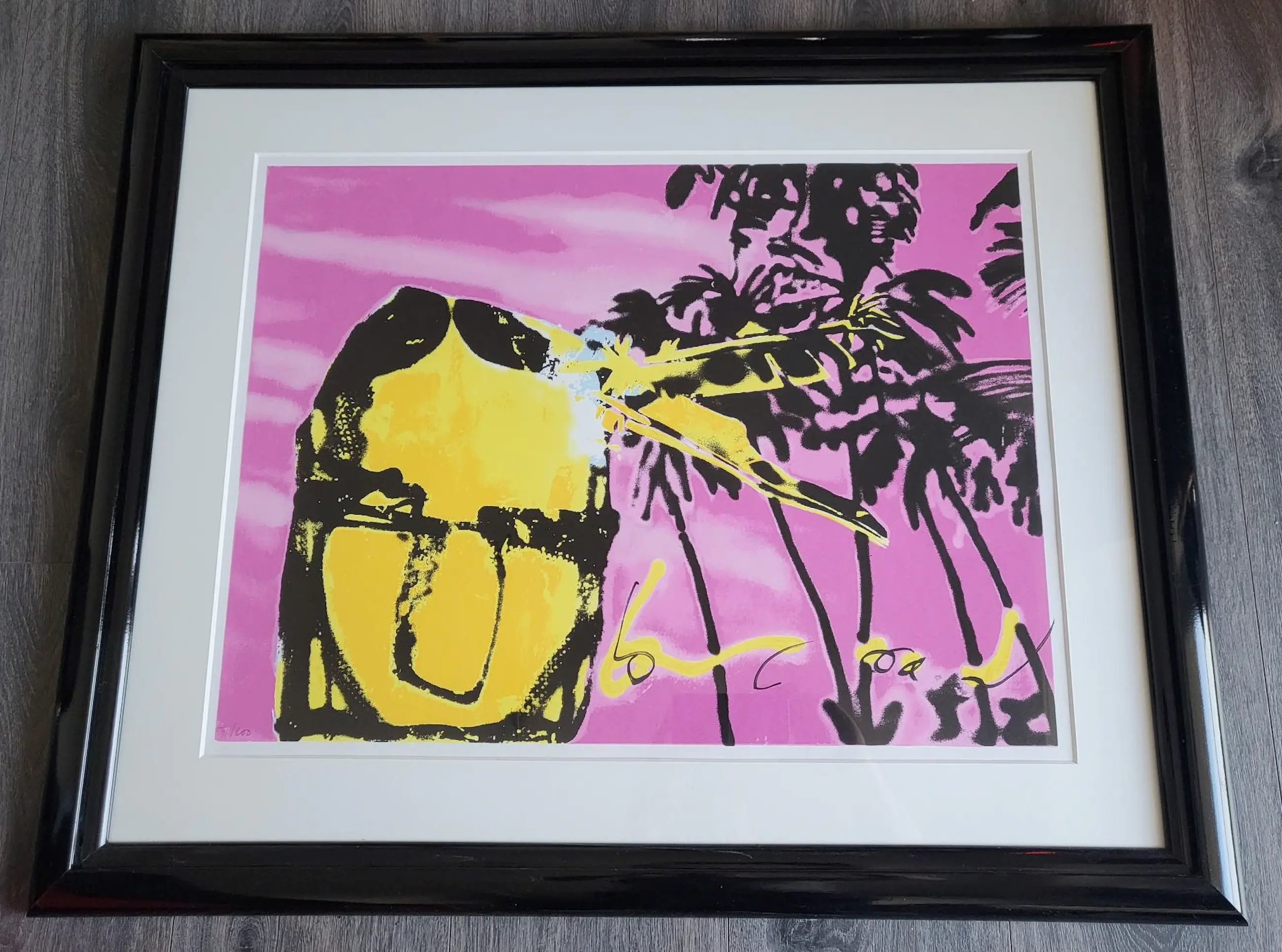 Het werk is uiteraard handgesigneerd met zwarte marker en fraai ingelijst in een zwarte houten lijst met passe partout.