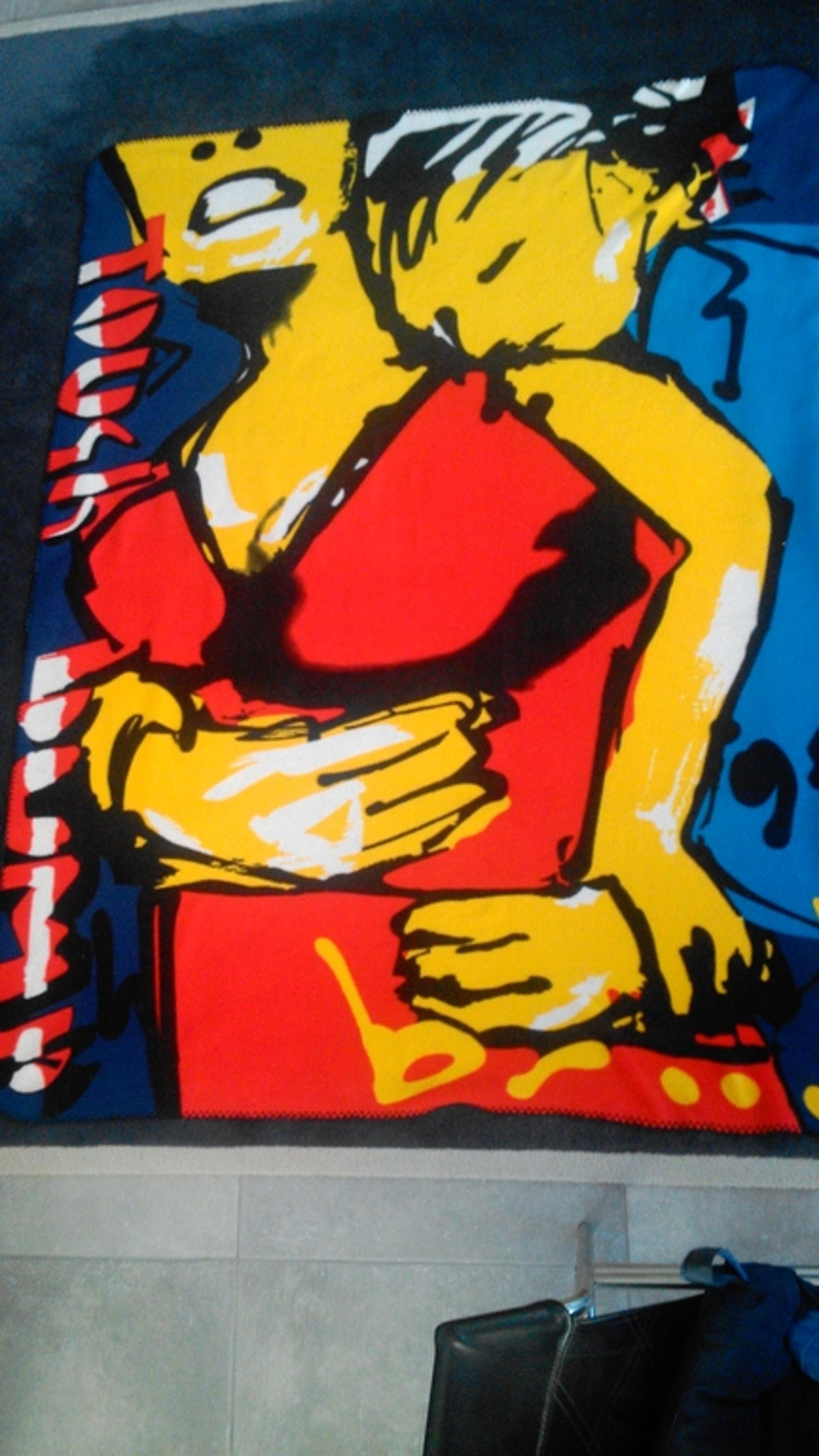 Fleece plaid 160 x 120 cm karakteristiek Herman Brood met handtekening en jaartal en titel: Tough Bump