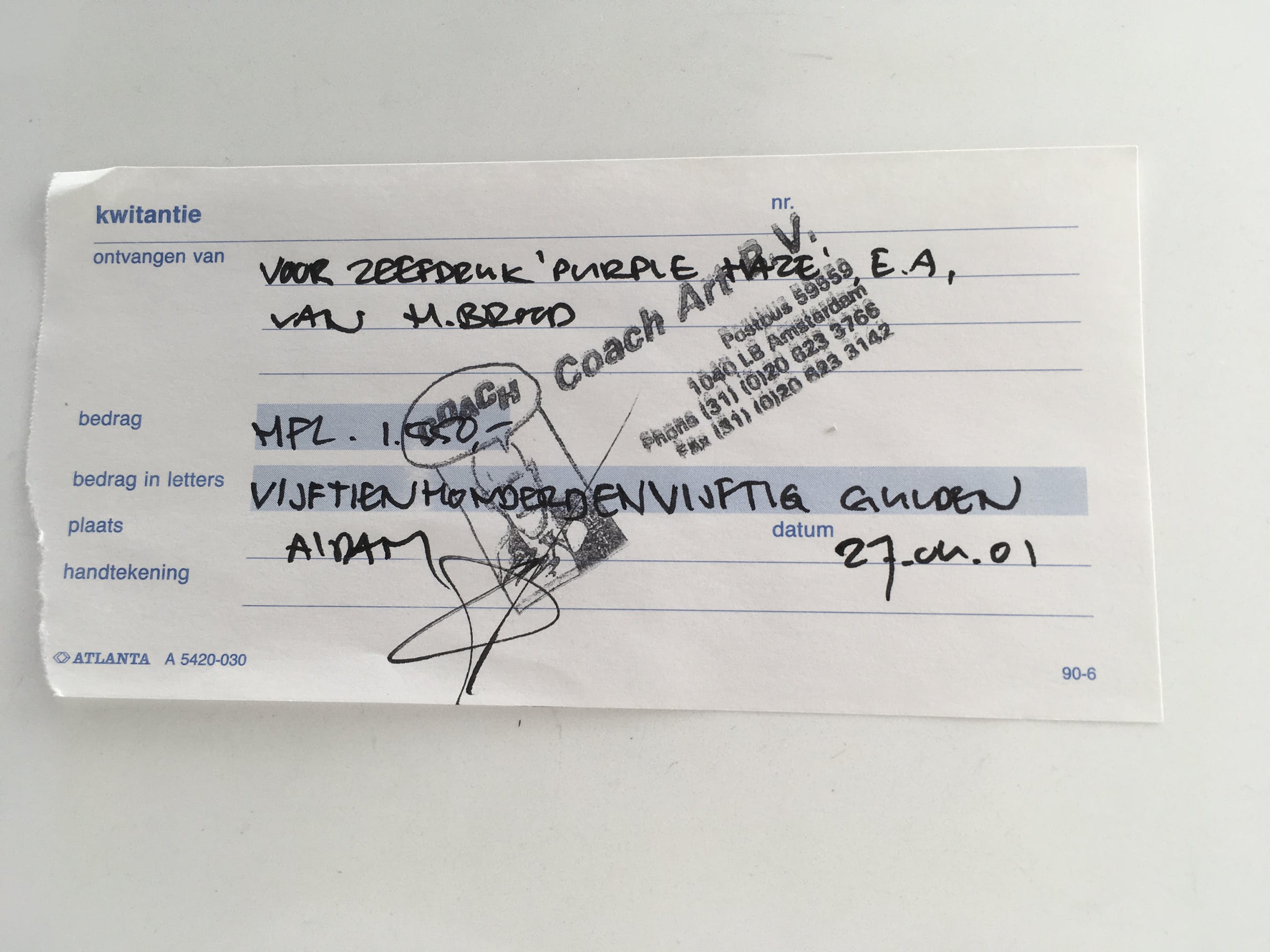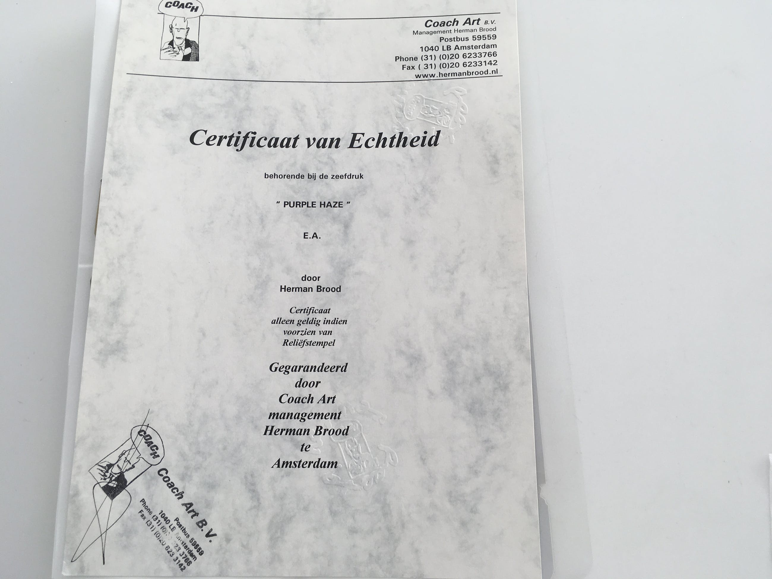 De gesigneerde en ingelijste zeefdruk “Purple Haze” van Herman Brood wordt geleverd met het certificaat van echtheid. De zeefdruk is aangekocht bij Coach Art in de Spuistraat te Amsterdam in april 2001. Dit was voor het overlijden van Herman Brood.