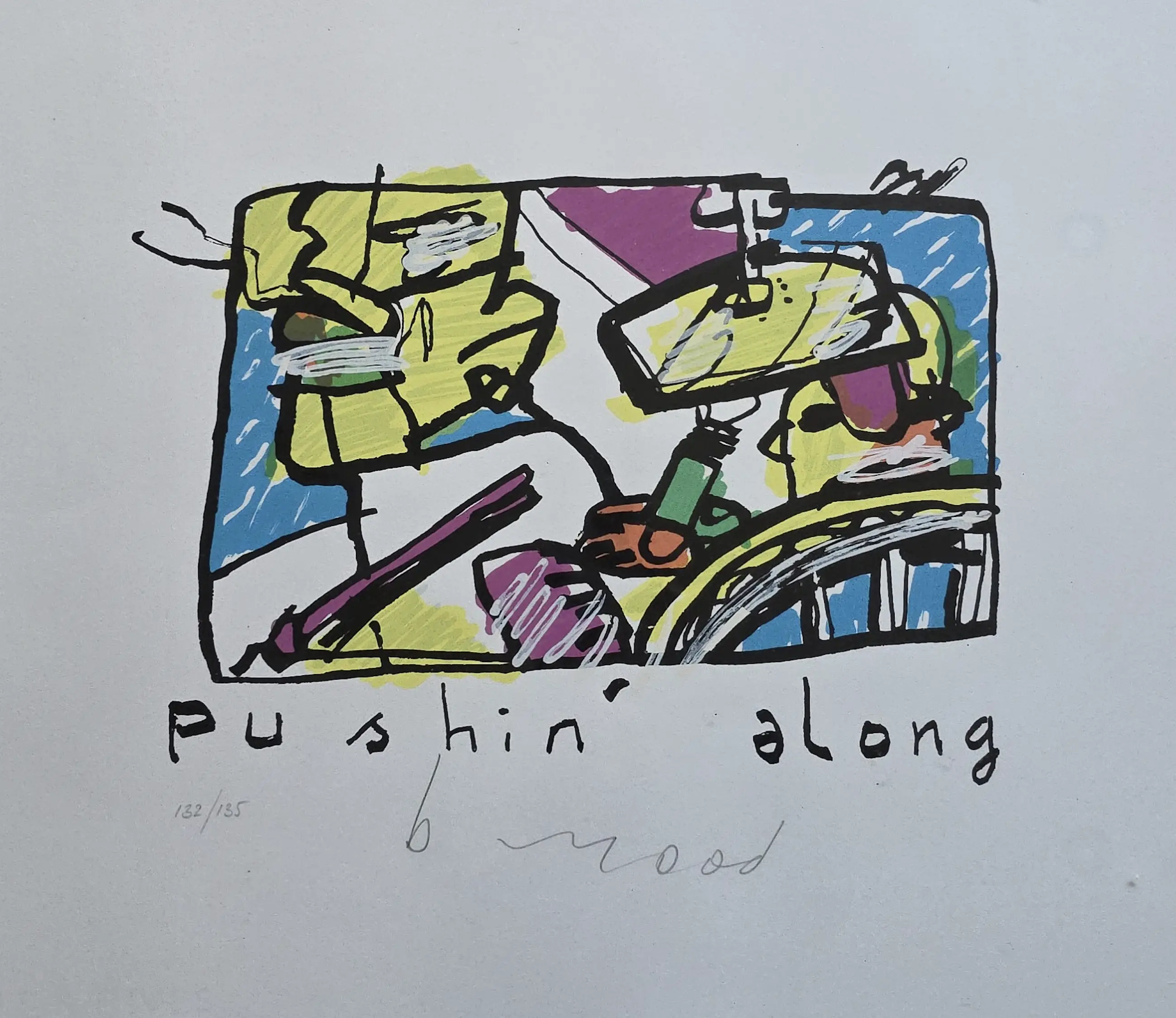Ingelijste zeefdruk van Herman Brood met de titel "Pushing Along"