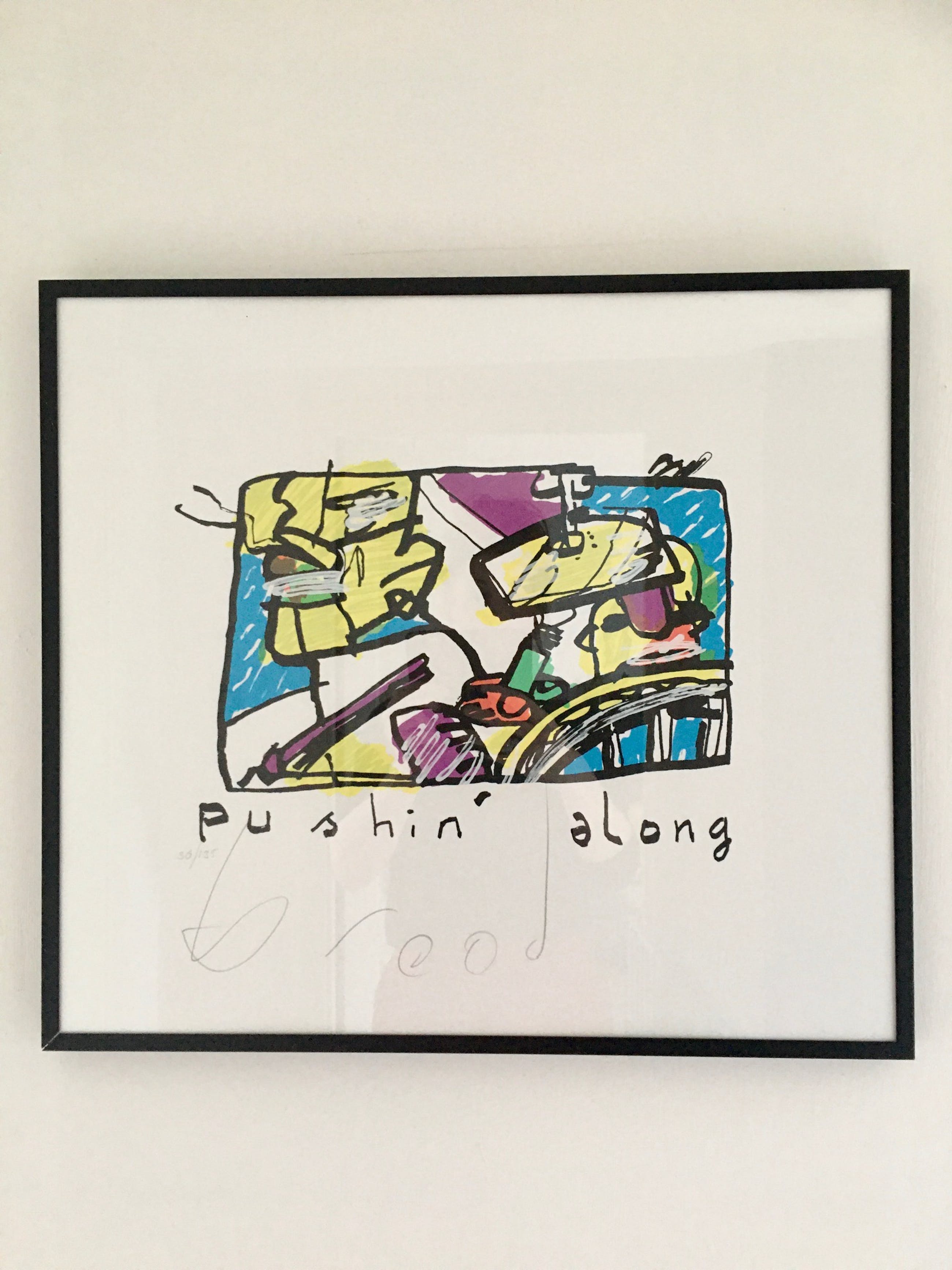 Originele zeefdruk van Hermand Brood, in strakke lijst met zwarte, metalen rand met glas.