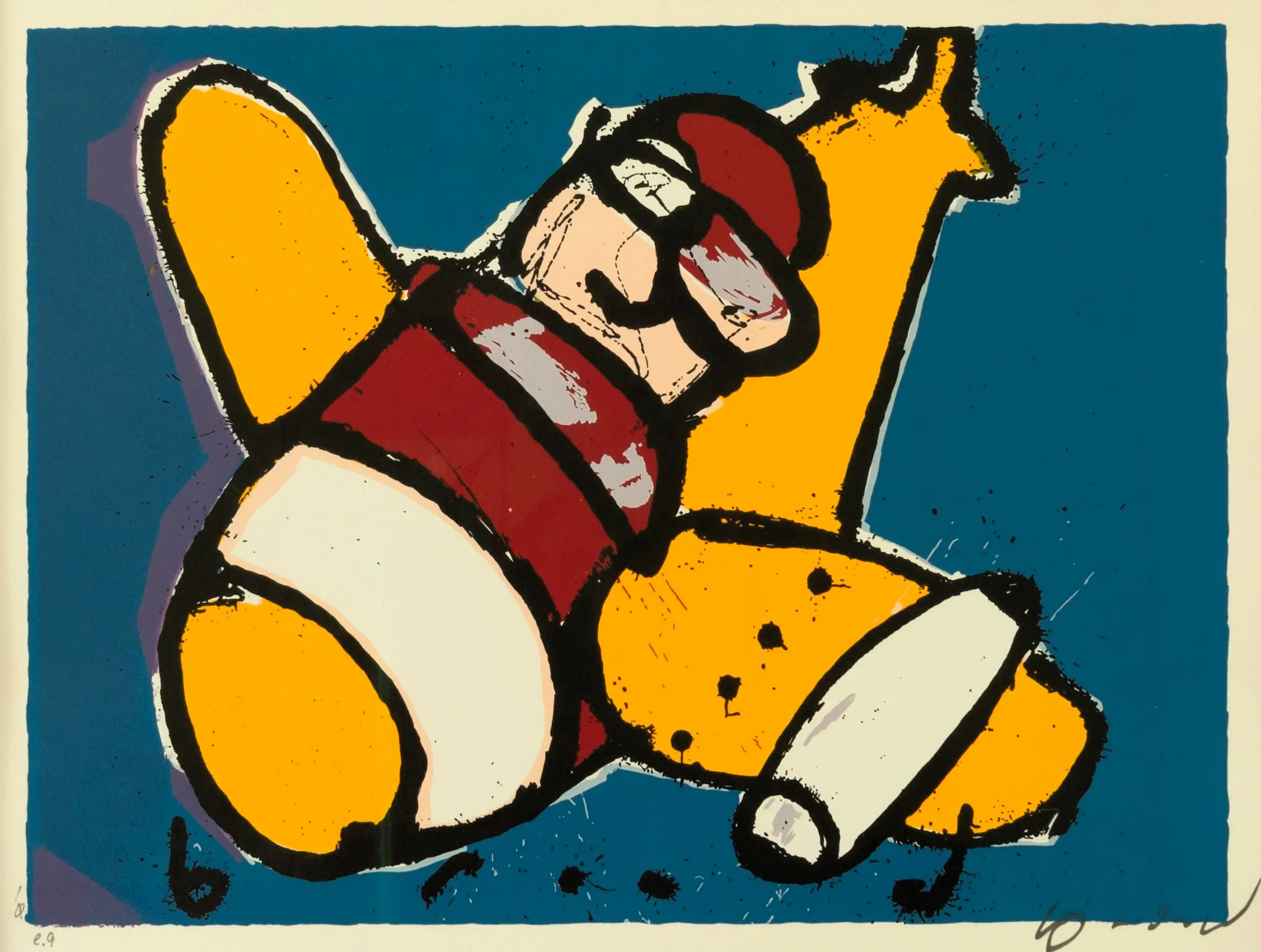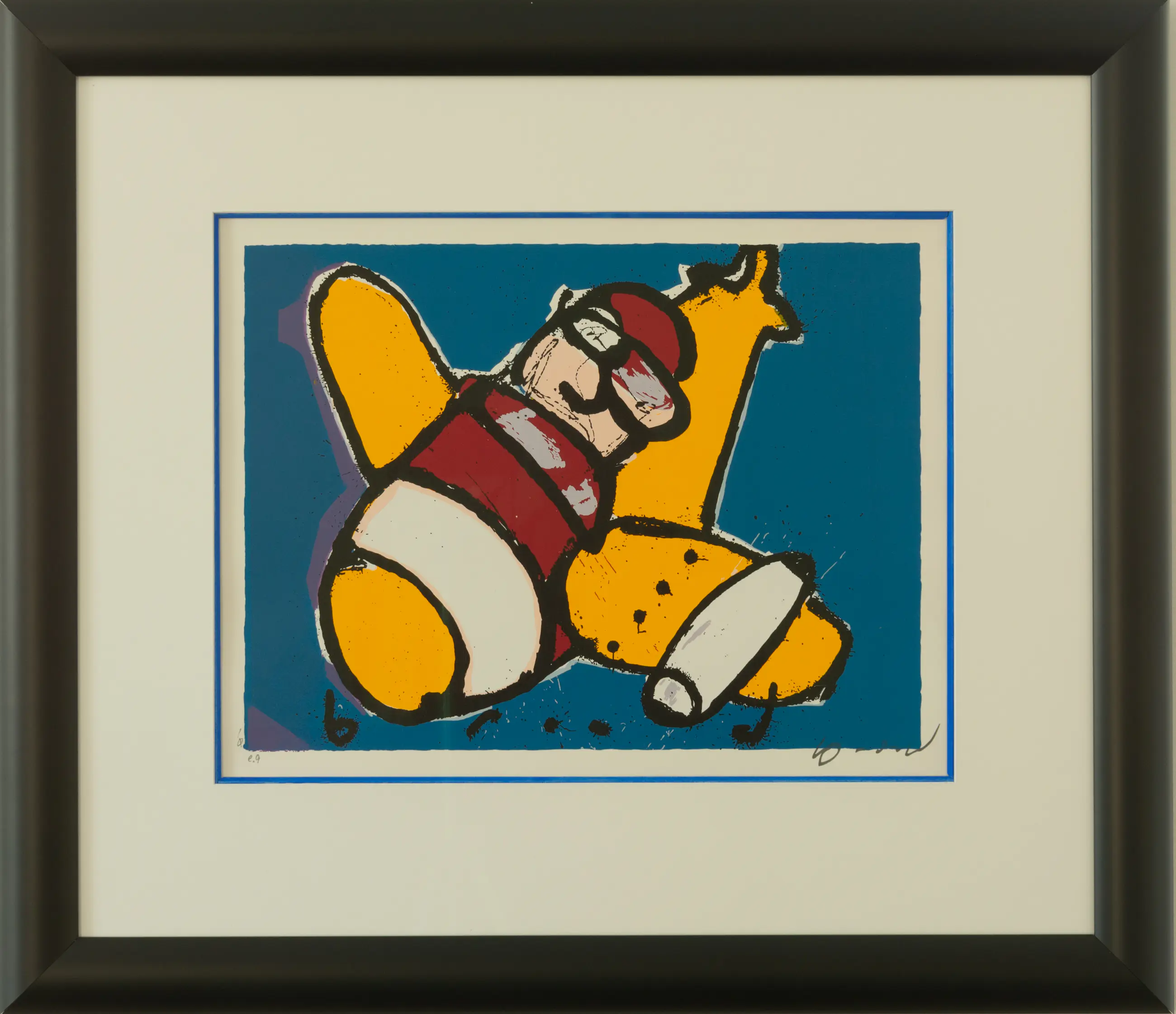 Bekende zeefdruk van Herman Brood, fraai conserverend ingelijst met o.a. museumglas. Het betreft een e/a (Epreuve d 'artiste). Met bijschrift : I.Q , aangevende dat de zeefdruk destijds door Herman Brood is uitgegeven in samenwerking met I.Q. Kunstuitleen in Amersfoort.