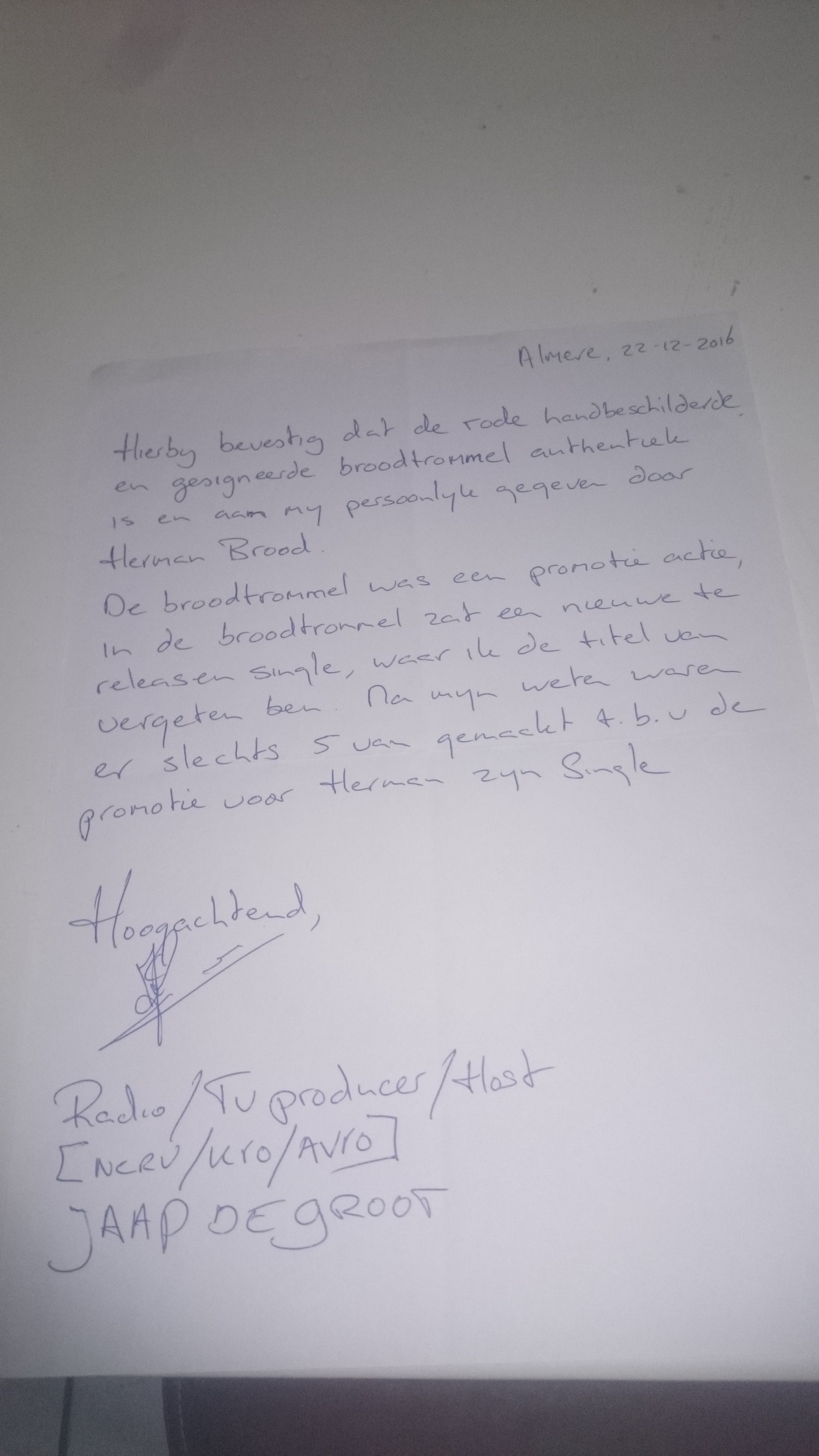 Een rode handbeschilderde en gesigneerde broodtrommel door Herman Brood. De broodtrommel was een promotie actie vanwege een release van een nieuwe single.Deze broodtrommels zijn in beperkte oplage door Herman Brood gemaakt. Dit aparte kunstwerk Is voorzien van Echtheidsverklaring producent.