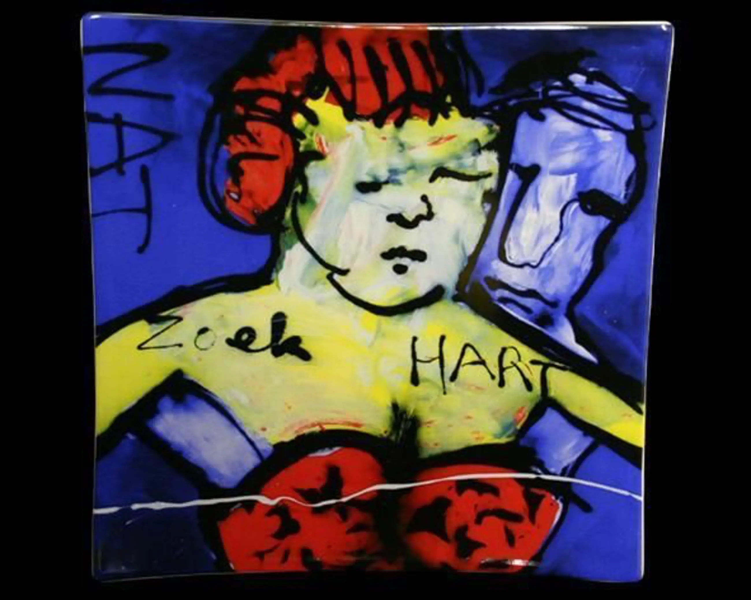 Schaal/wandbord "Zoek Hart" uit 1998 naar een werk van Herman Brood is vervaardigd door Schoonhoven Keramiek.