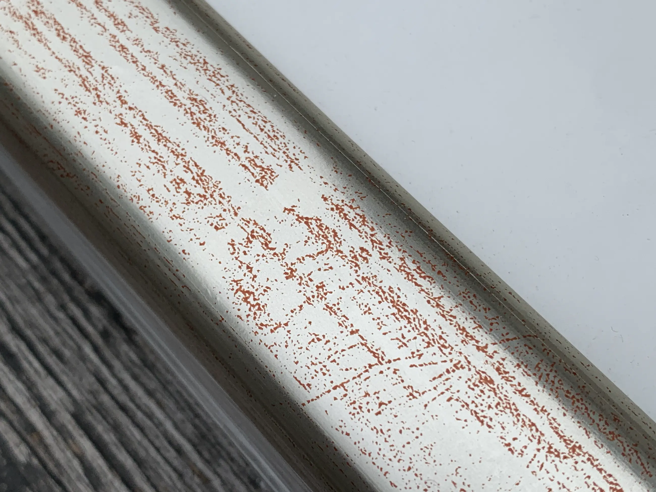 De zeefdruk is ingelijst met passe partout, met ontspiegeld glas. De lijst is zilverkleurig met een koperkleurig patin en ziet er nog perfect uit.