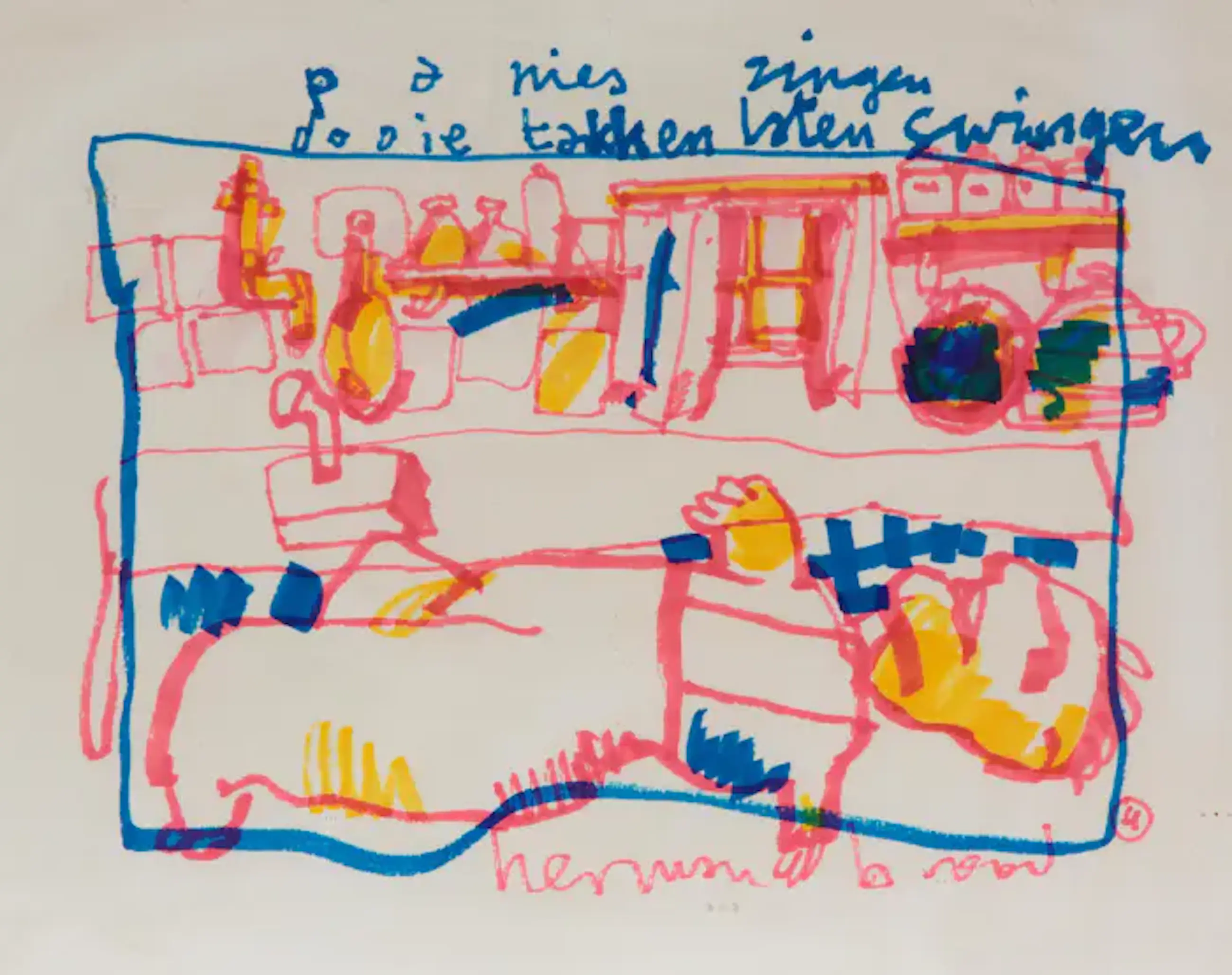 Prachtige stifttekening in zeer goede staat van Herman Brood. Titel: Pa nies zingen, dooie takken laten swingen. Afmetingen voorstelling: H23 x b31 cm. U krijgt een certificaat bij dit werk.