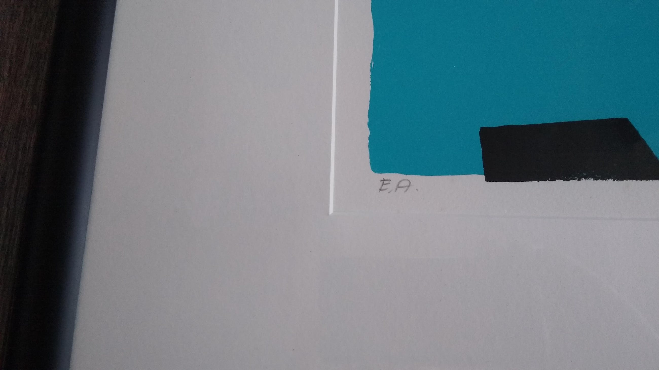 Met marker gesigneerd en netjes ingelijst in een zwarte metalen kader met passe partout.