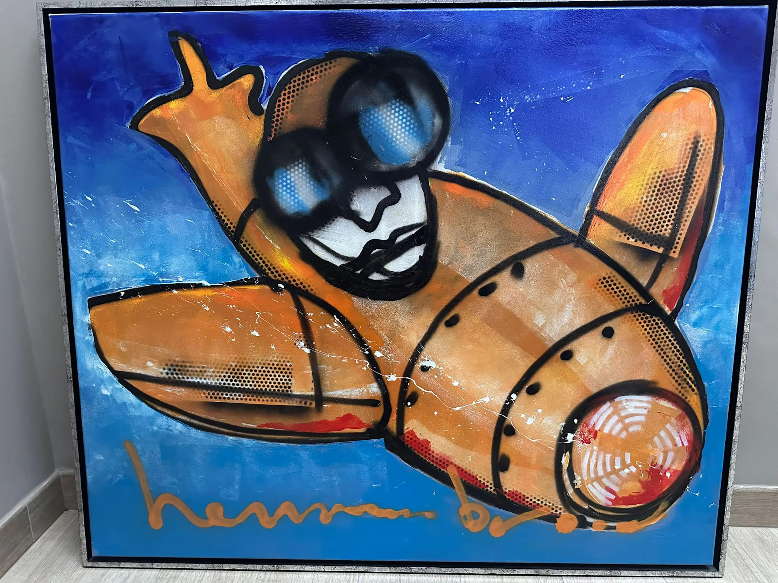 Touch Down is een expressief werk van Herman Brood waarin beweging, energie en kracht centraal staan. De voorstelling is uitgevoerd met snelle, krachtige lijnen en felle, contrasterende kleuren, kenmerkend voor Broods directe en ongeremde stijl. De figuren en vormen zijn schetsmatig weergegeven, waardoor het gevoel en de actie belangrijker zijn dan detail. Het werk straalt dynamiek en spontaniteit uit en past perfect binnen Broods oeuvre, waarin vrijheid, adrenaline en het leven op volle snelheid terugkerende thema’s zijn.