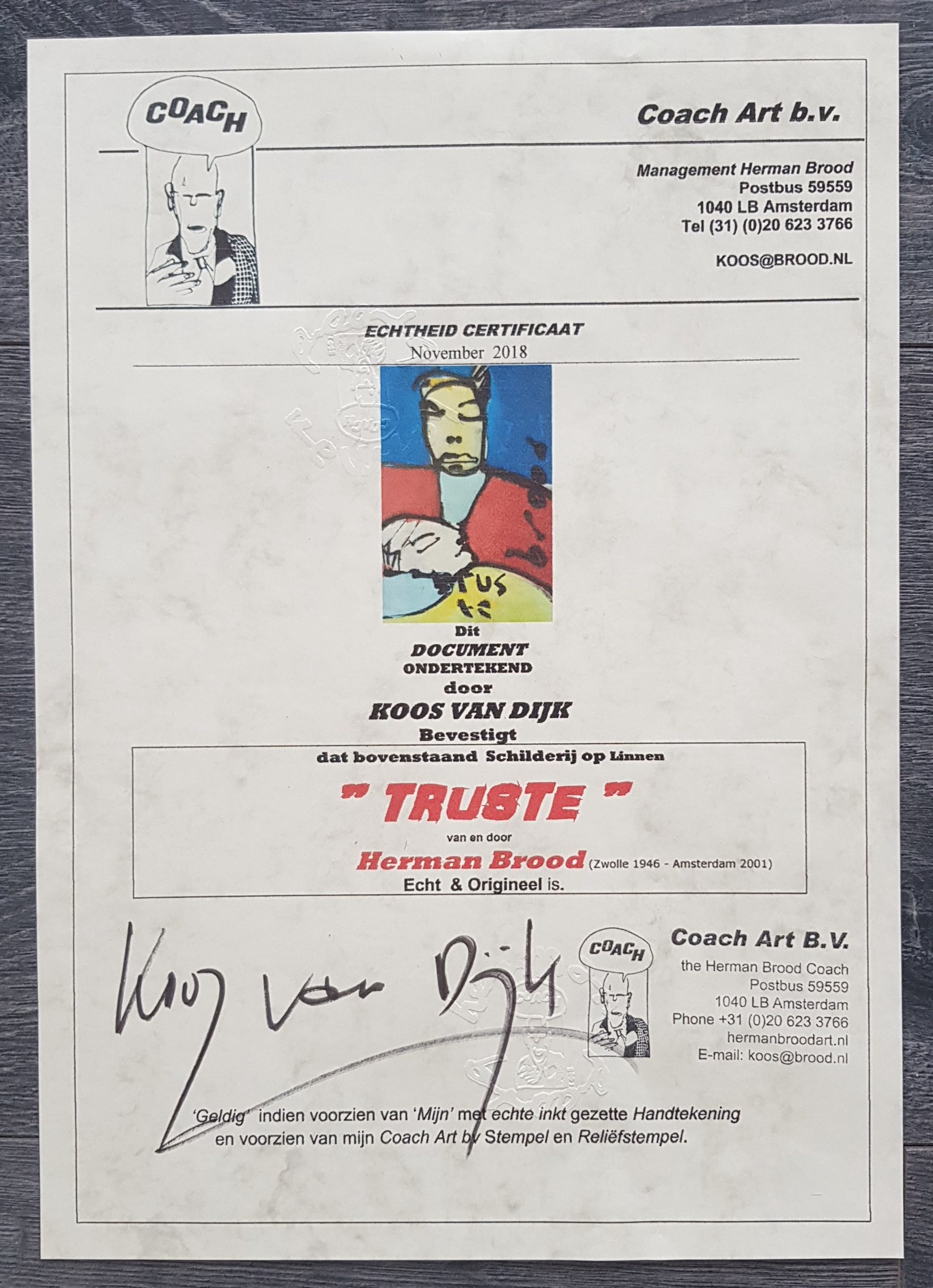 Inclusief certificaat en taxatierapport van Coach Art en fraaie handgemaakte houten baklijst van 131 x 91 cm. Deze lijst kunt u in de gewenste kleur aflakken zodat het een passend geheel wordt in uw huis of kantoor.