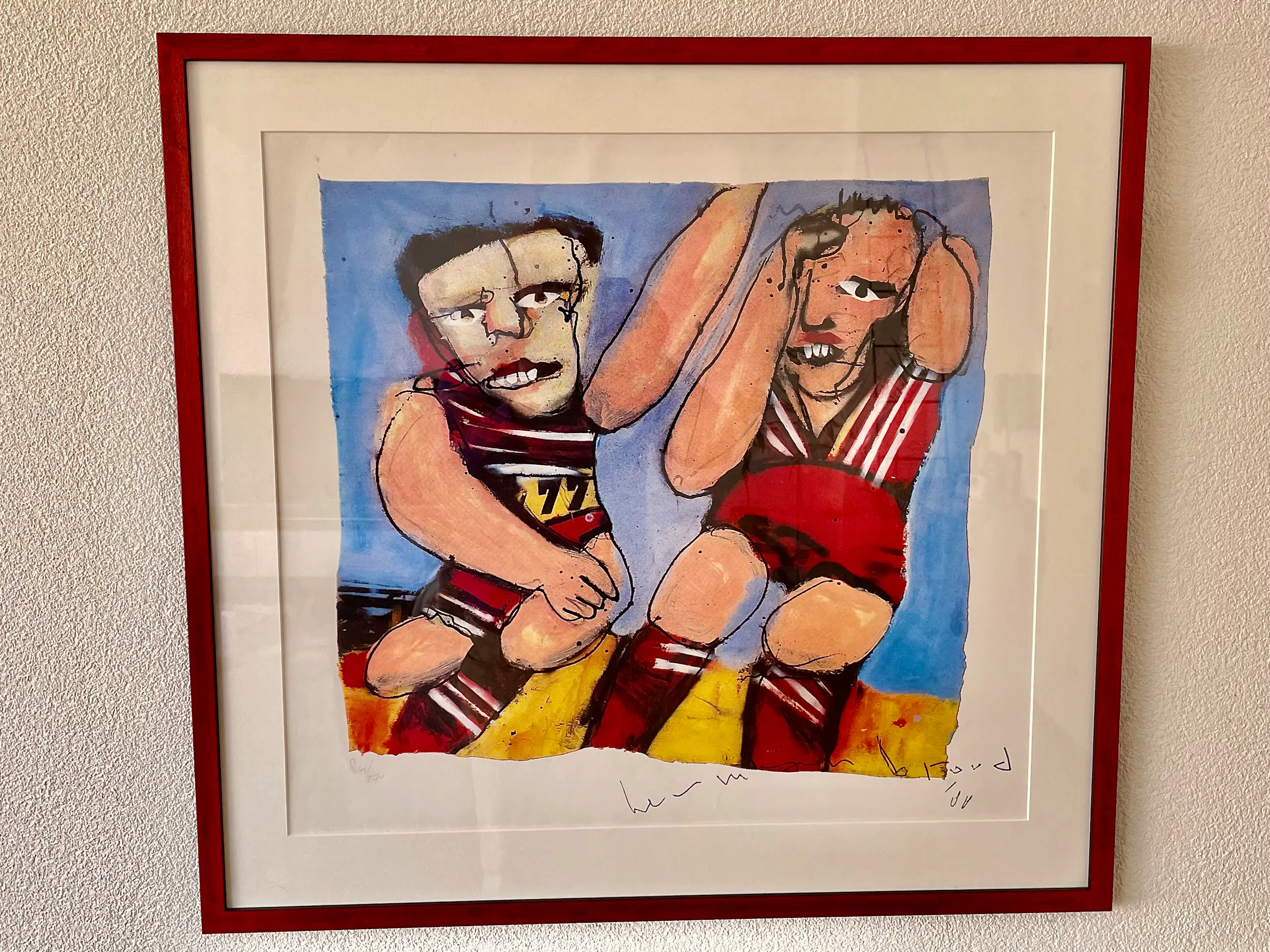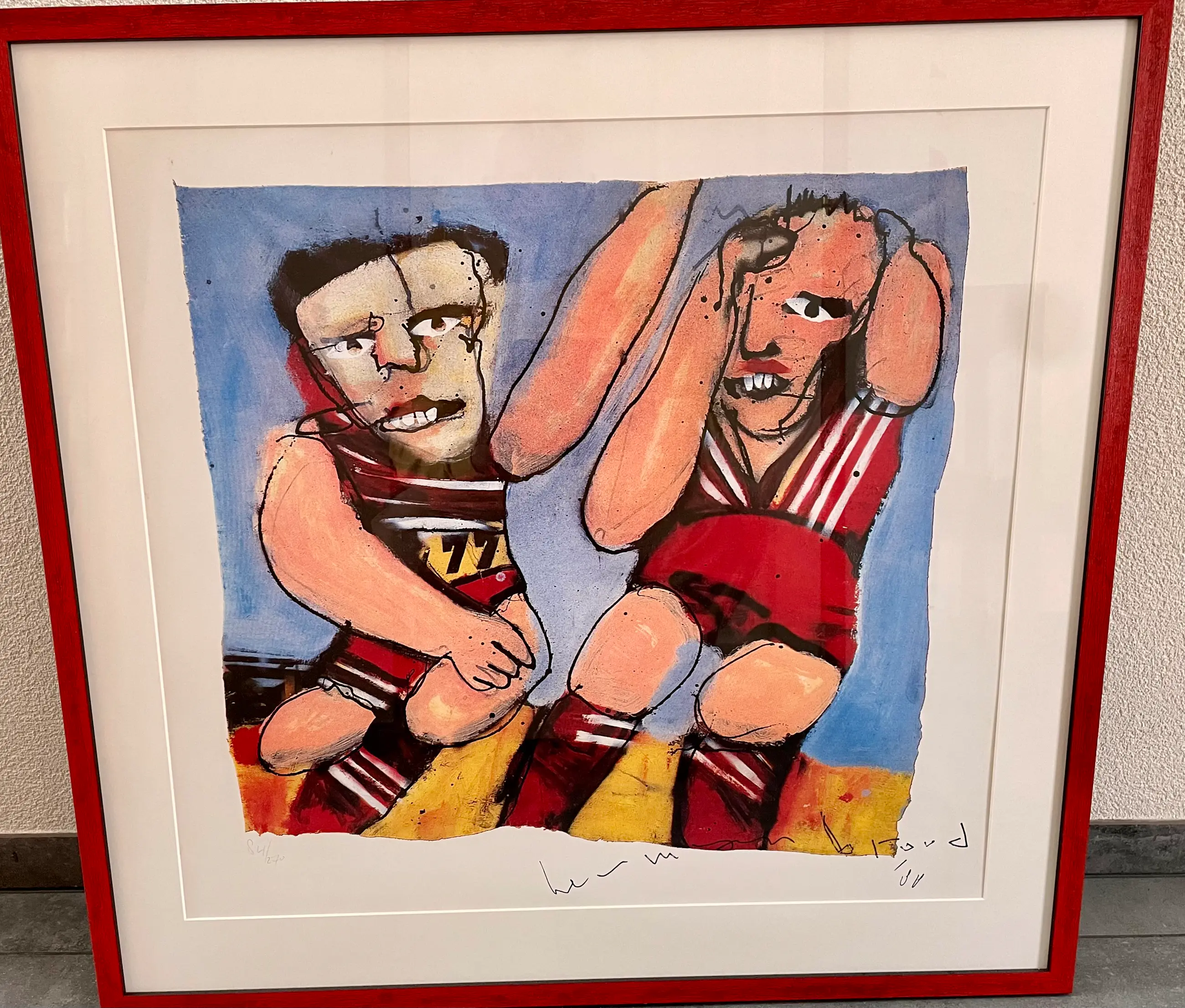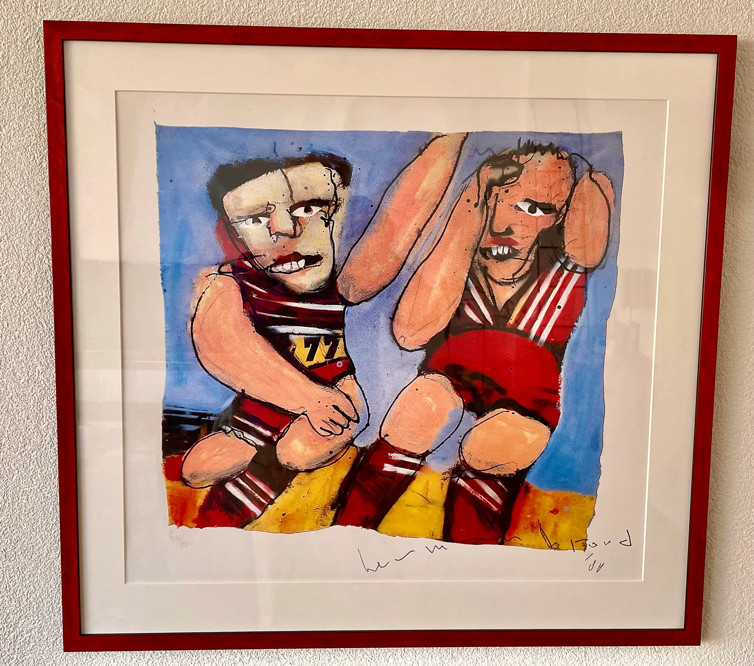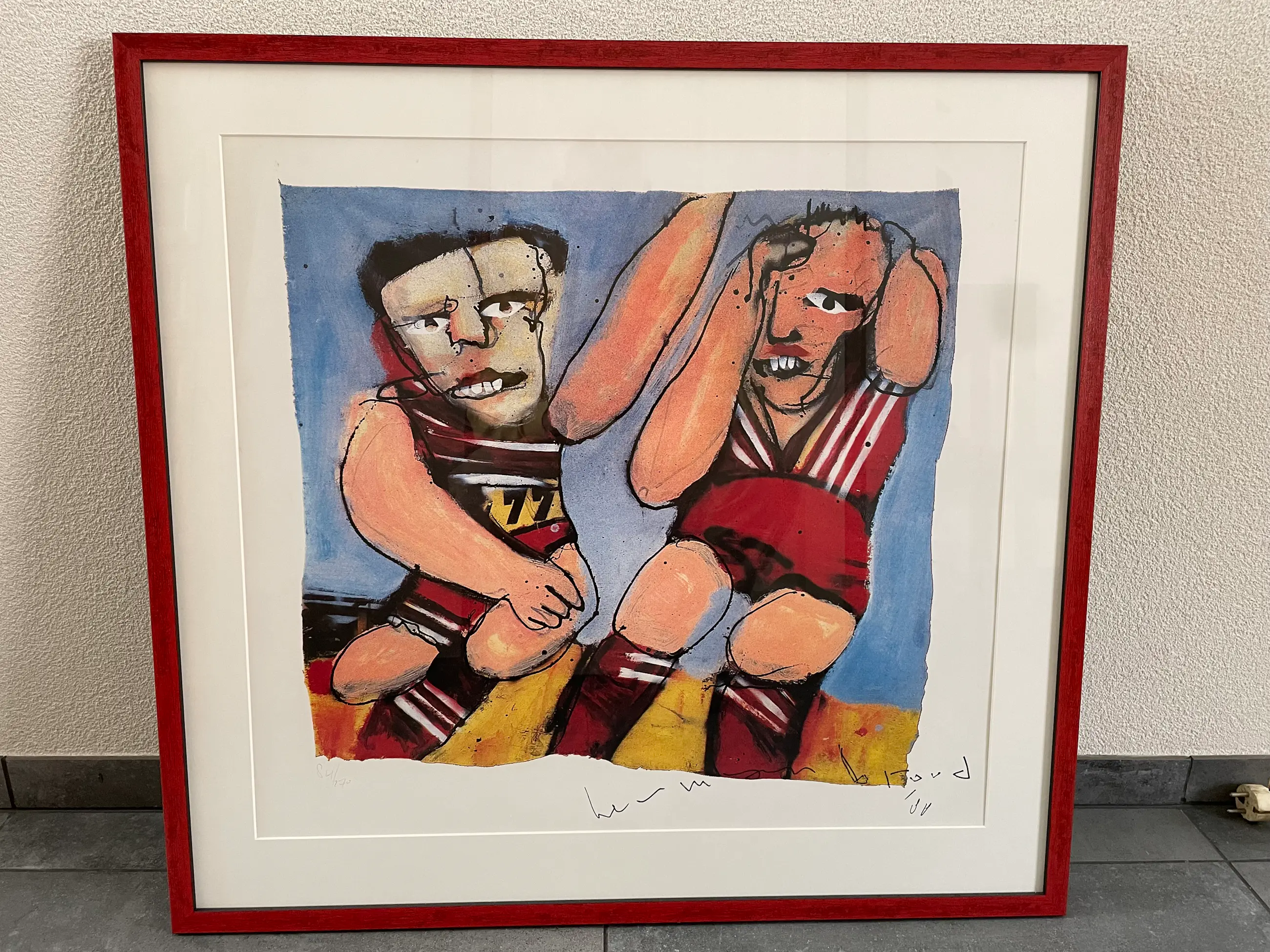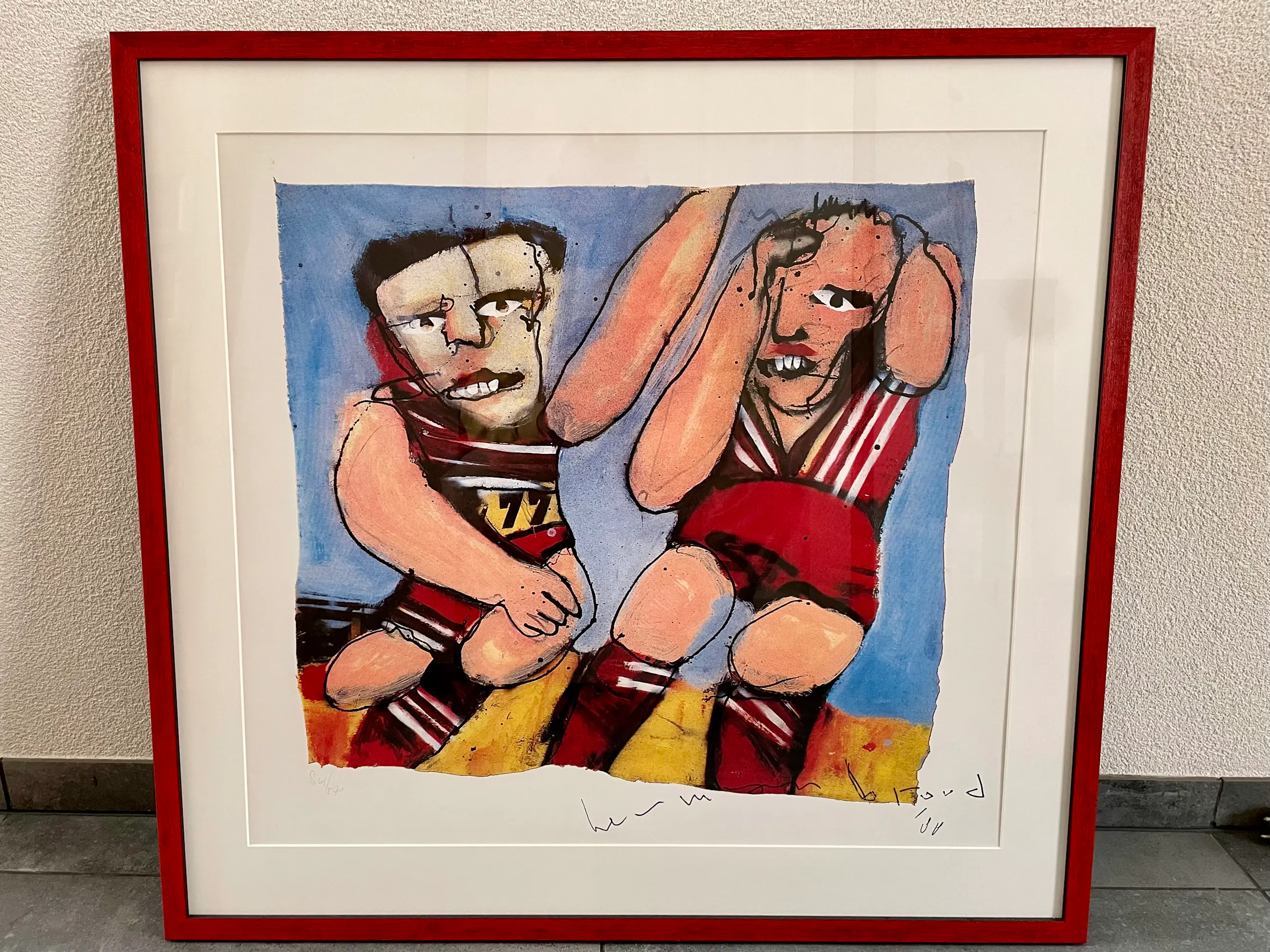 Fraai werk van Herman Brood - De Voetballers - Dit werk is geheel nieuw ingelijst door lijstenmakerij Daleman uit Leiden. Het werk is dus in feite nagenoeg in nieuw staat.