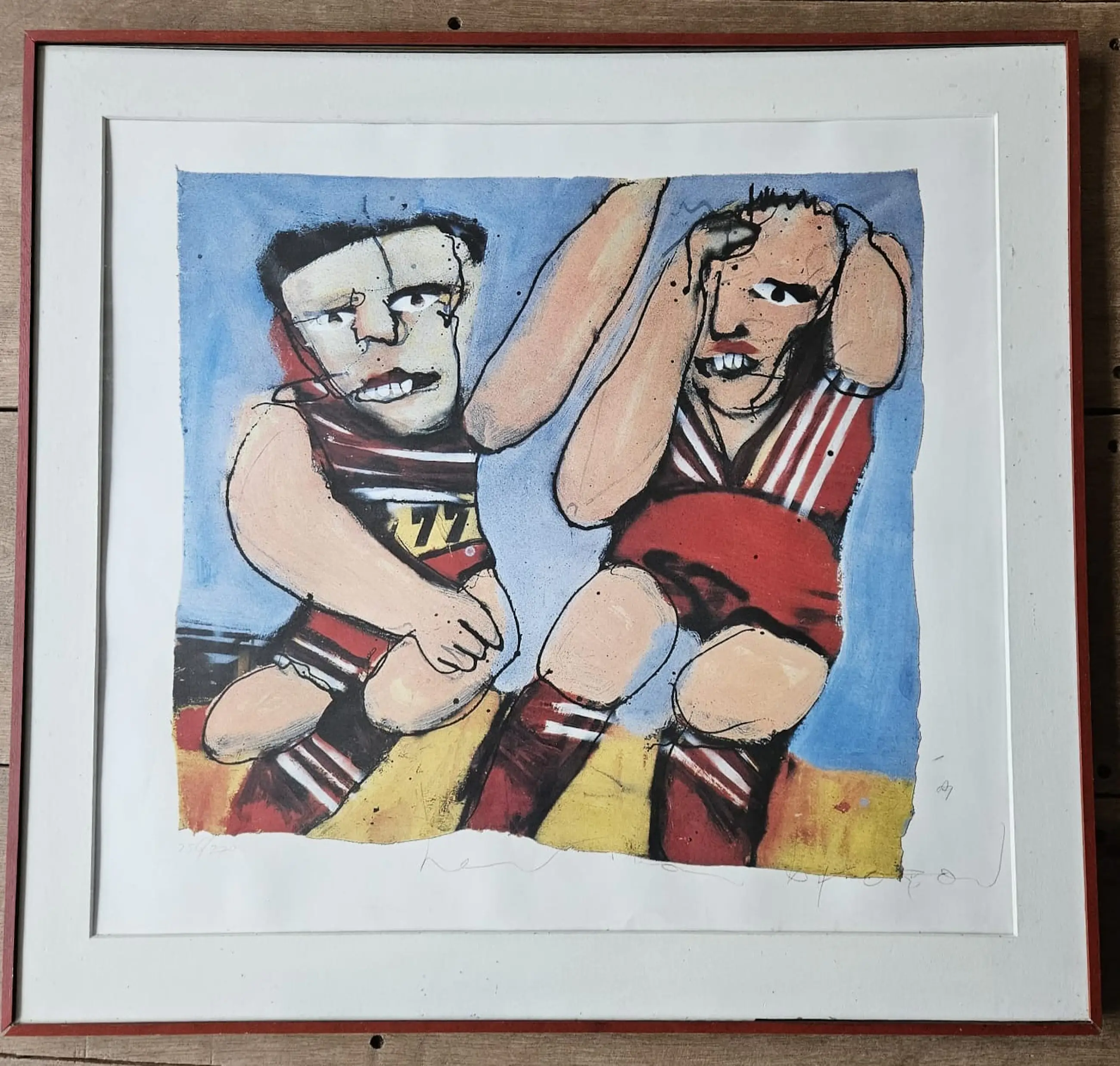 Te koop: prachtig werk van Herman Brood – De Voetballers Originele zeefdruk, genummerd 256 van 270. Een krachtig en karakteristiek werk van deze iconische Nederlandse kunstenaar, geliefd om zijn expressieve stijl en verzamelwaarde. Het werk dient opnieuw ingelijst te worden, maar verkeert verder in goede staat. Een mooie kans voor de echte Brood-liefhebber of kunstverzamelaar.