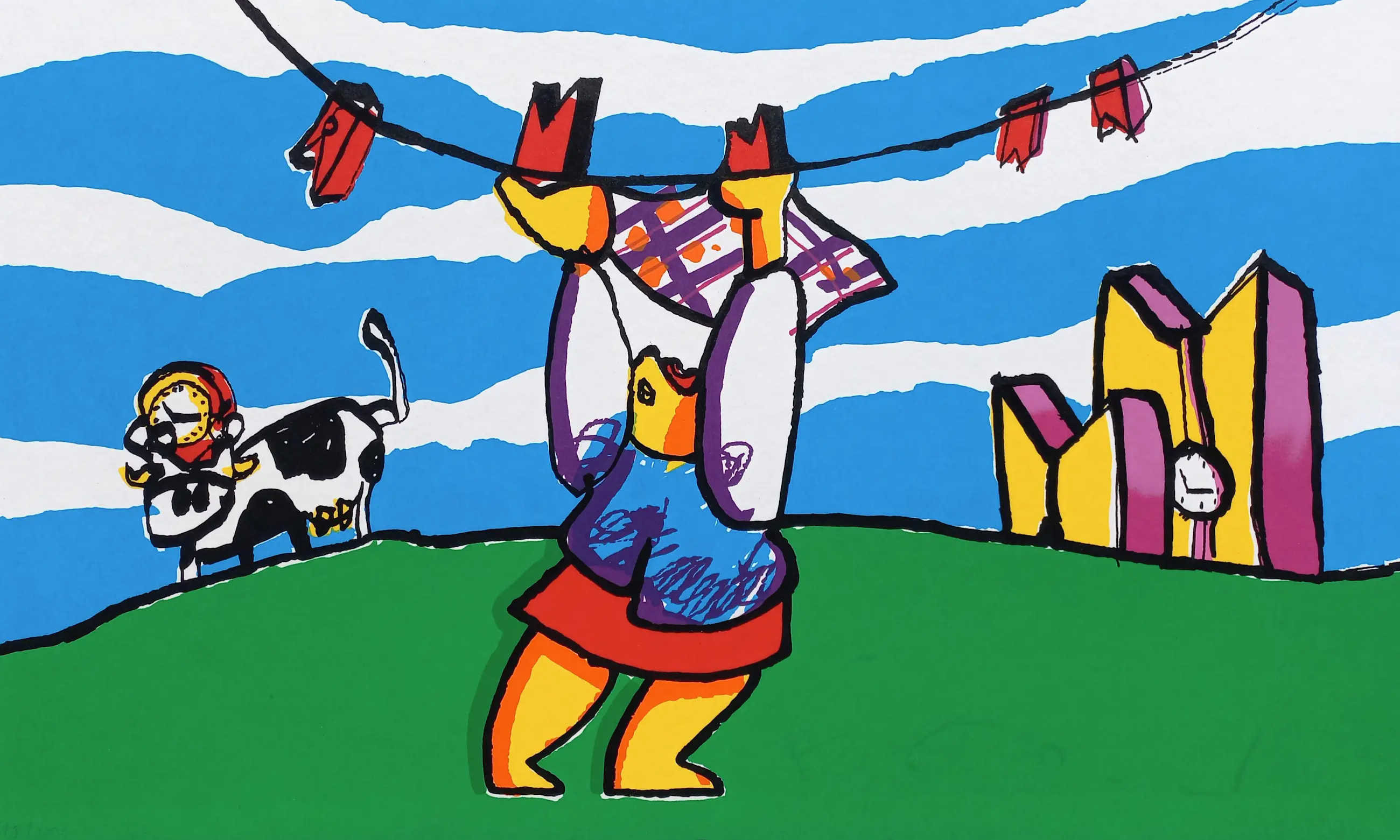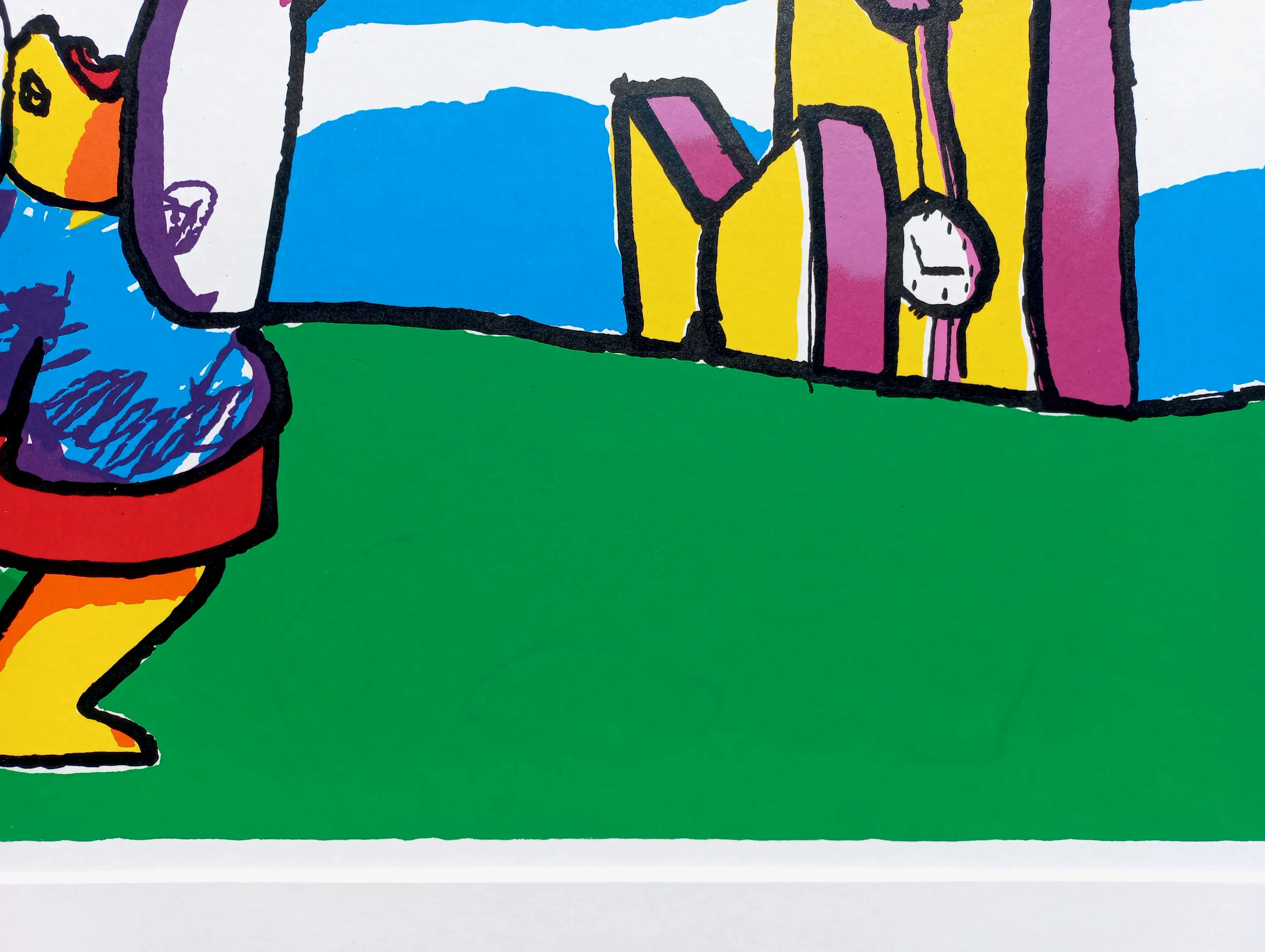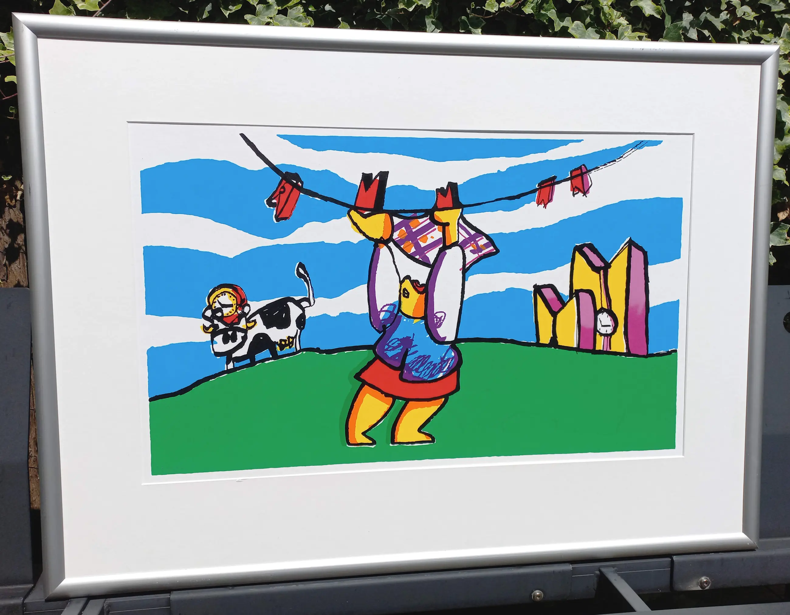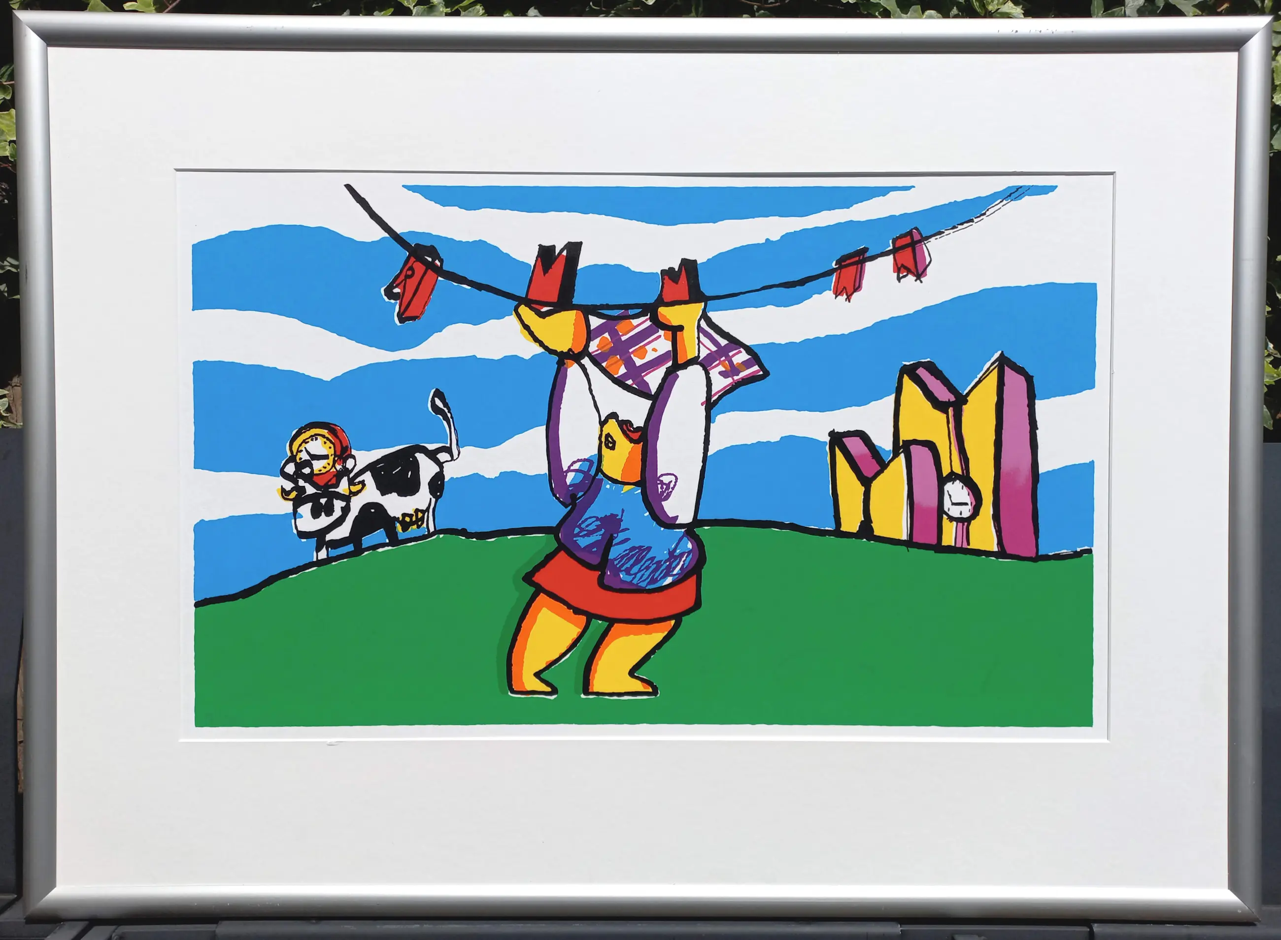 Karakteristiek en bekend werk van Herman Brood. Zeefdruk op geschept papier, met stift gesigneerd rechtsonder (vervaagd met de tijd) en met potlood genummerd (79/150). In strakke aluminium lijst, achter museumglas en met zuurvrij passe-partout. Alles in zeer goede conditie. Herkomst: Business Art Service.