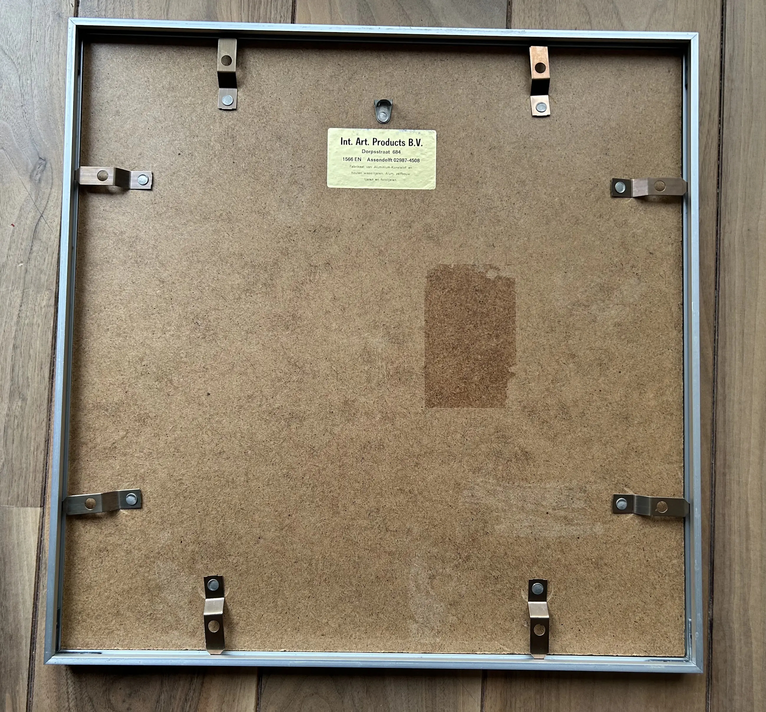 In aluminium lijst met passe partout achter glas, gesigneerd in de druk. Totale formaat 51 x 51 cm.