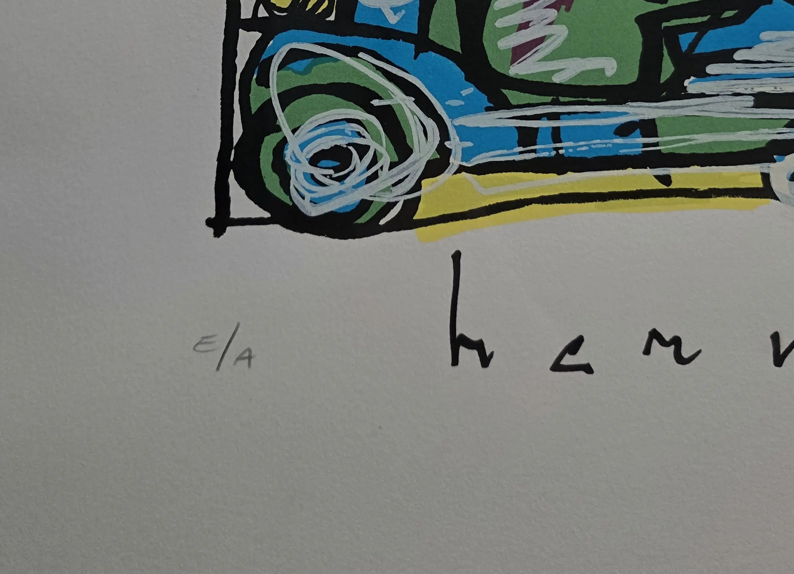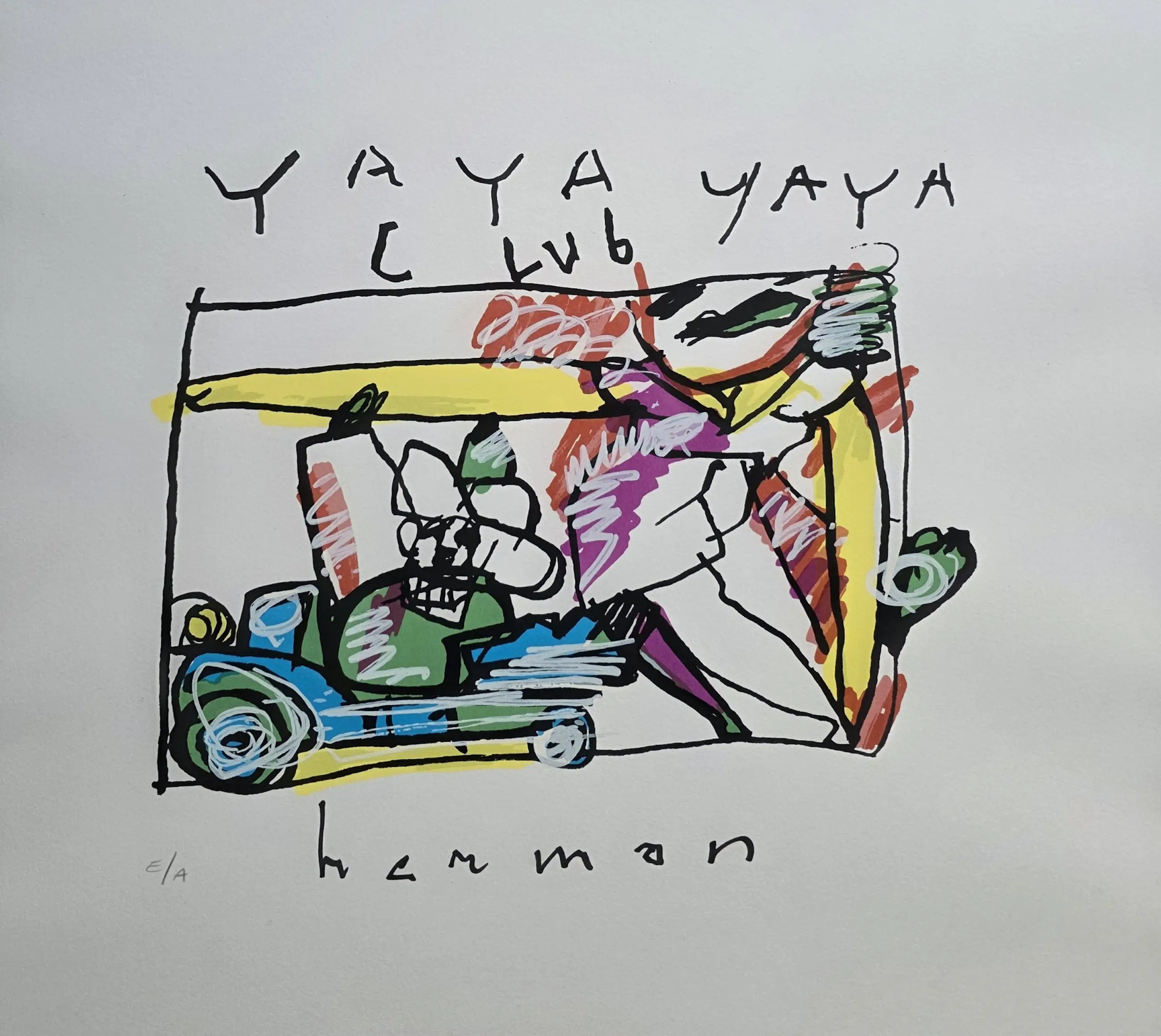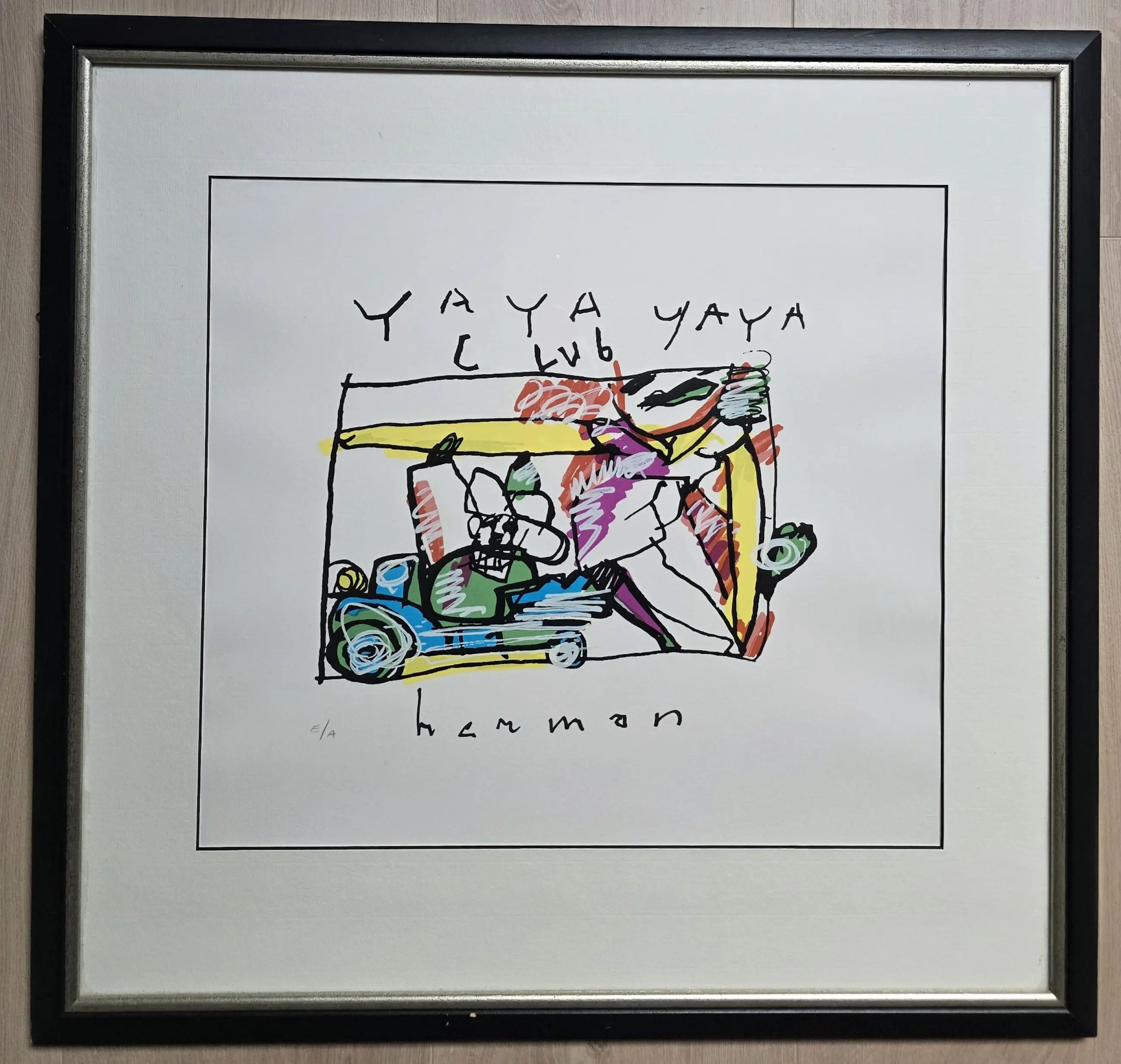 Titel: YaYa Signatuur: handgesigneerd met marker (Herman, wat uitzonderlijk is en uniek) Techniek: zeefdruk op papier Afmeting beeld: circa 36 x 40 cm. Afmeting lijst: 67 x 70 cm. Reden verkoop: inkrimping privécollectie